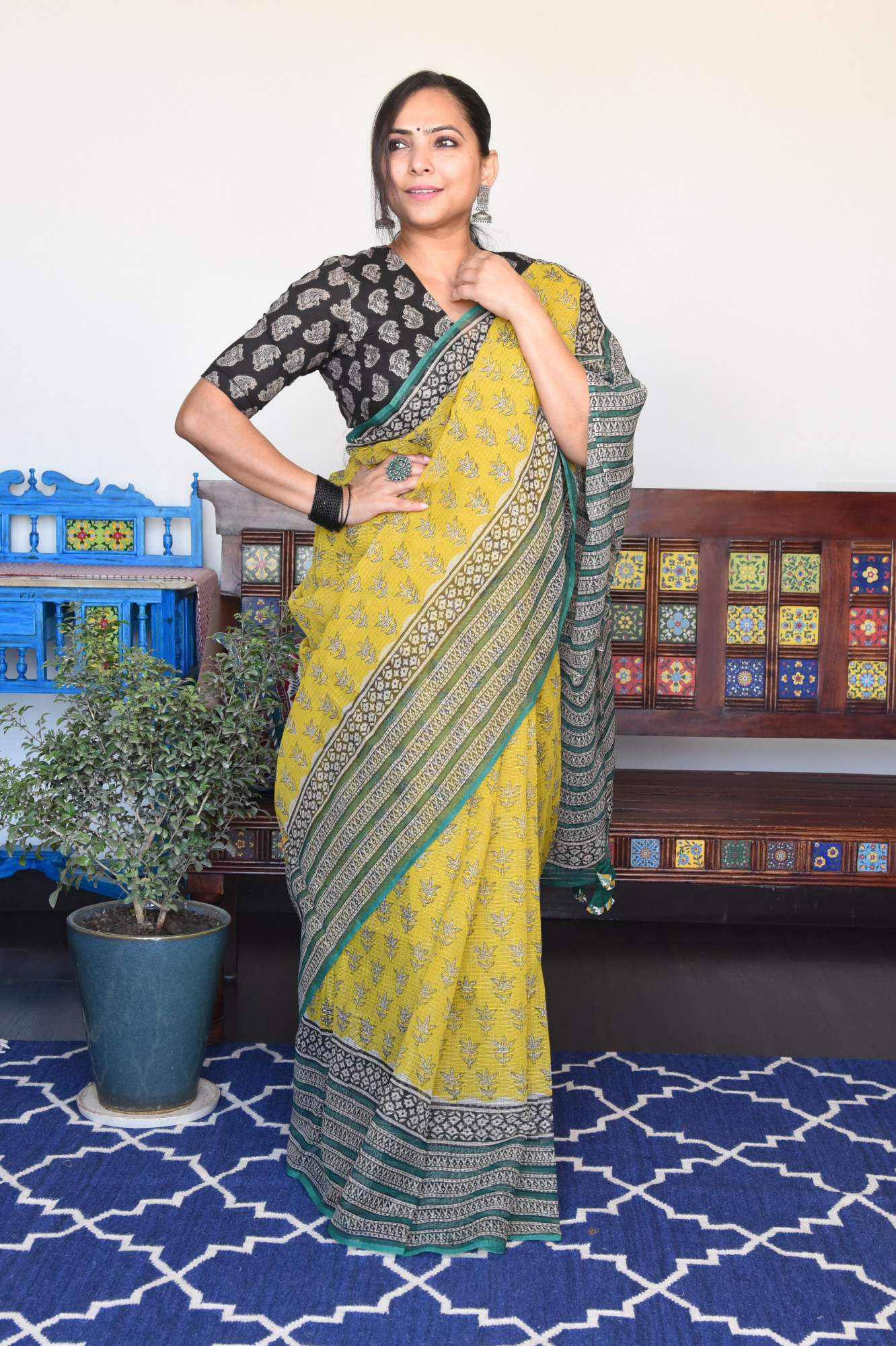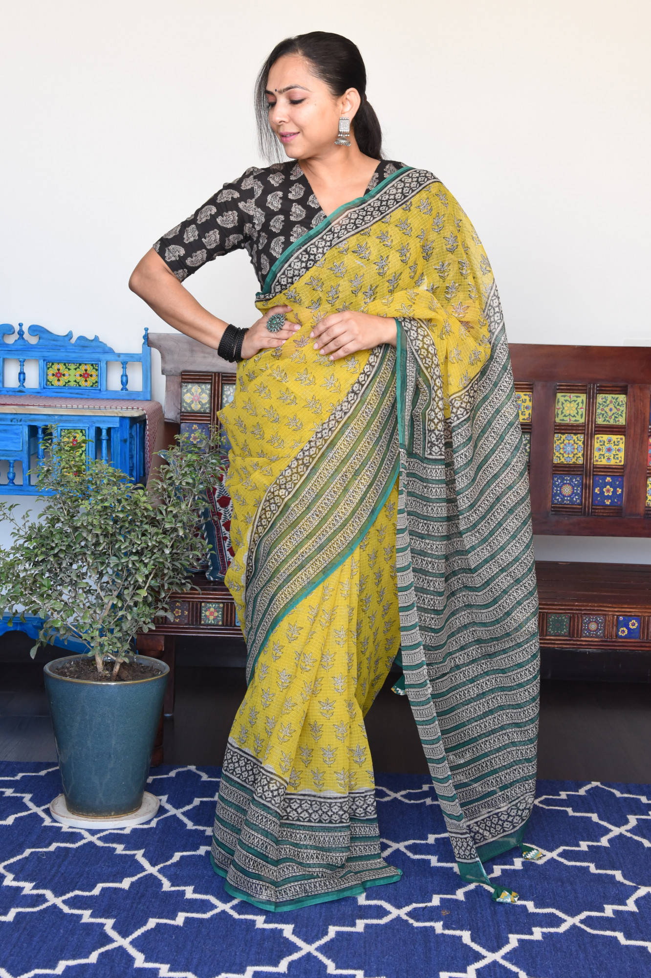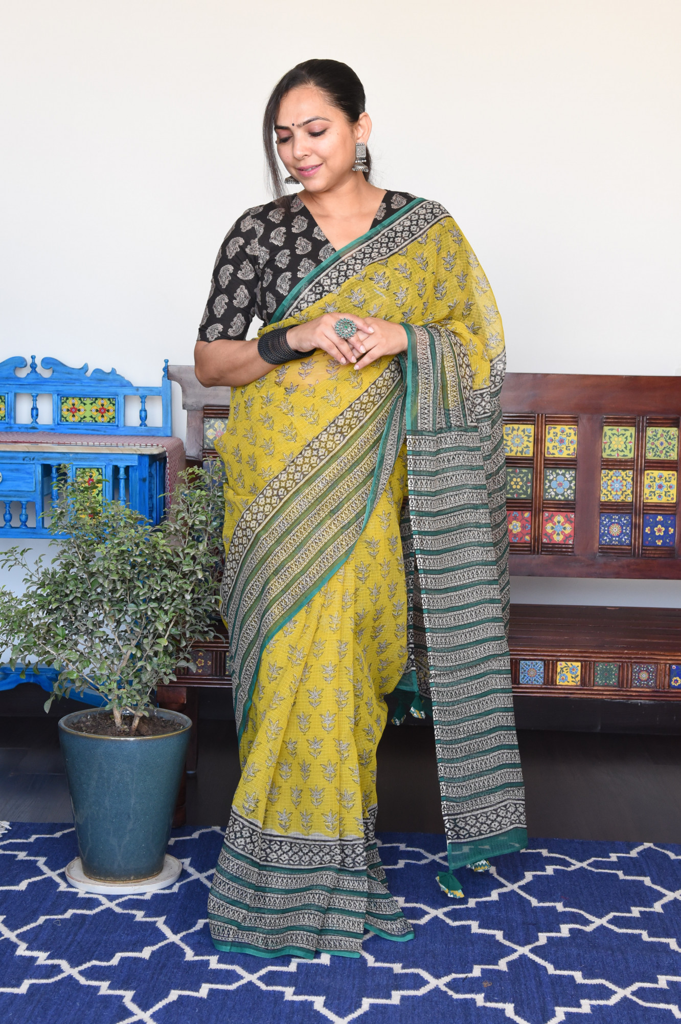 Handblock printed yellow - green kota doria cotton saree. Accessorised with fabric tassels.