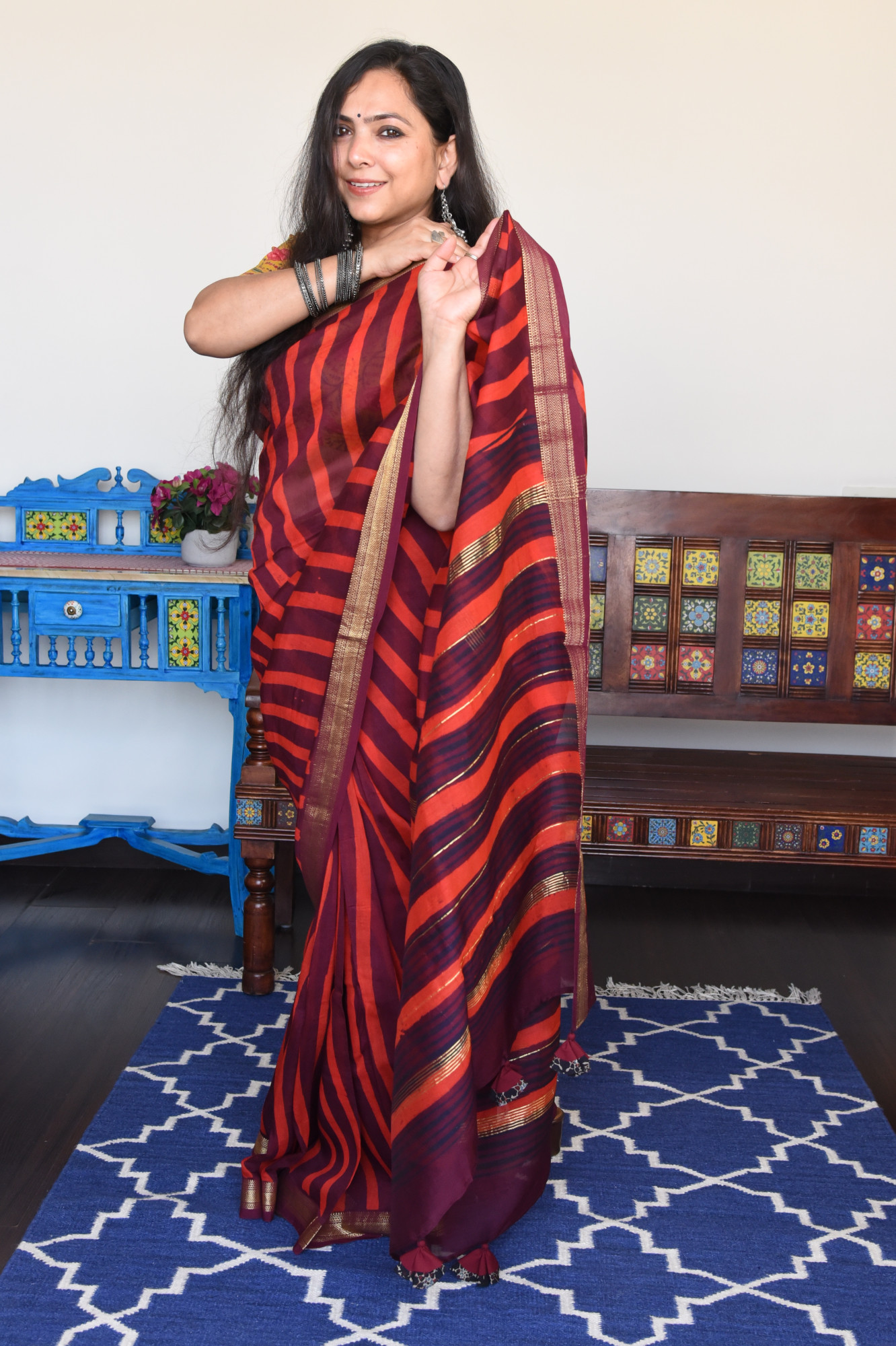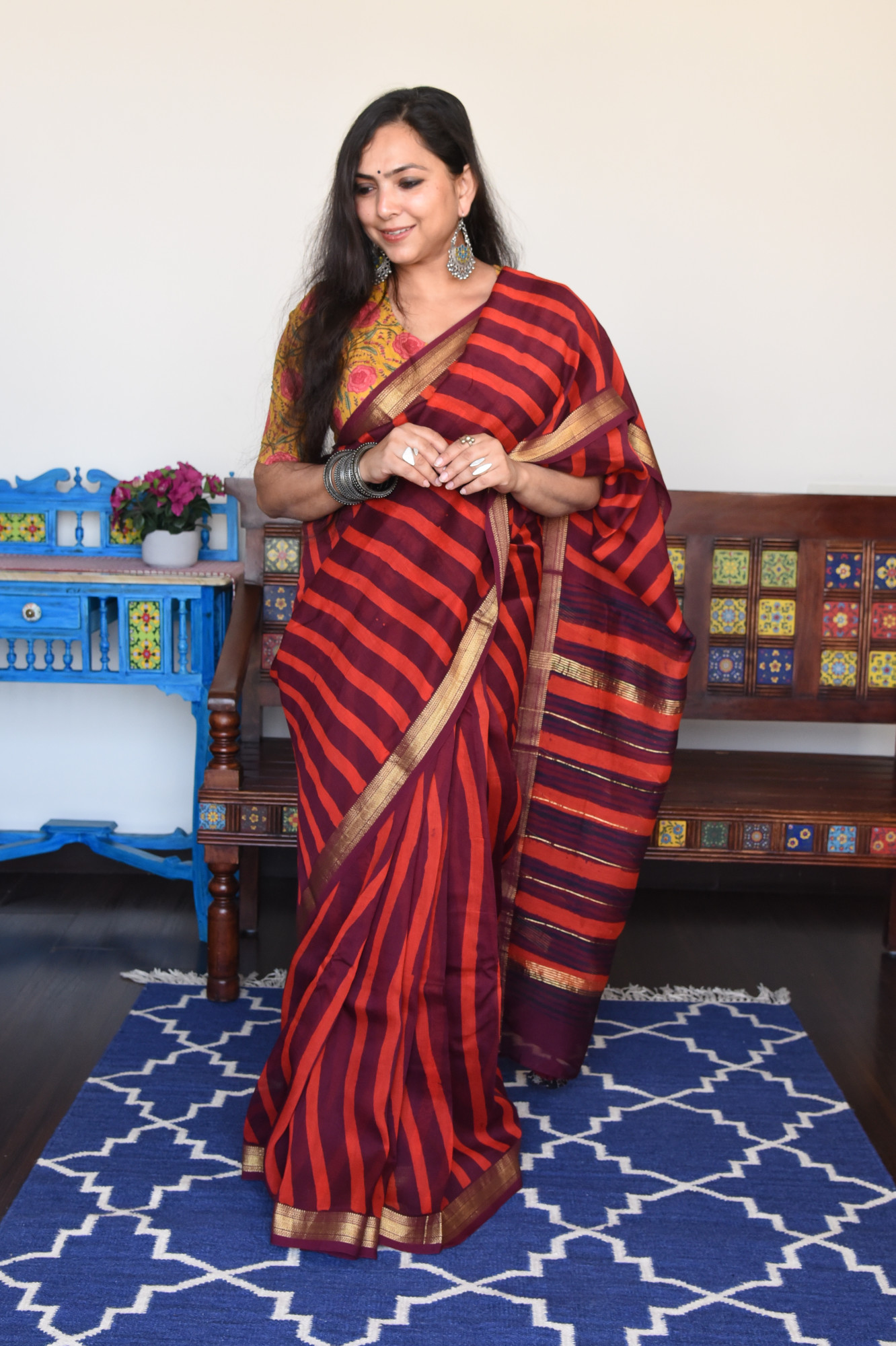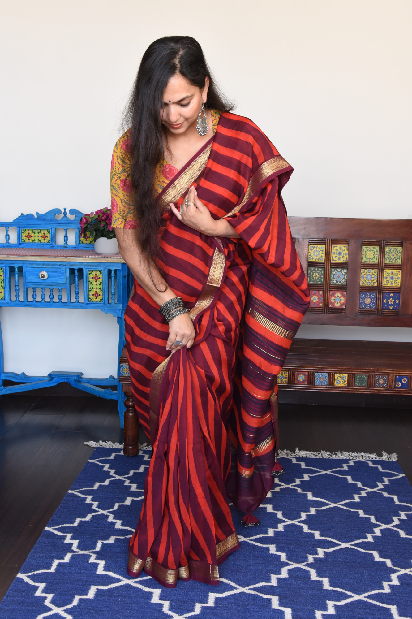 Dry clean only. Since this is a handwoven/ handcrafted product, there might be slight irregularities and unevenness in weave, pattern or selvedges due to weaving process and there can be some ink stains here and there due to the manual craft process. Fabrics tend to bleed out excess color in initial washes. Kindly allow for minor crafting defects.