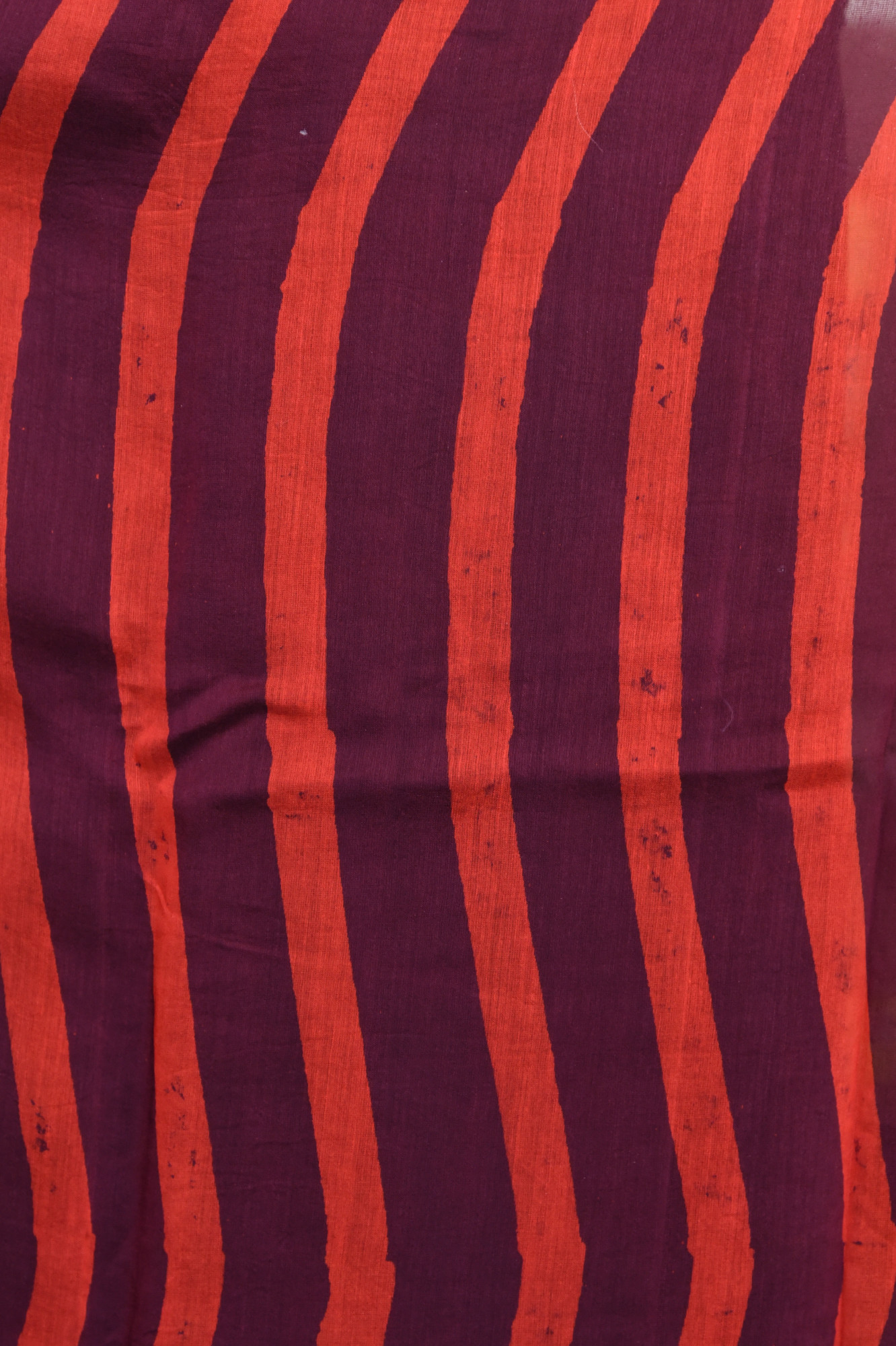 Hand block printed striped orange - purple cotton silk saree with golden zari border.