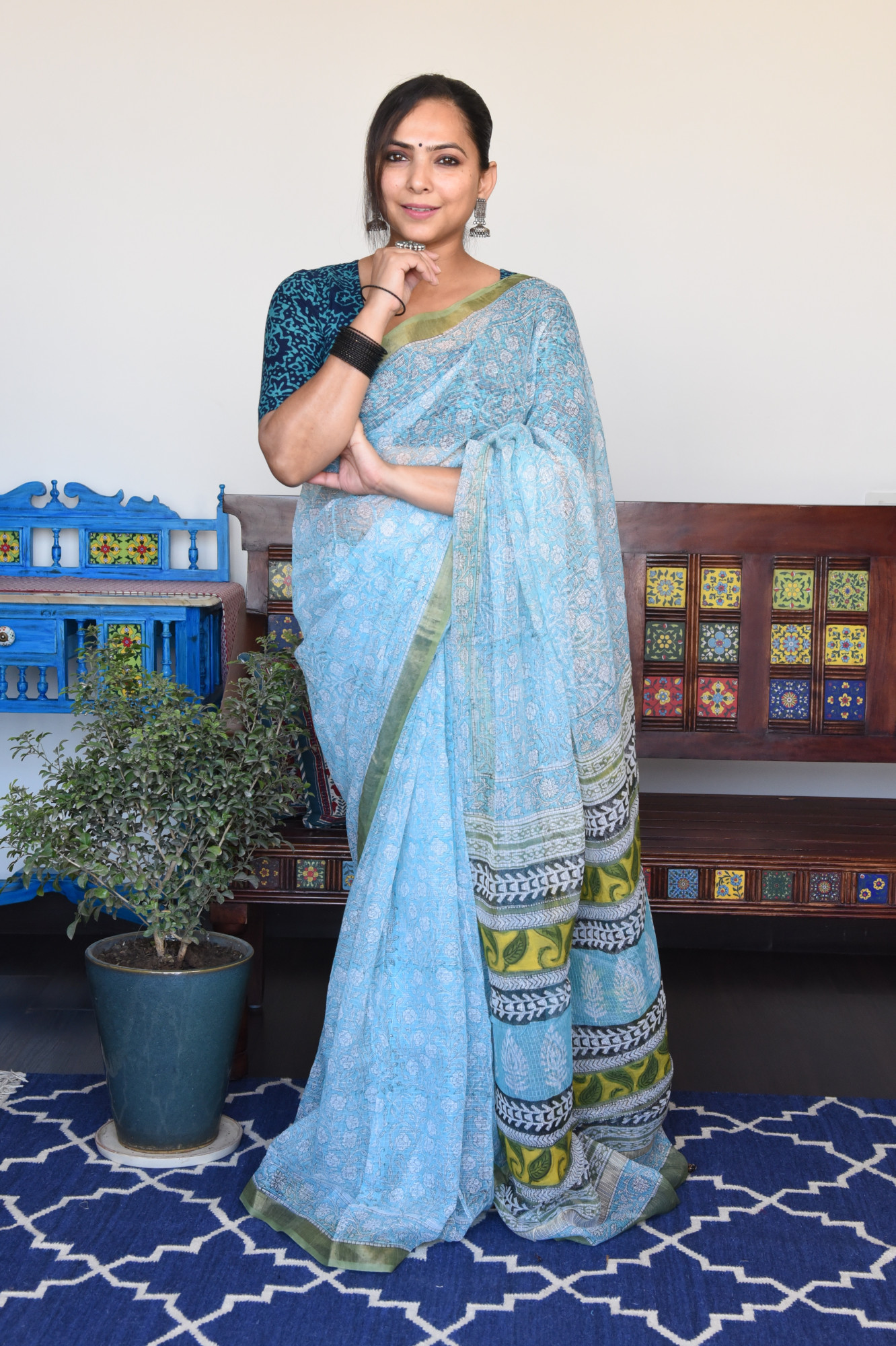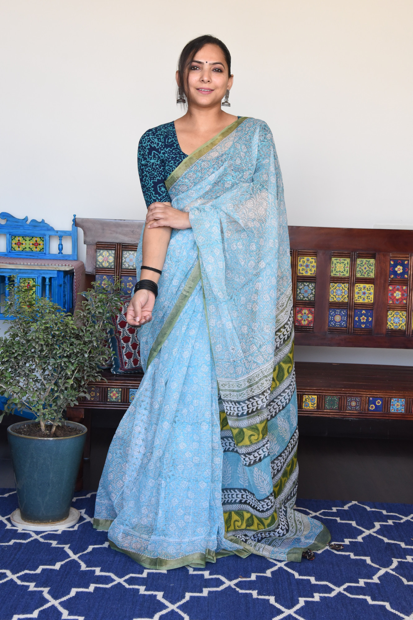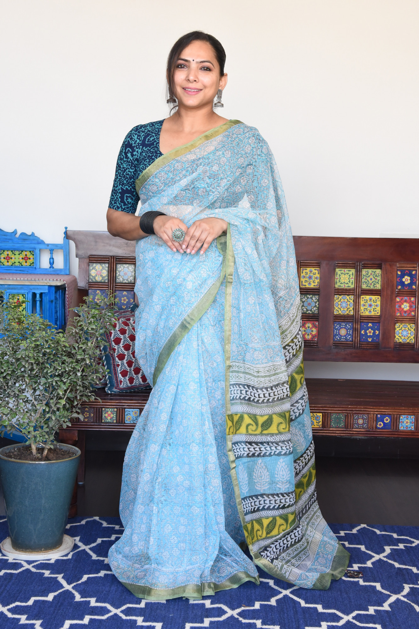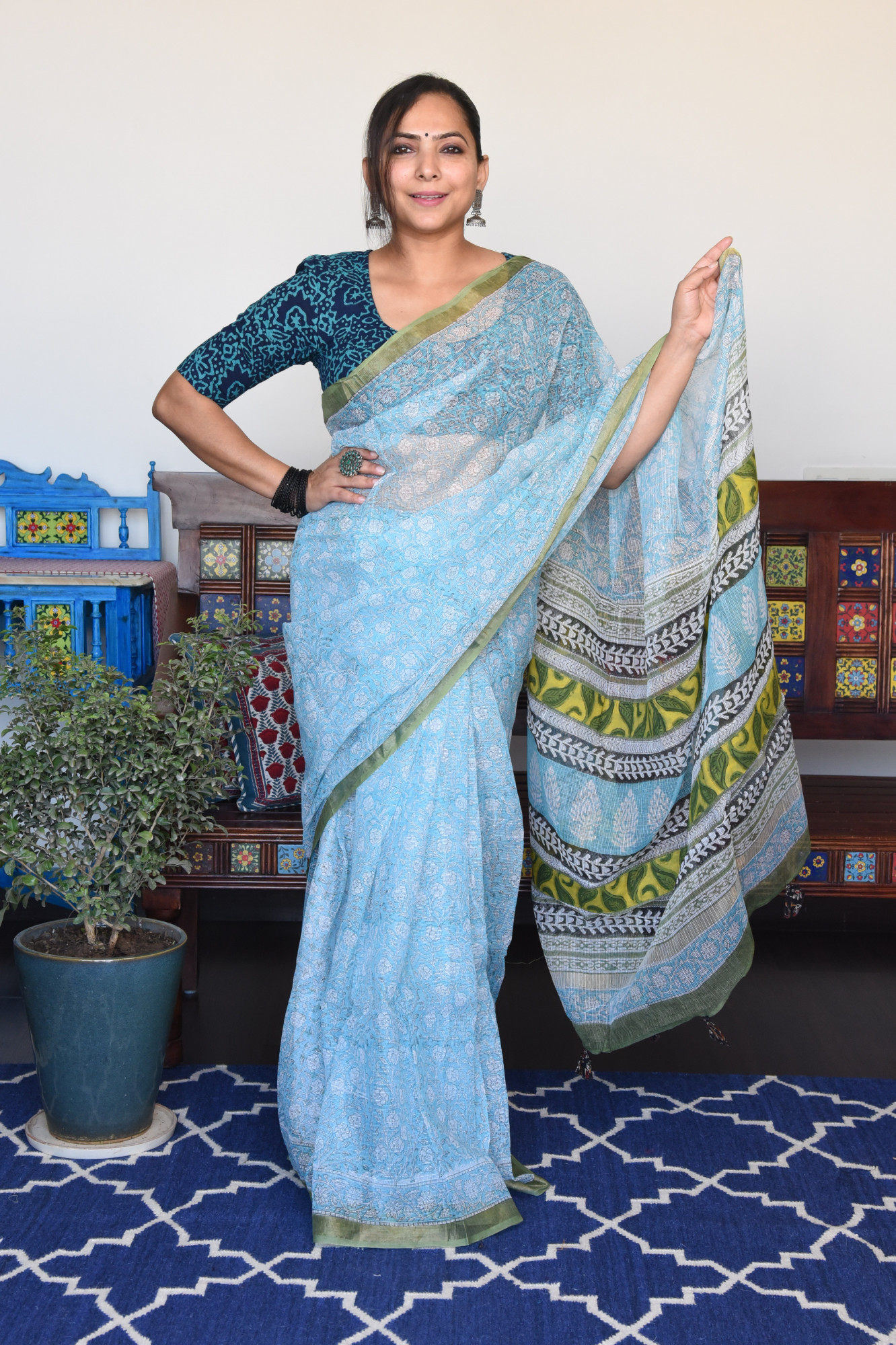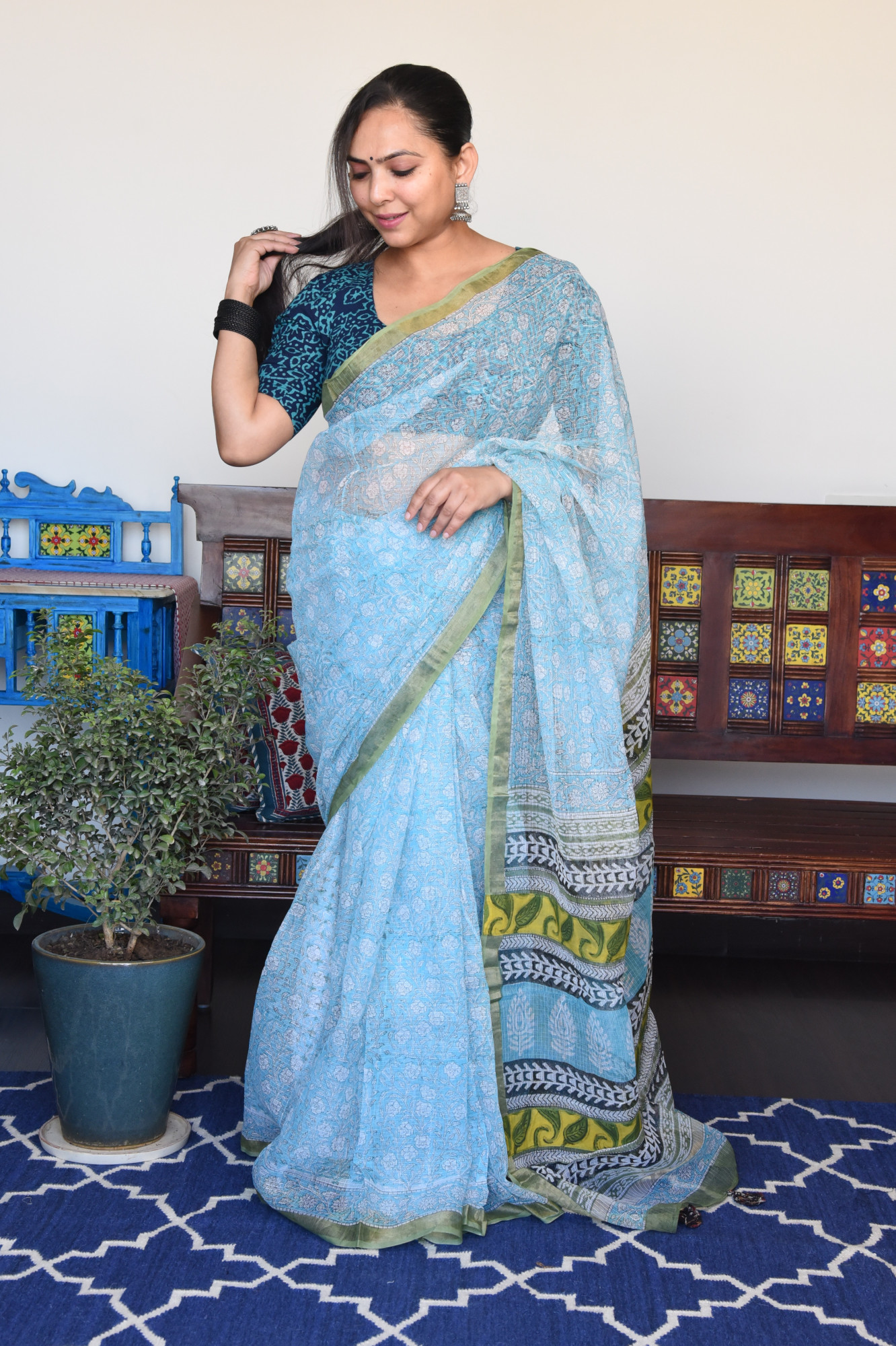 Handblock printed light blue kota doria cotton saree. Accessorised with fabric tassels.