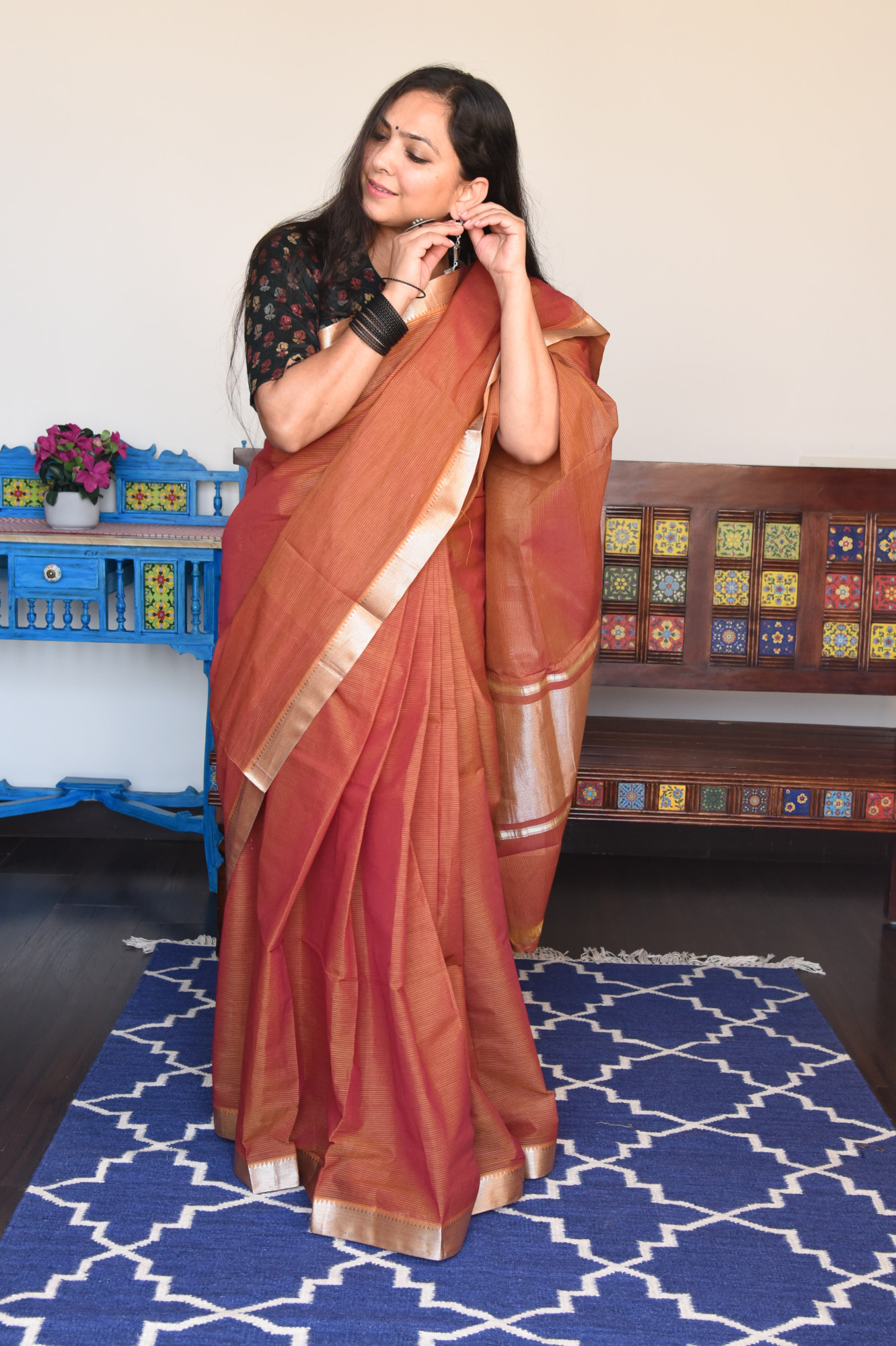 Mangalgiri missing weave cotton saree with silver zari nizam border and zari palla. Accessorised with self tassels.