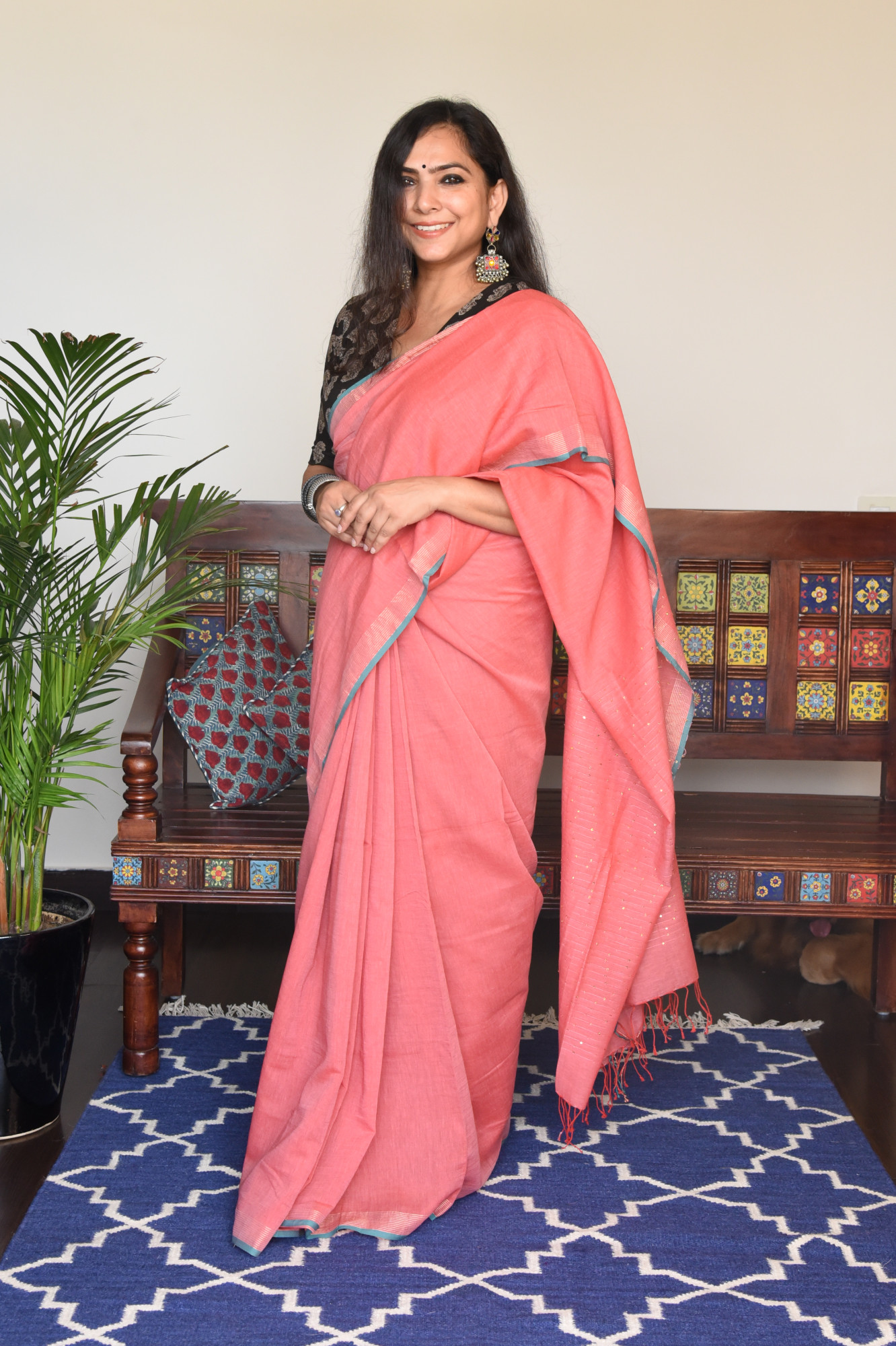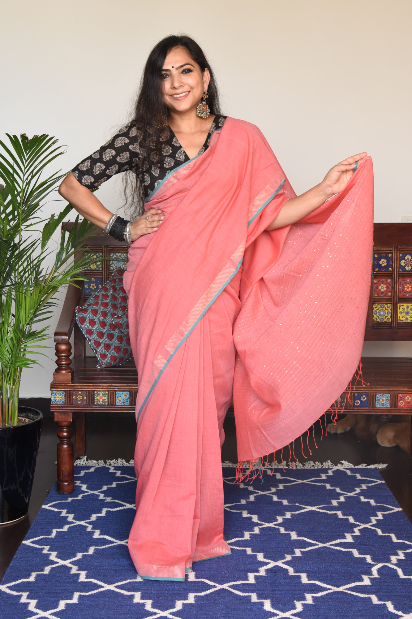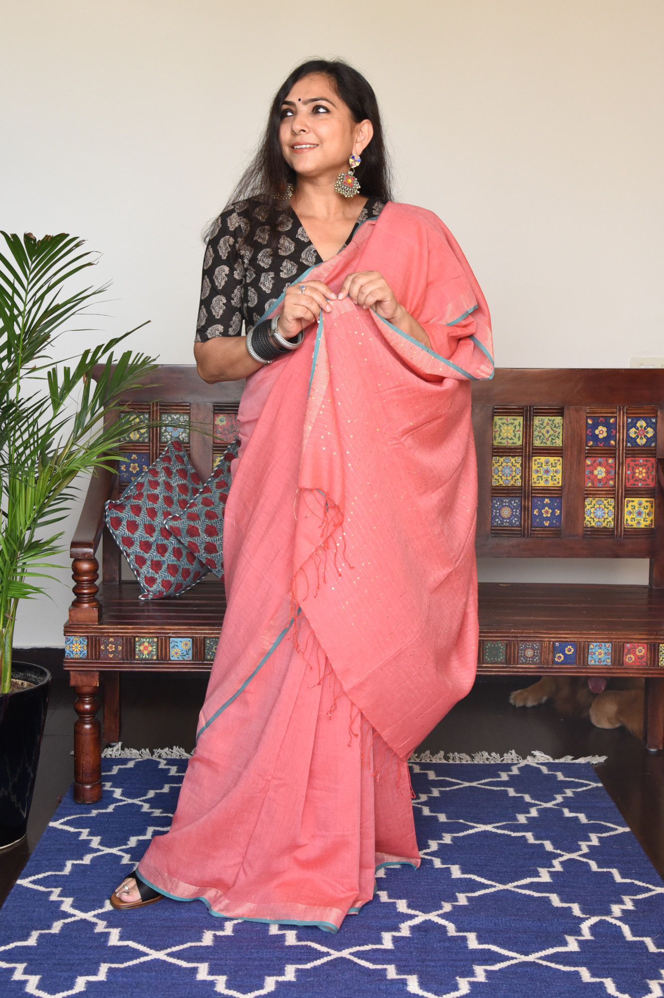 Handwoven soft coral red with golden zari border - blue selvedges cotton saree with woven sequins heavily on palla. Accessorised with tassles.