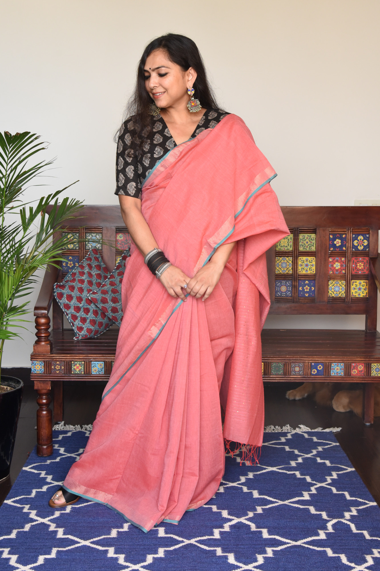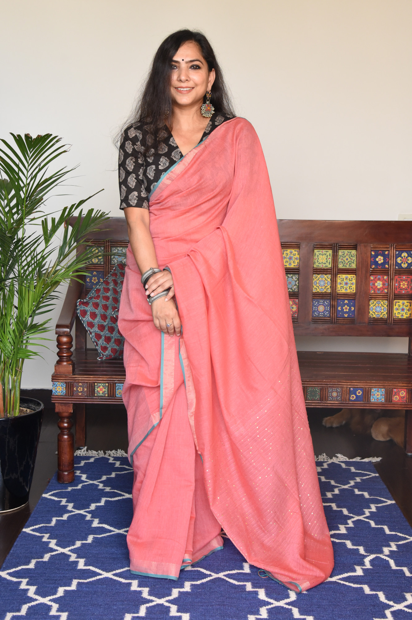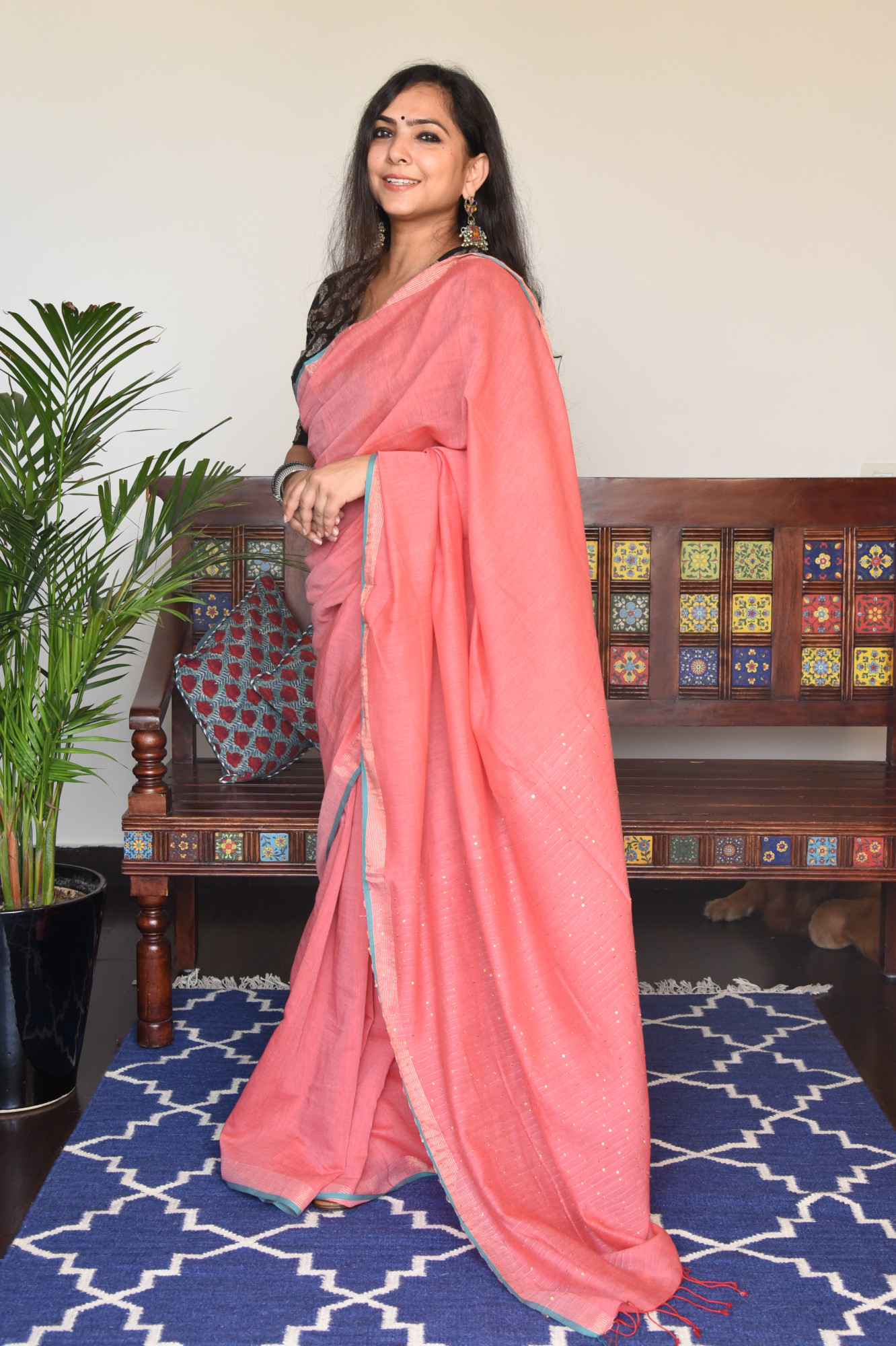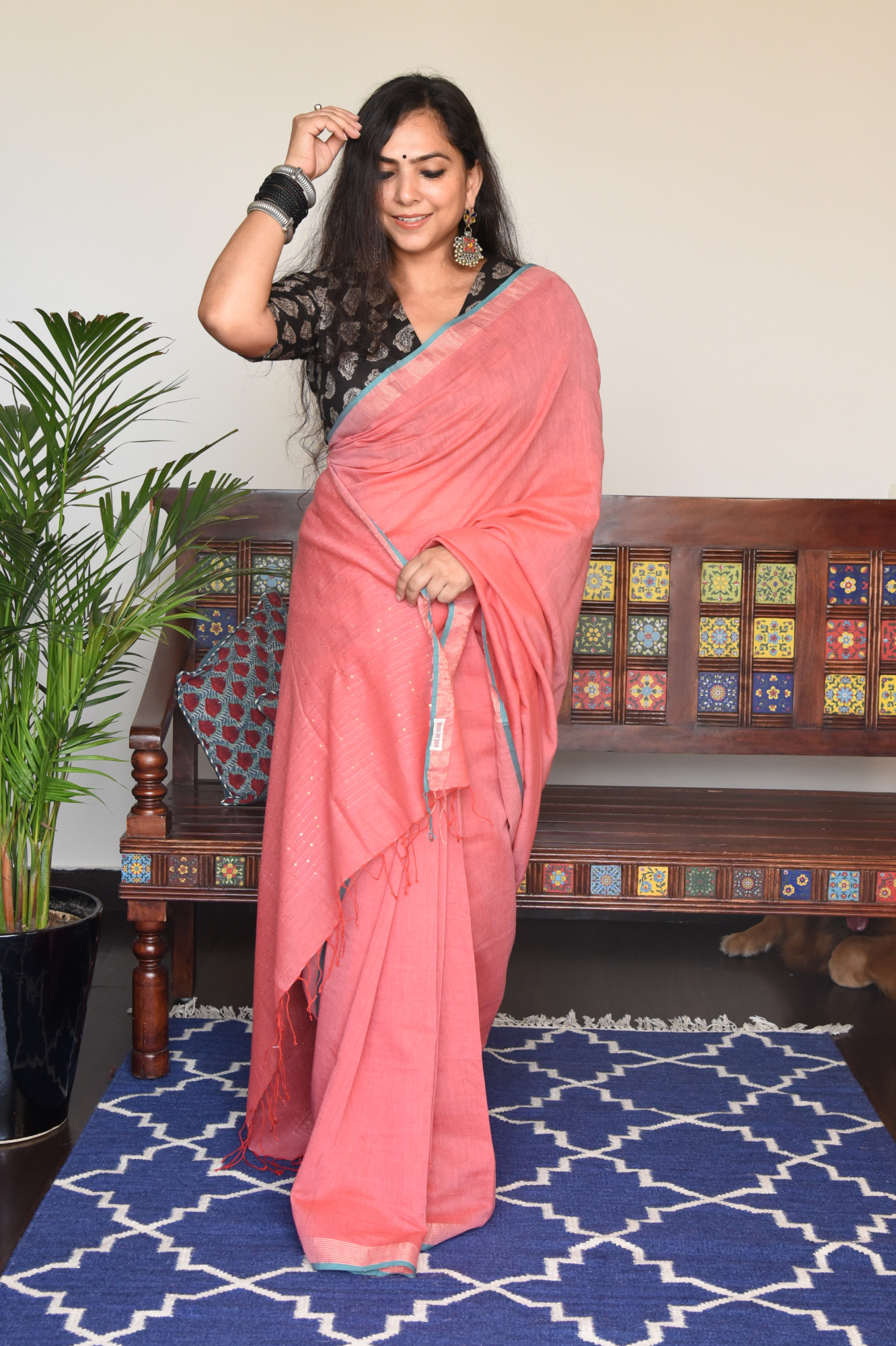 Handwoven soft coral red with golden zari border - blue selvedges cotton saree with woven sequins heavily on palla. Accessorised with tassles.