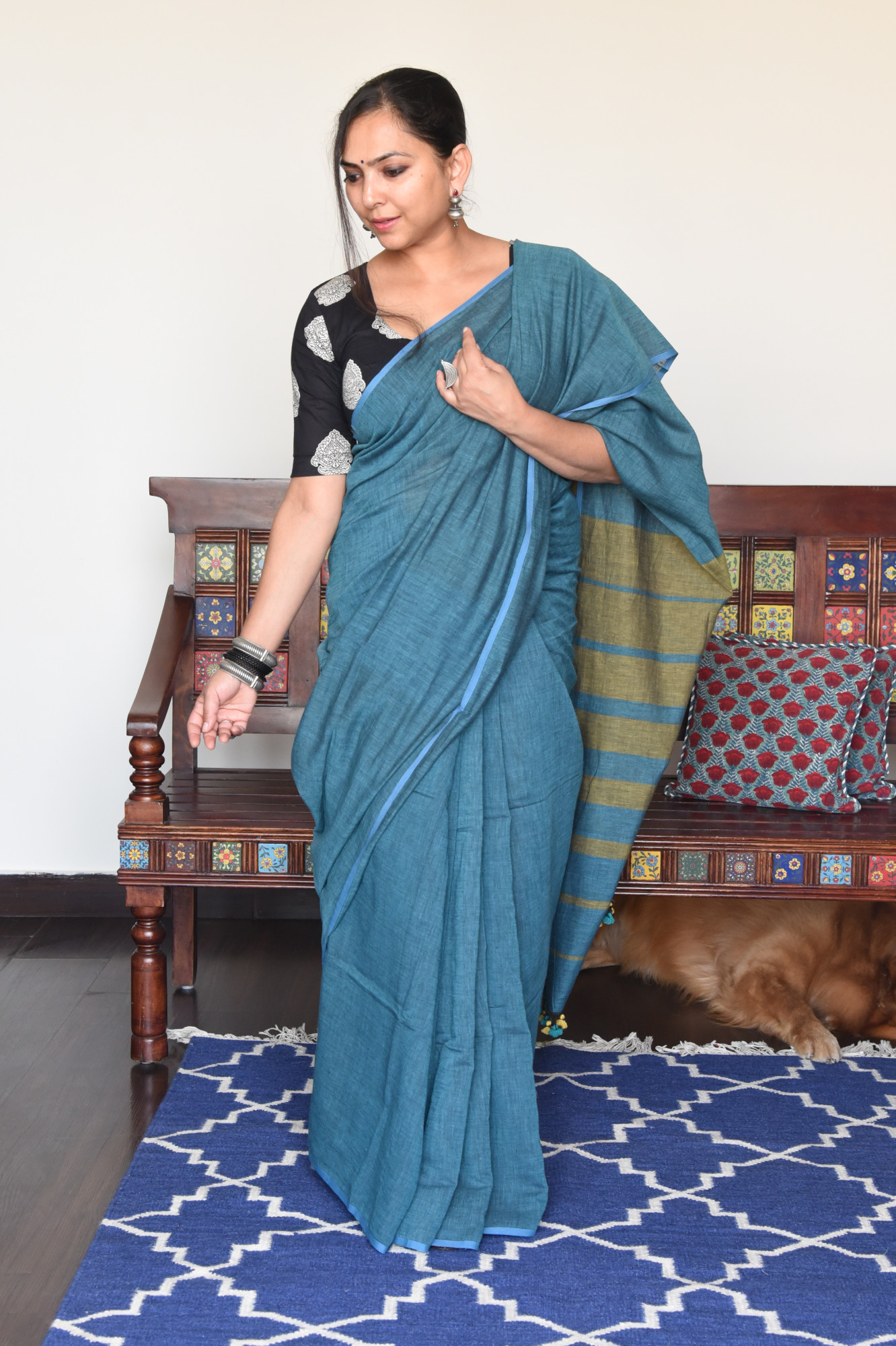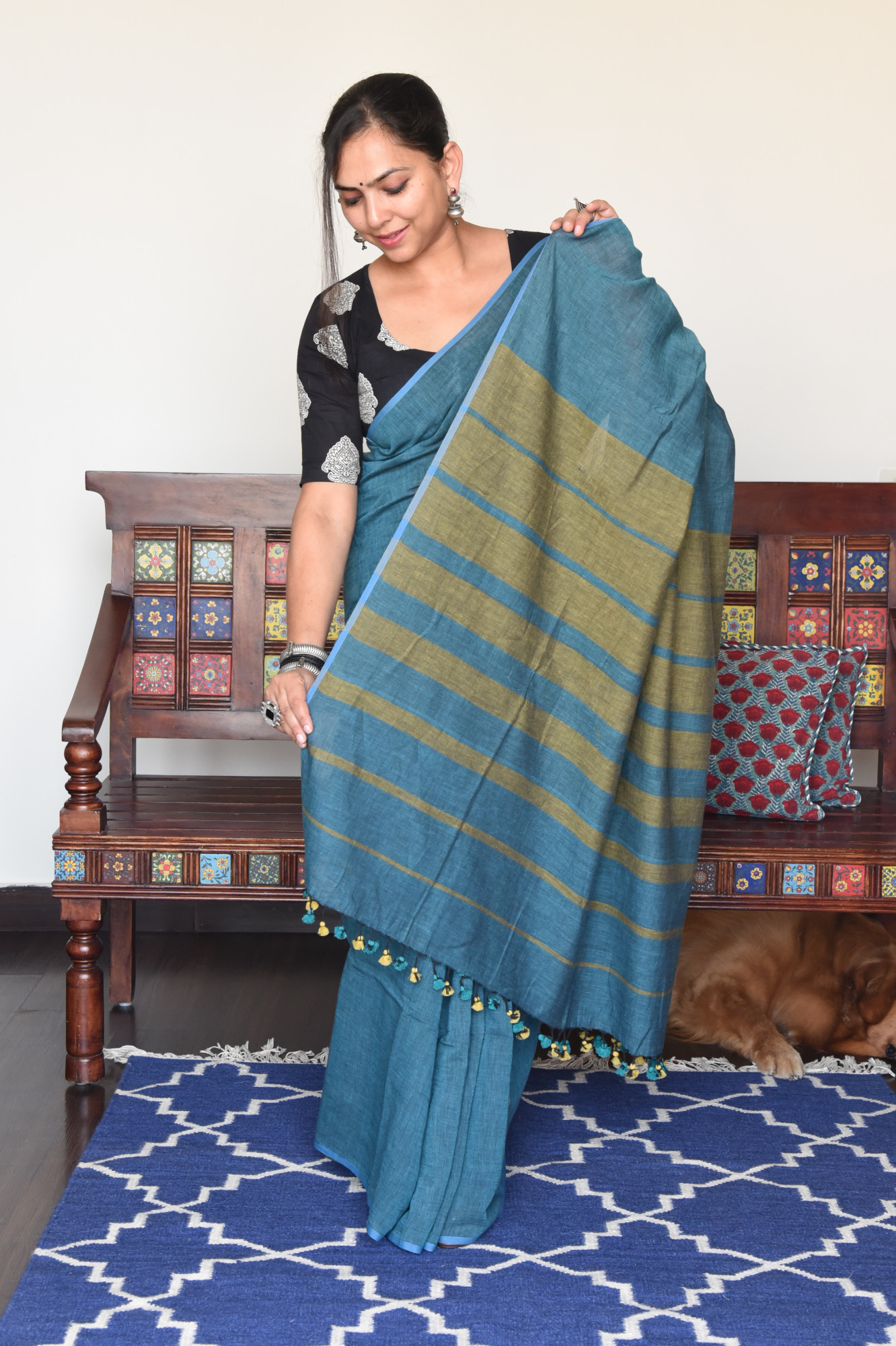 Handwoven navy teal Bengal cotton saree with mehendi green striped palla.
