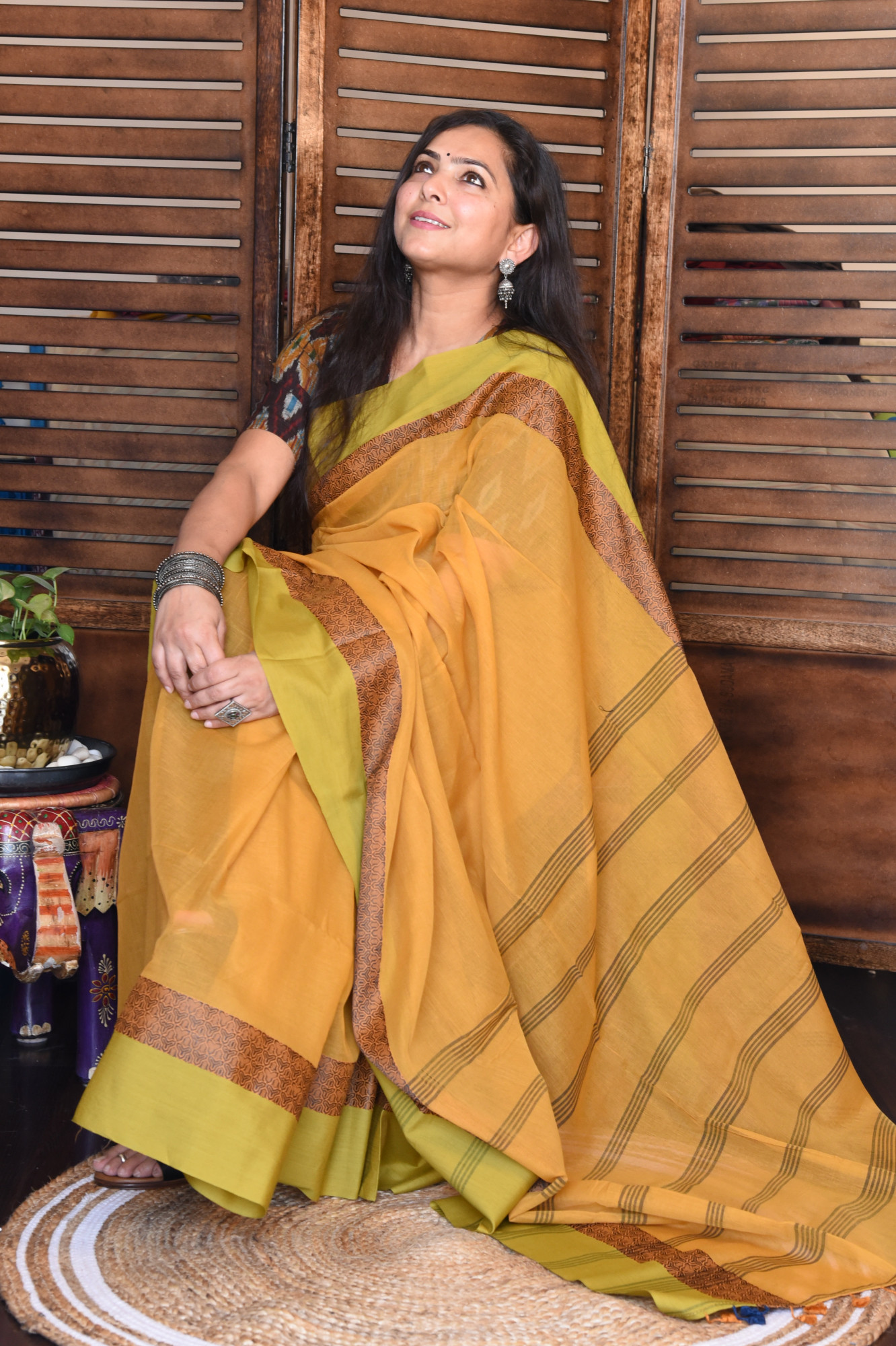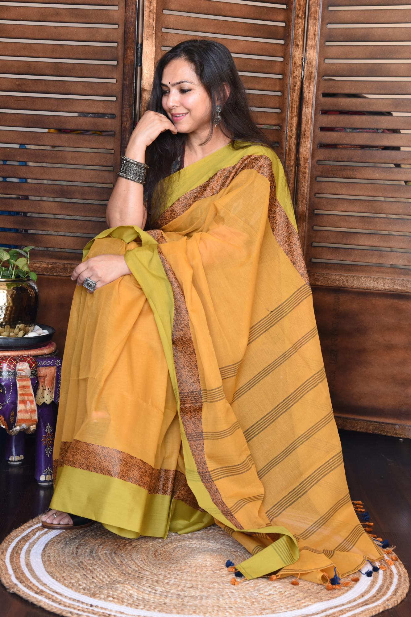 Handwoven ochre Bengal cotton saree with green border having brown resham thread work and striped palla. Accessorised with self tassles