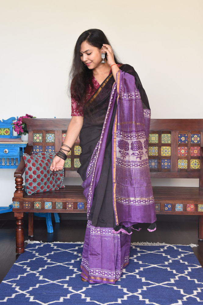 Hand block printed cotton silk saree with golden zari border.