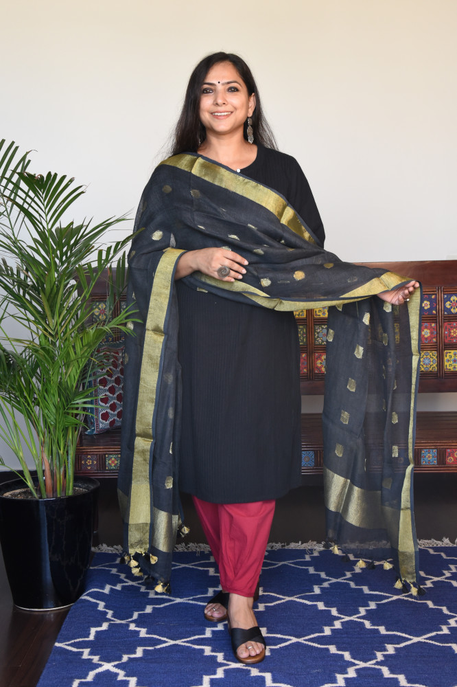 Black - gold polka dot linen dupatta with zari on border and each sides. Accessorised with tassles.
