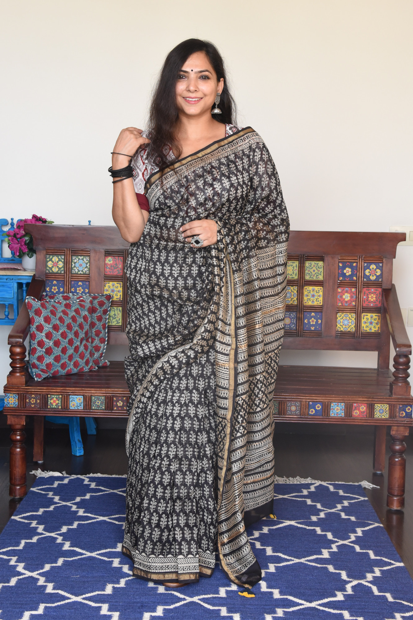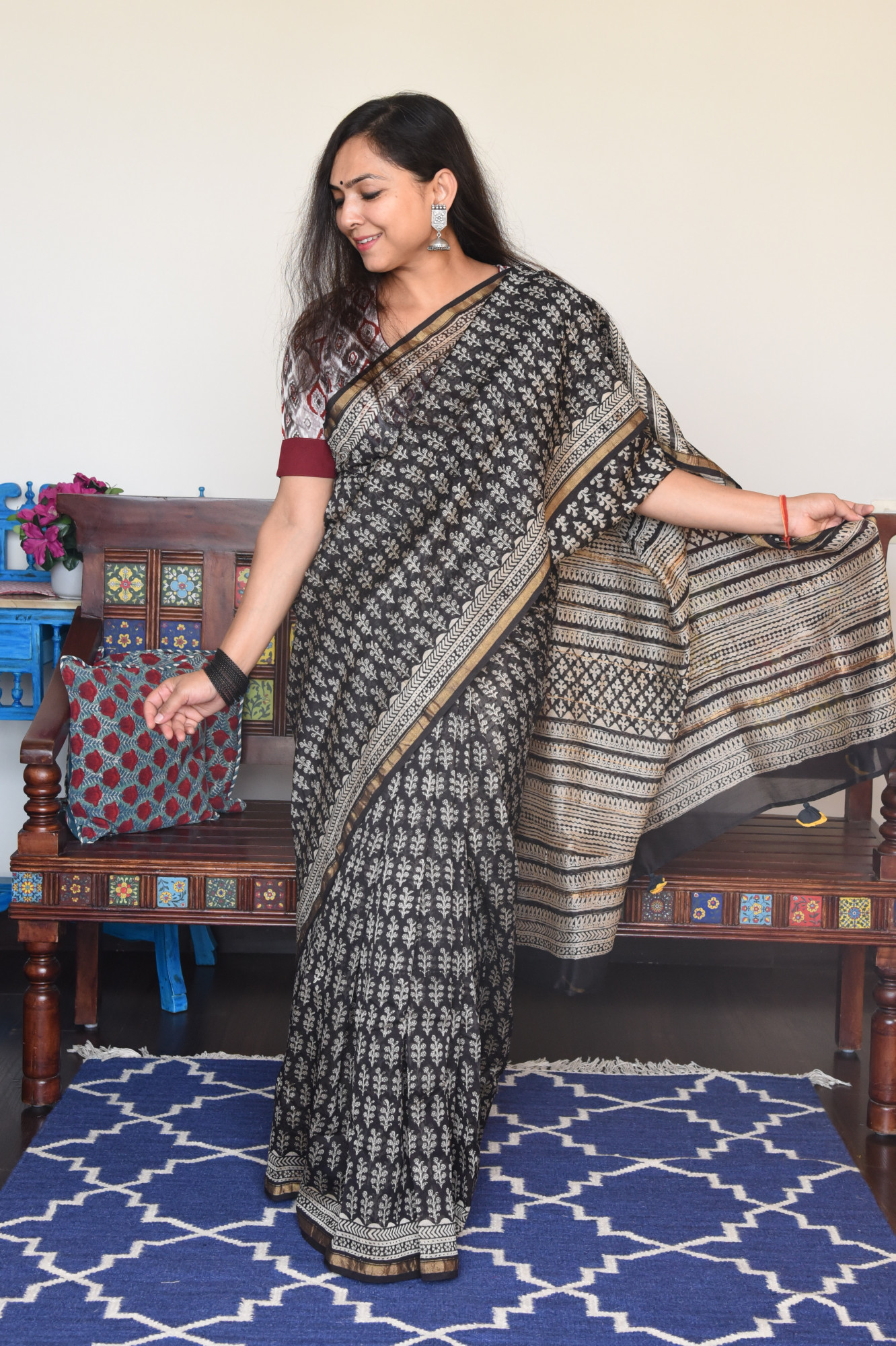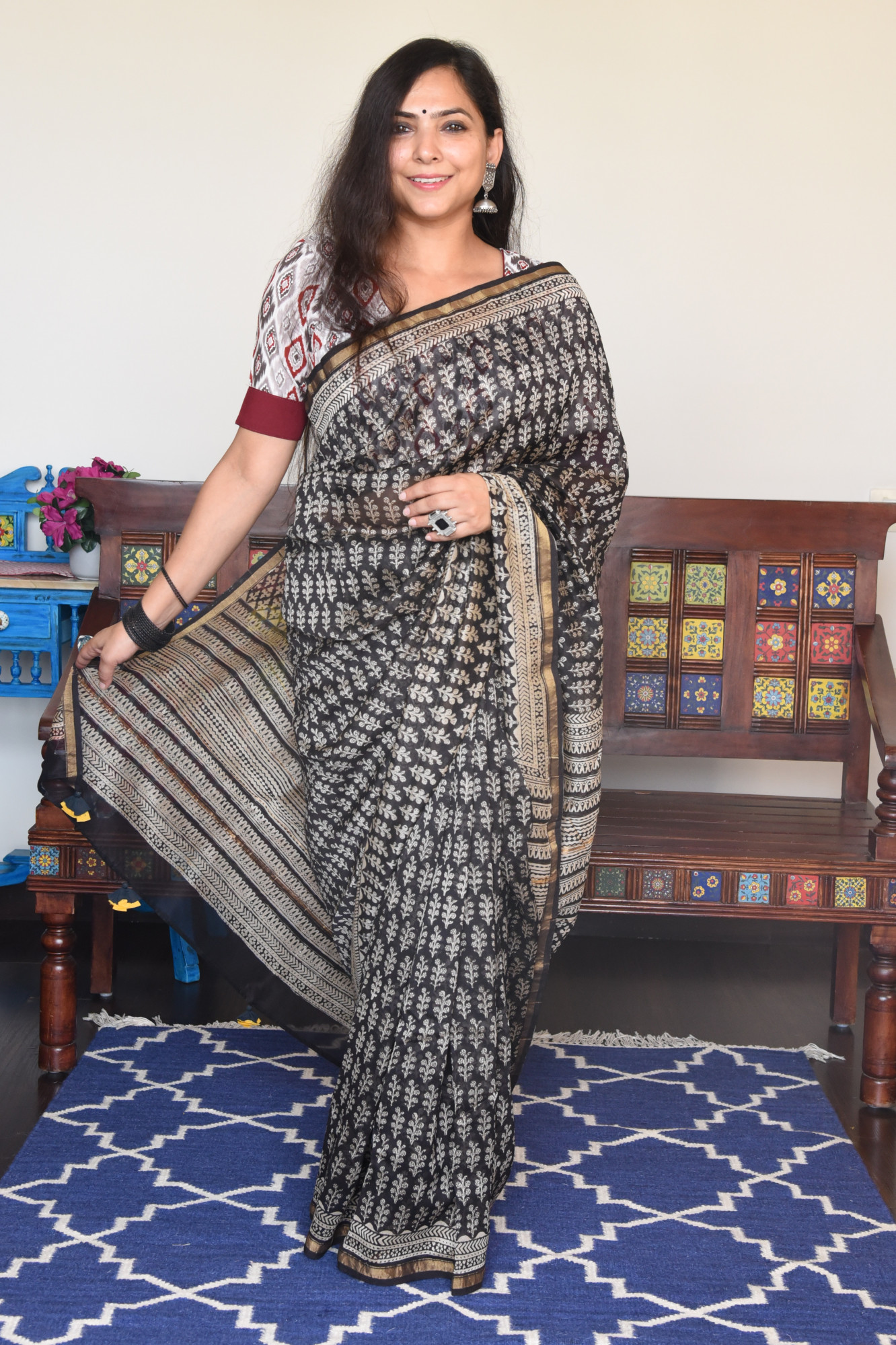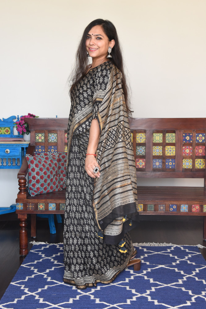 Hand block printed black cotton silk saree with broad golden zari border.