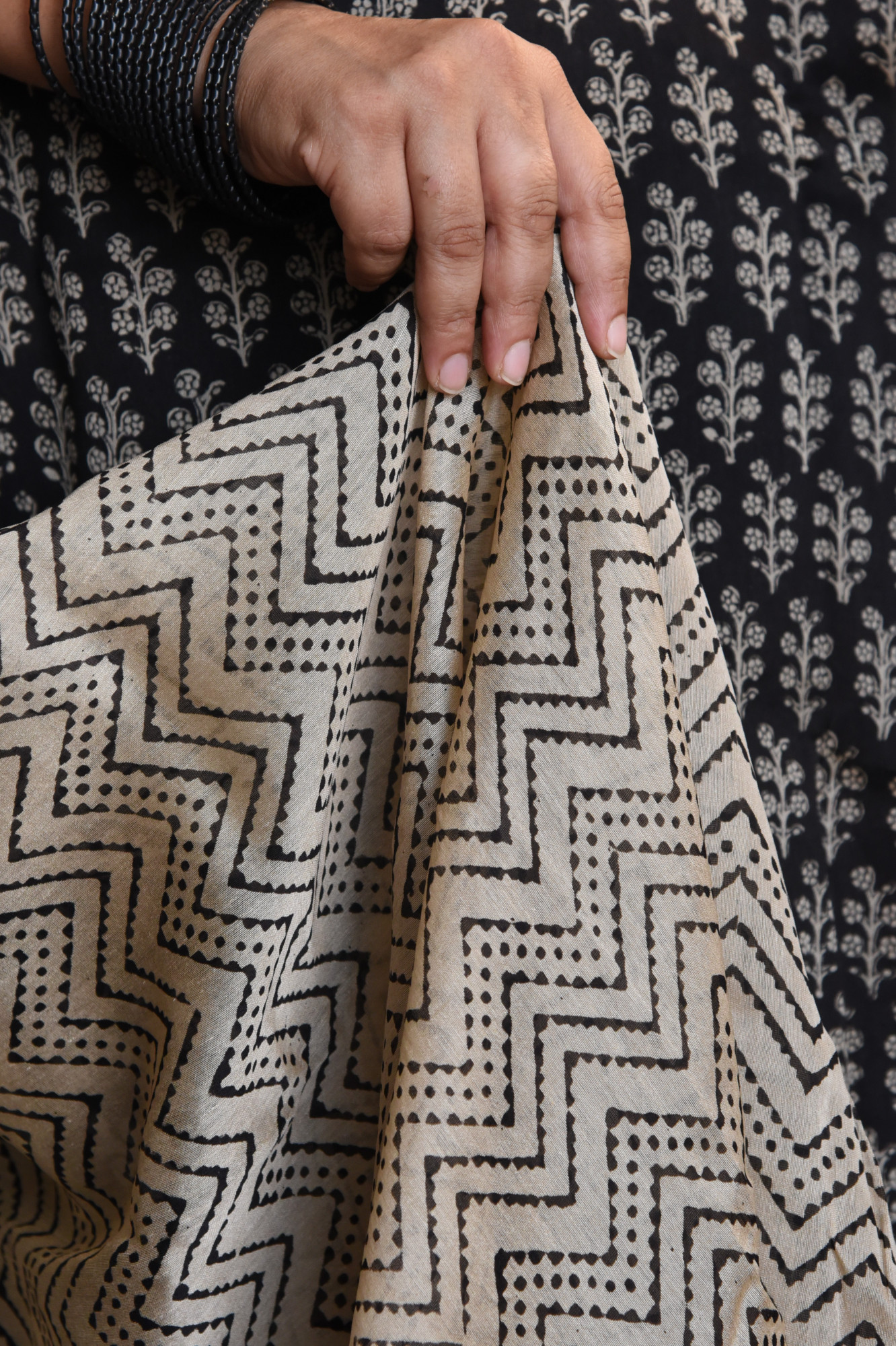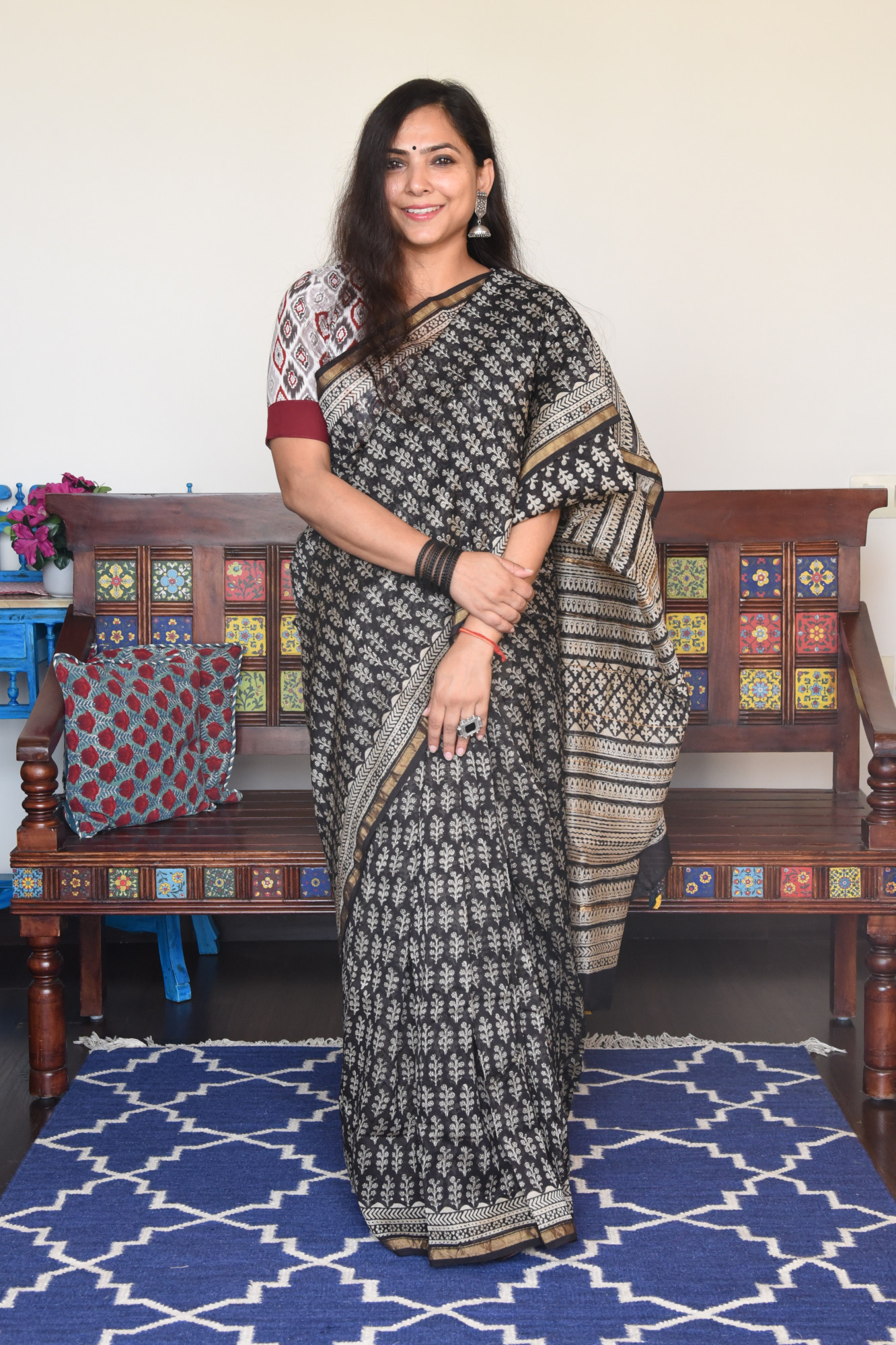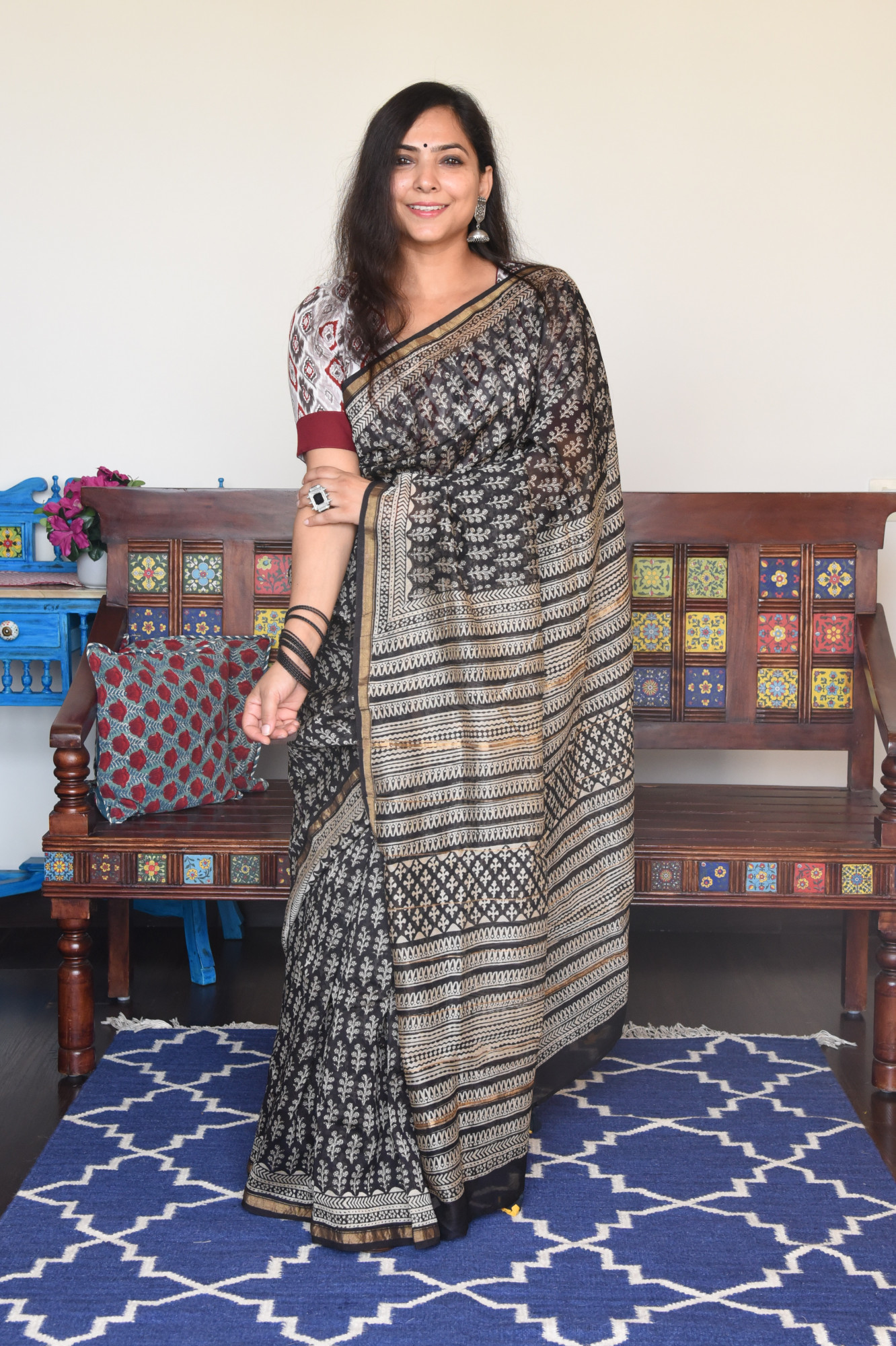 Hand block printed black cotton silk saree with broad golden zari border.