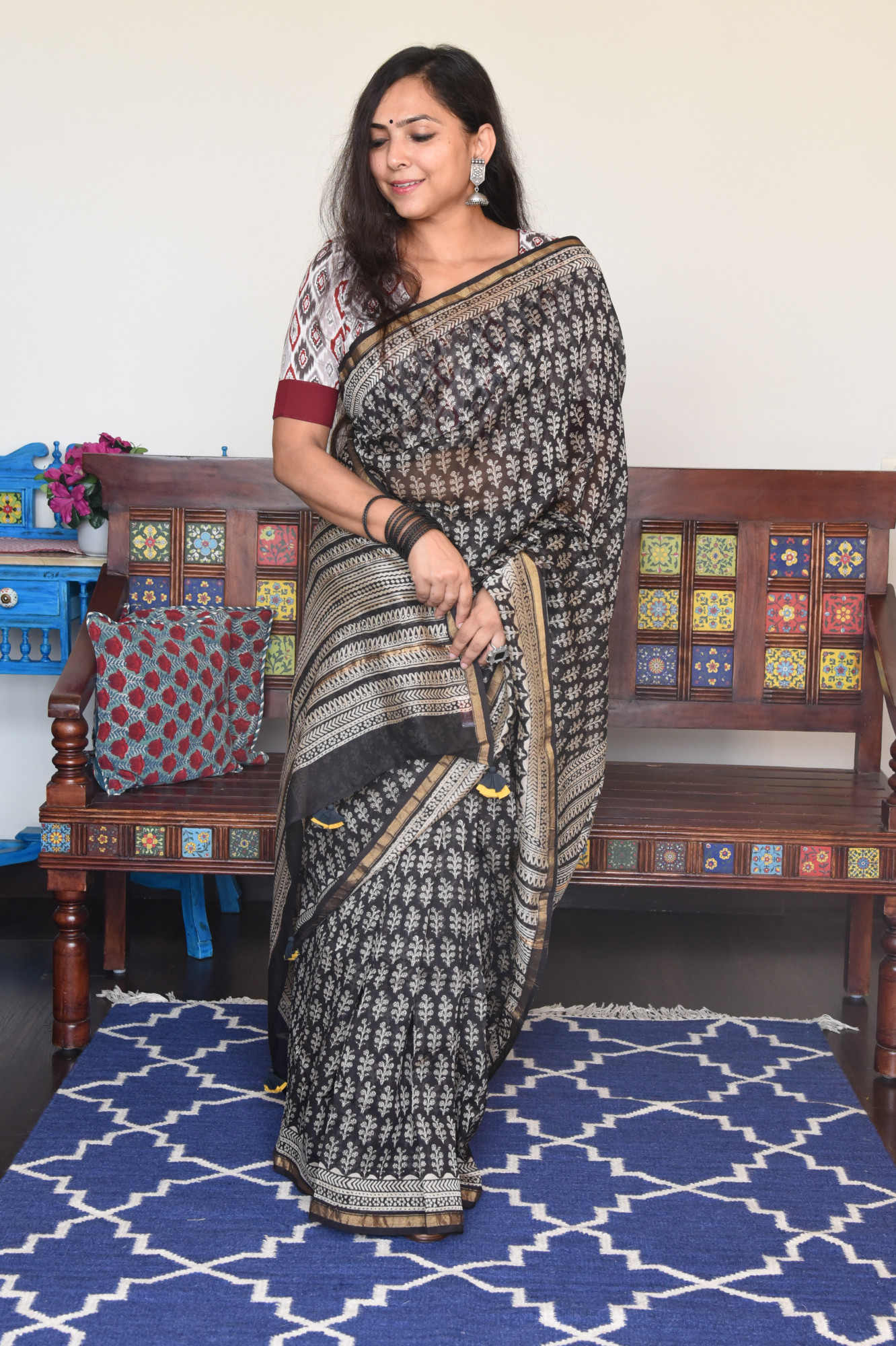 Dry clean only. Since this is a handwoven/ handcrafted product, there might be slight irregularities and unevenness in weave, pattern or selvedges due to weaving process and there can be some ink stains here and there due to the manual craft process. Fabrics tend to bleed out excess color in initial washes. Kindly allow for minor crafting defects.