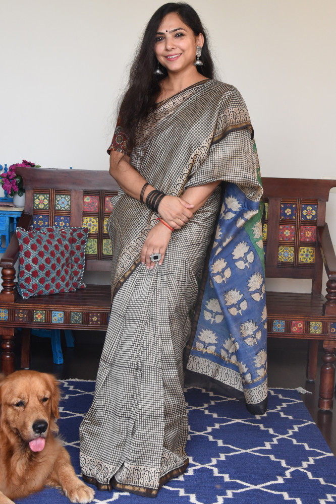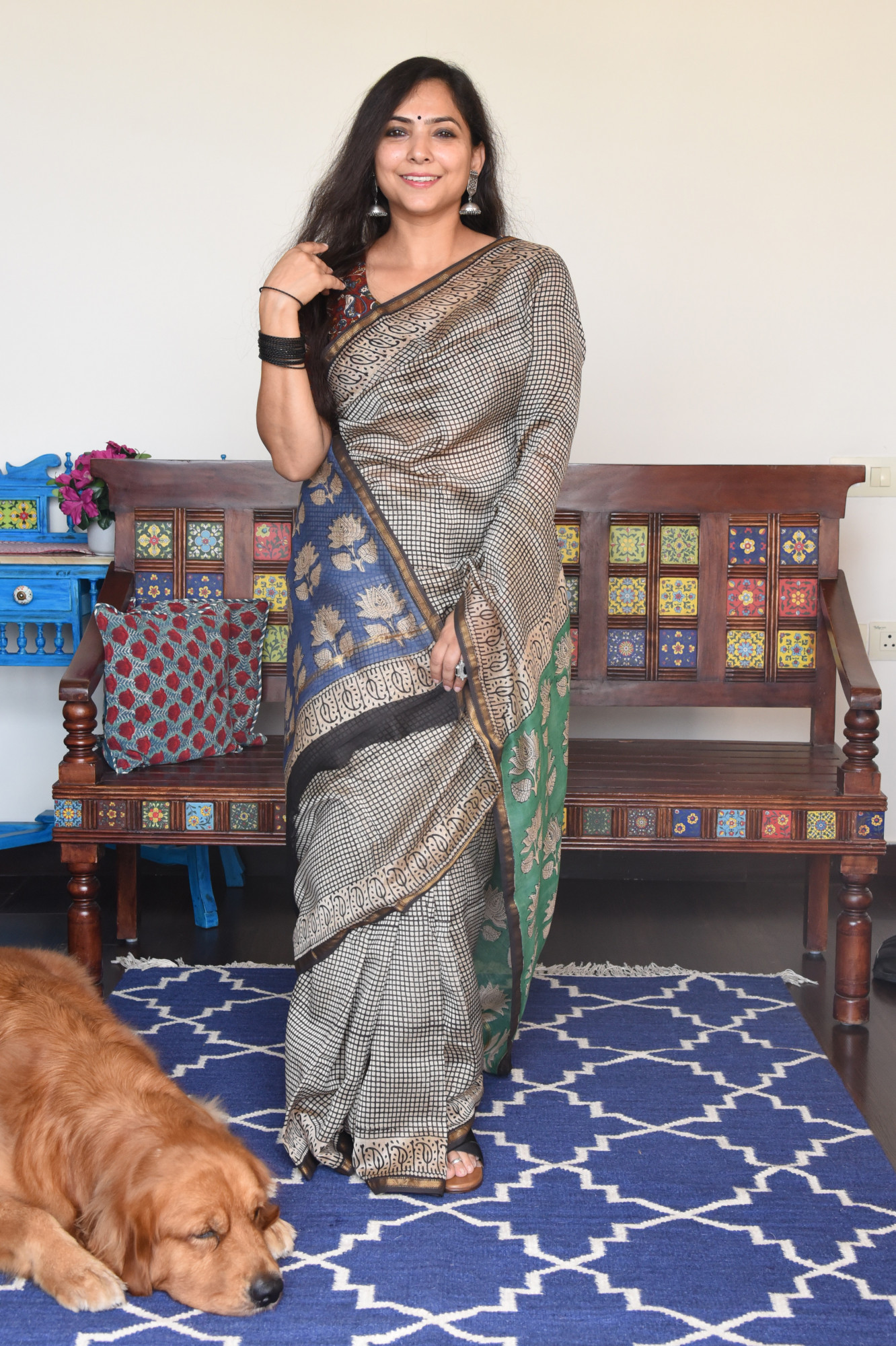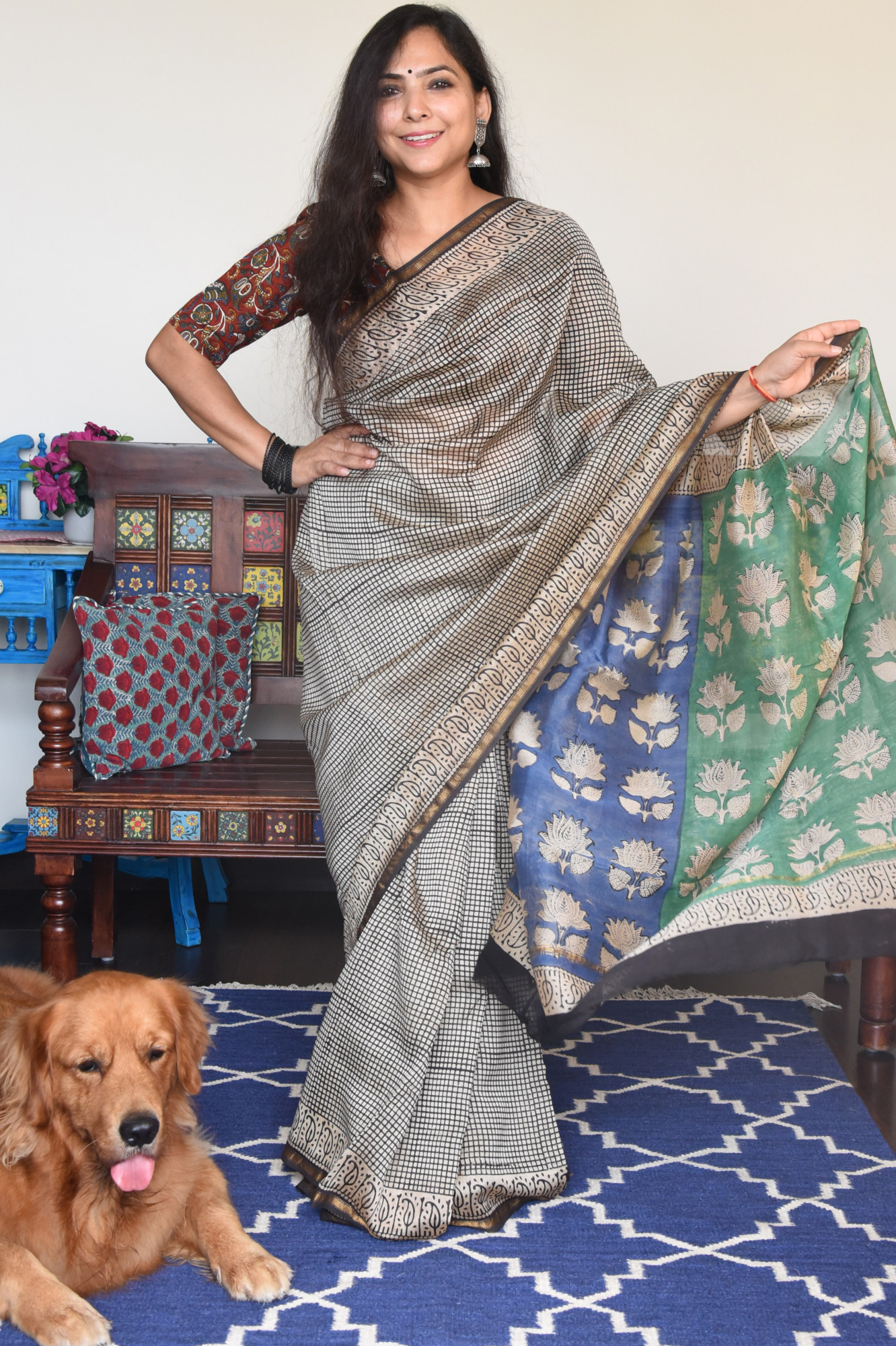 Hand block printed small ckeck black cotton silk saree with broad golden zari border.
