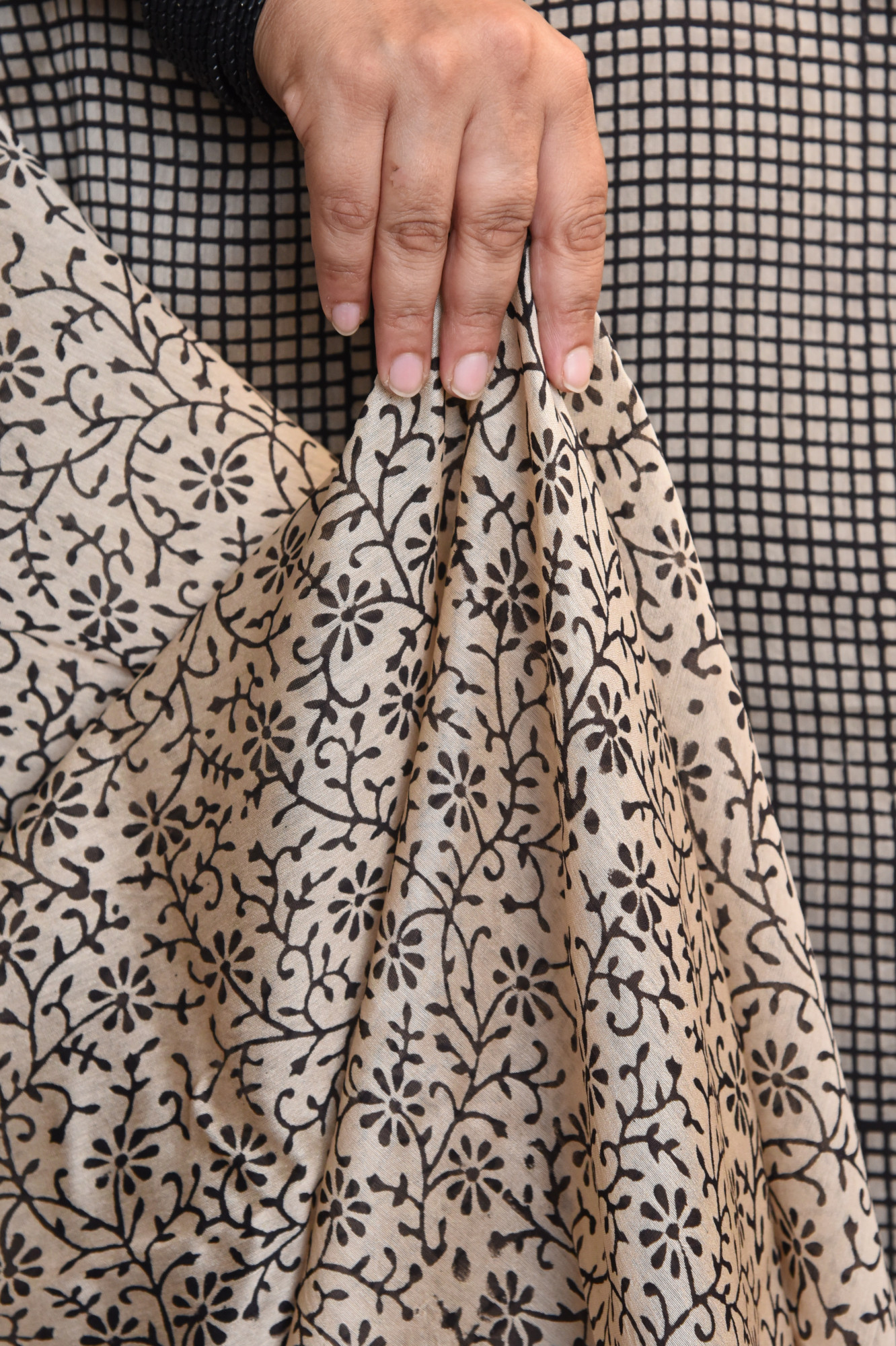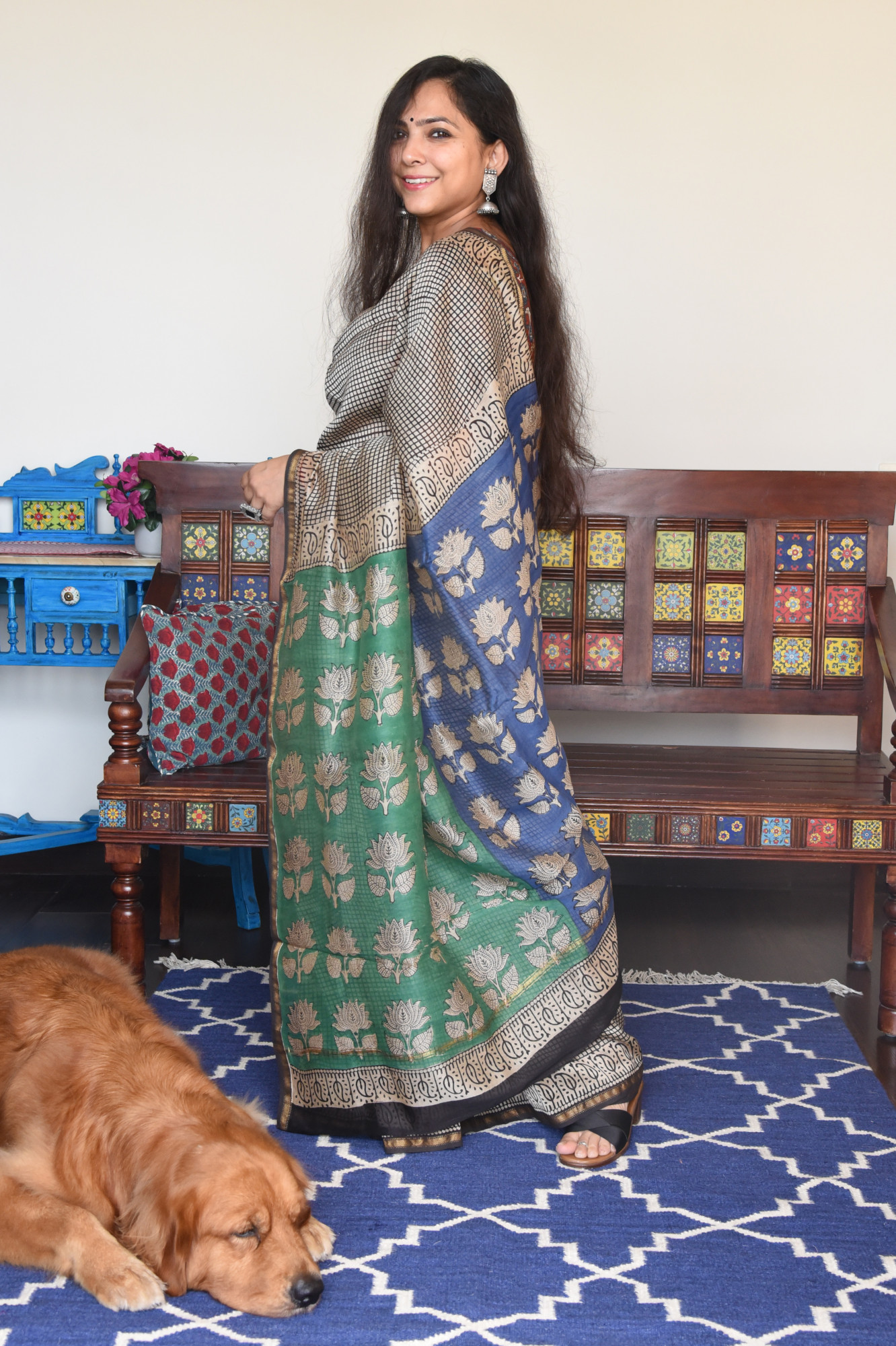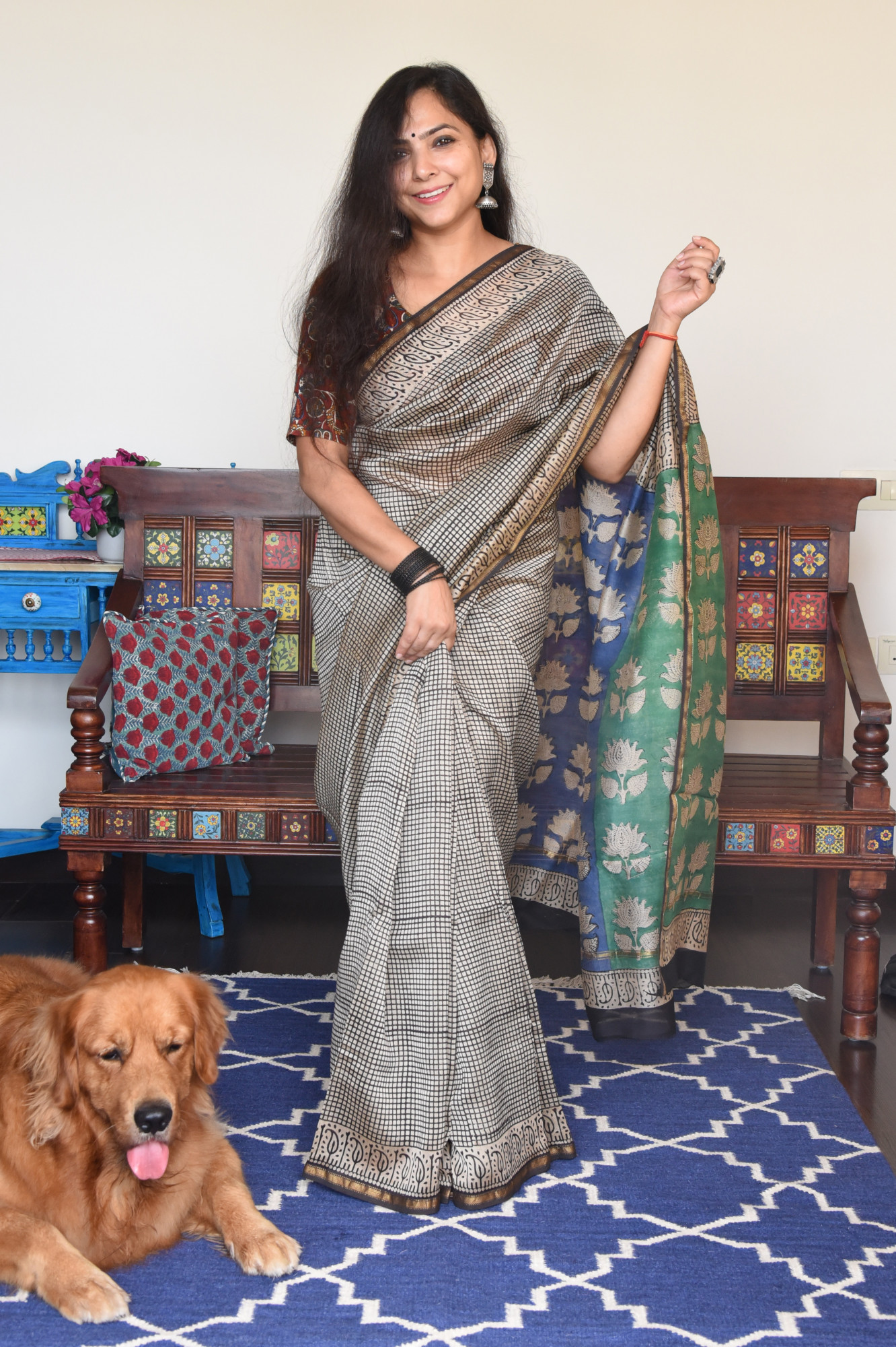 Hand block printed small ckeck black cotton silk saree with broad golden zari border.