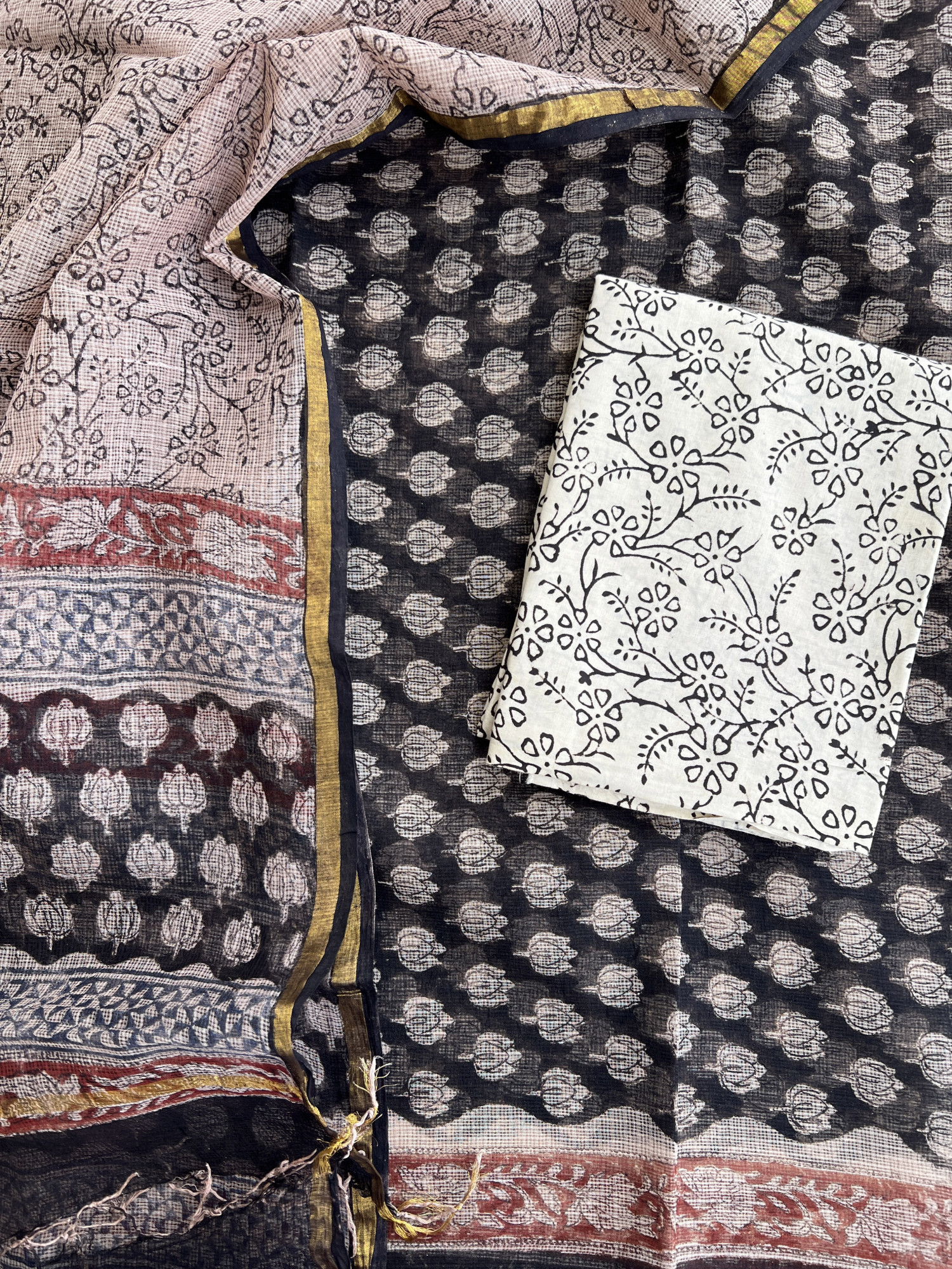 Handblock printed kota dupatta with gold zari comes with Kota kurta fabric and cotton bottom.