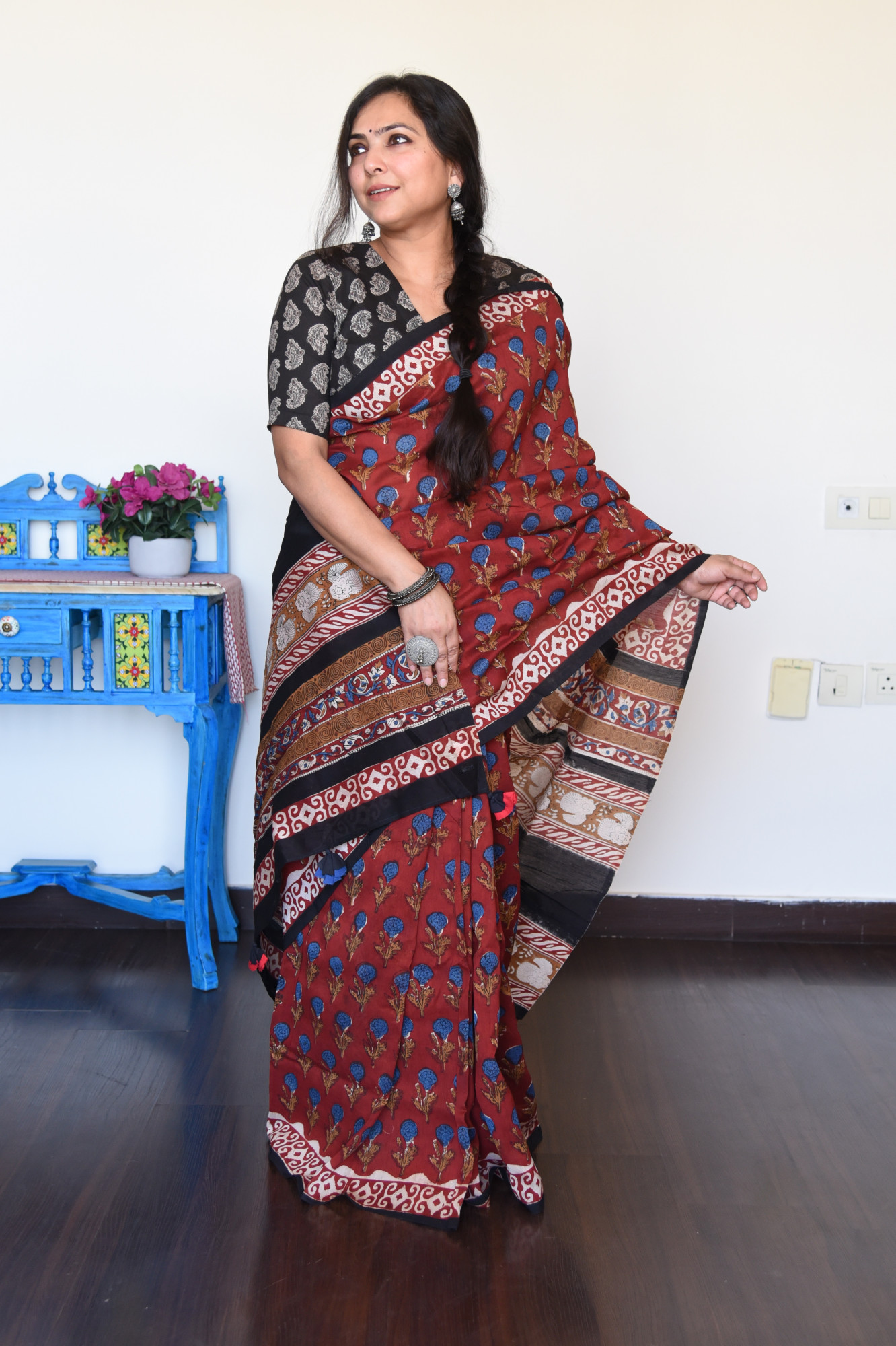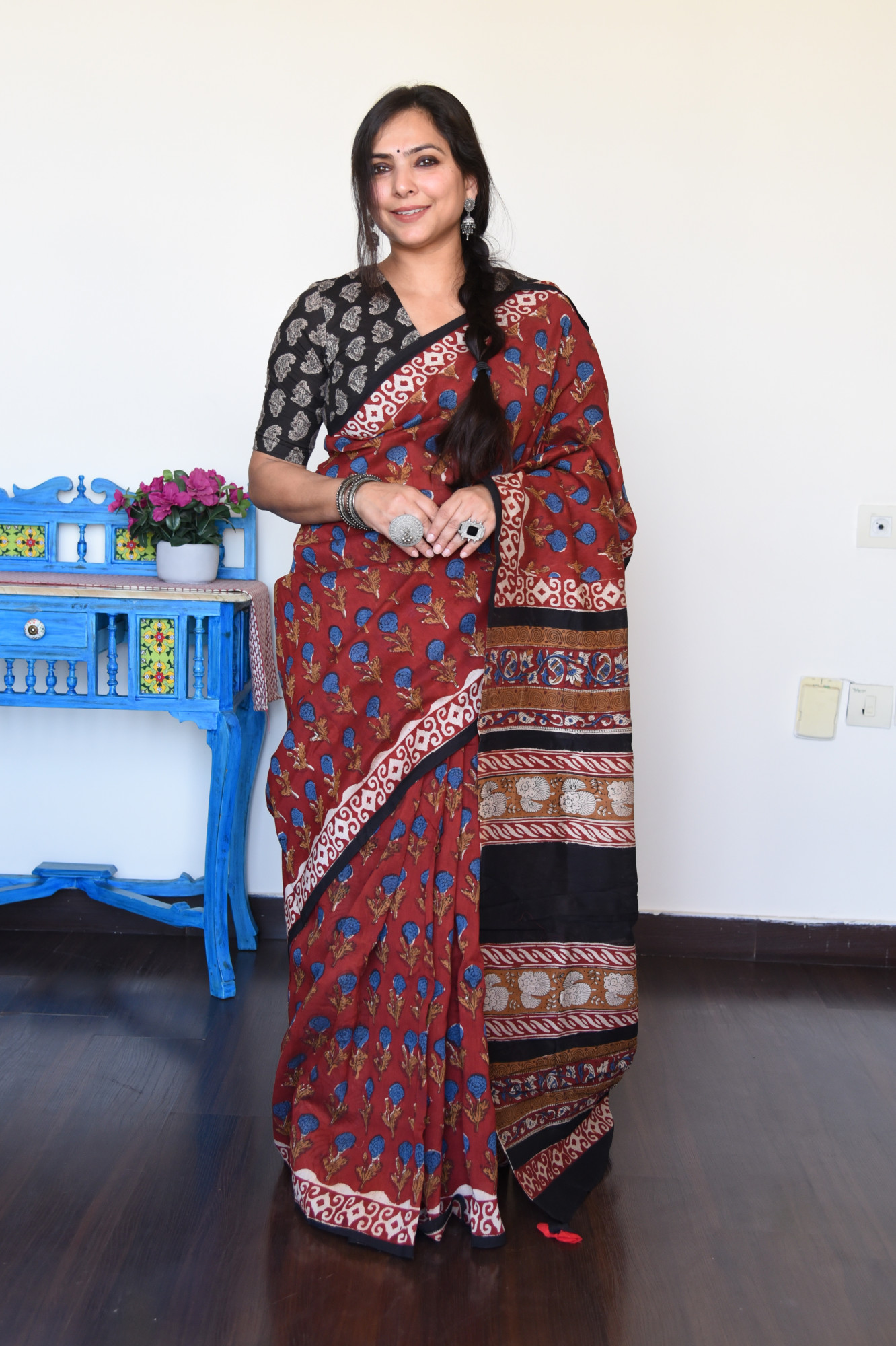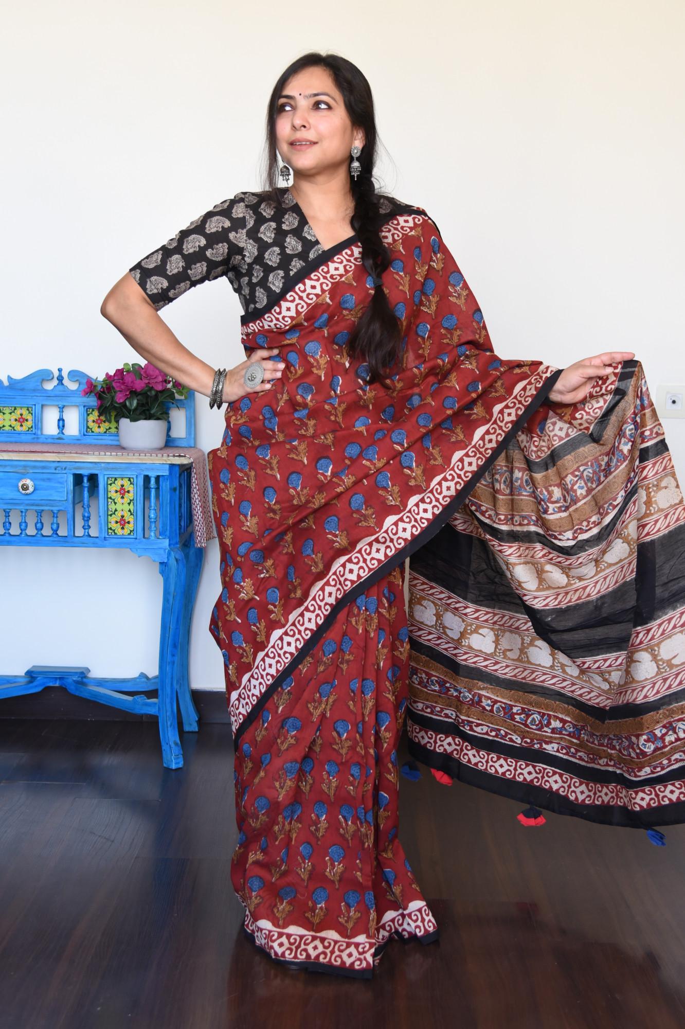 Hand block printed red and blue cotton silk saree with black selvedge without zari border.