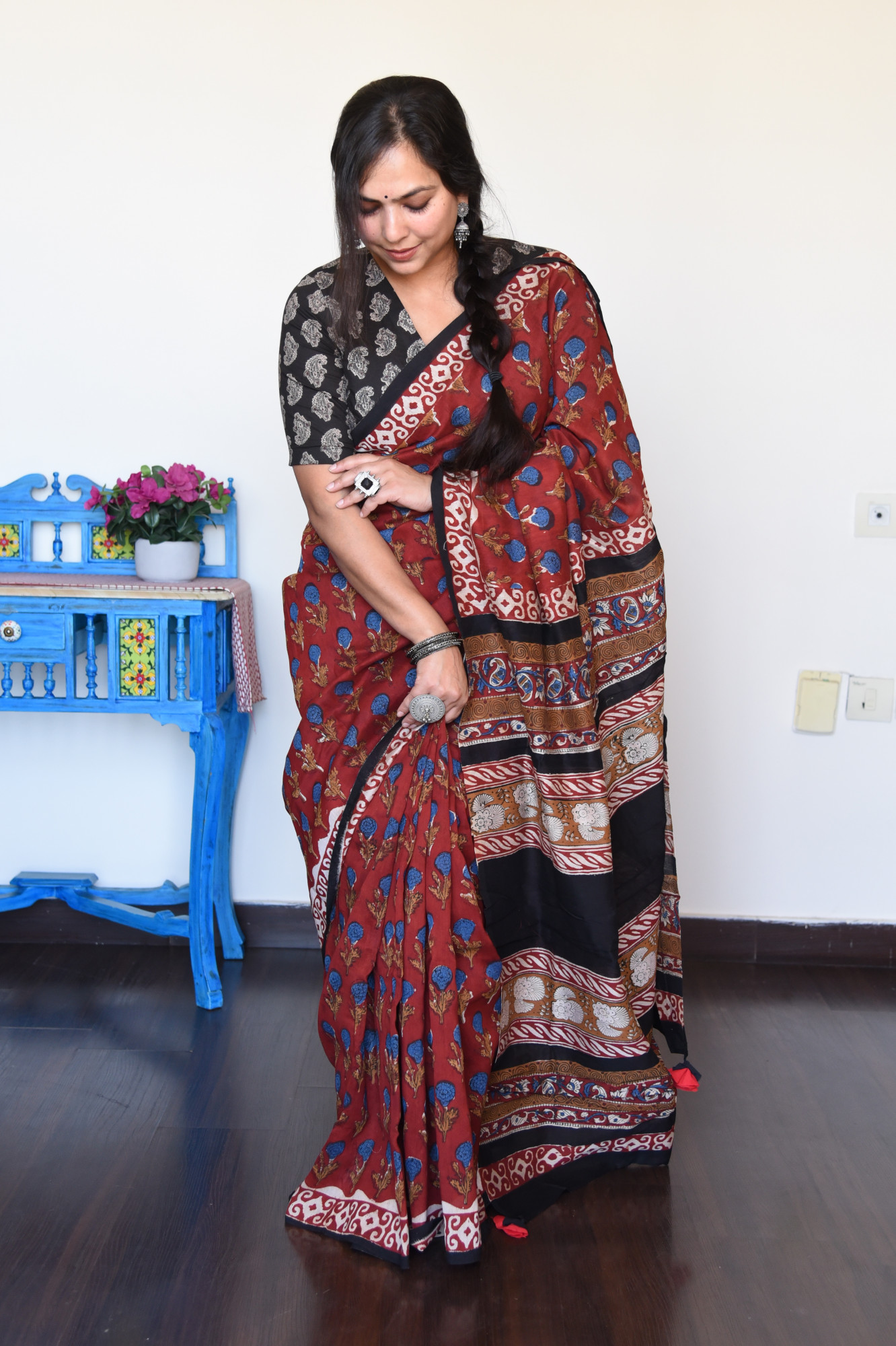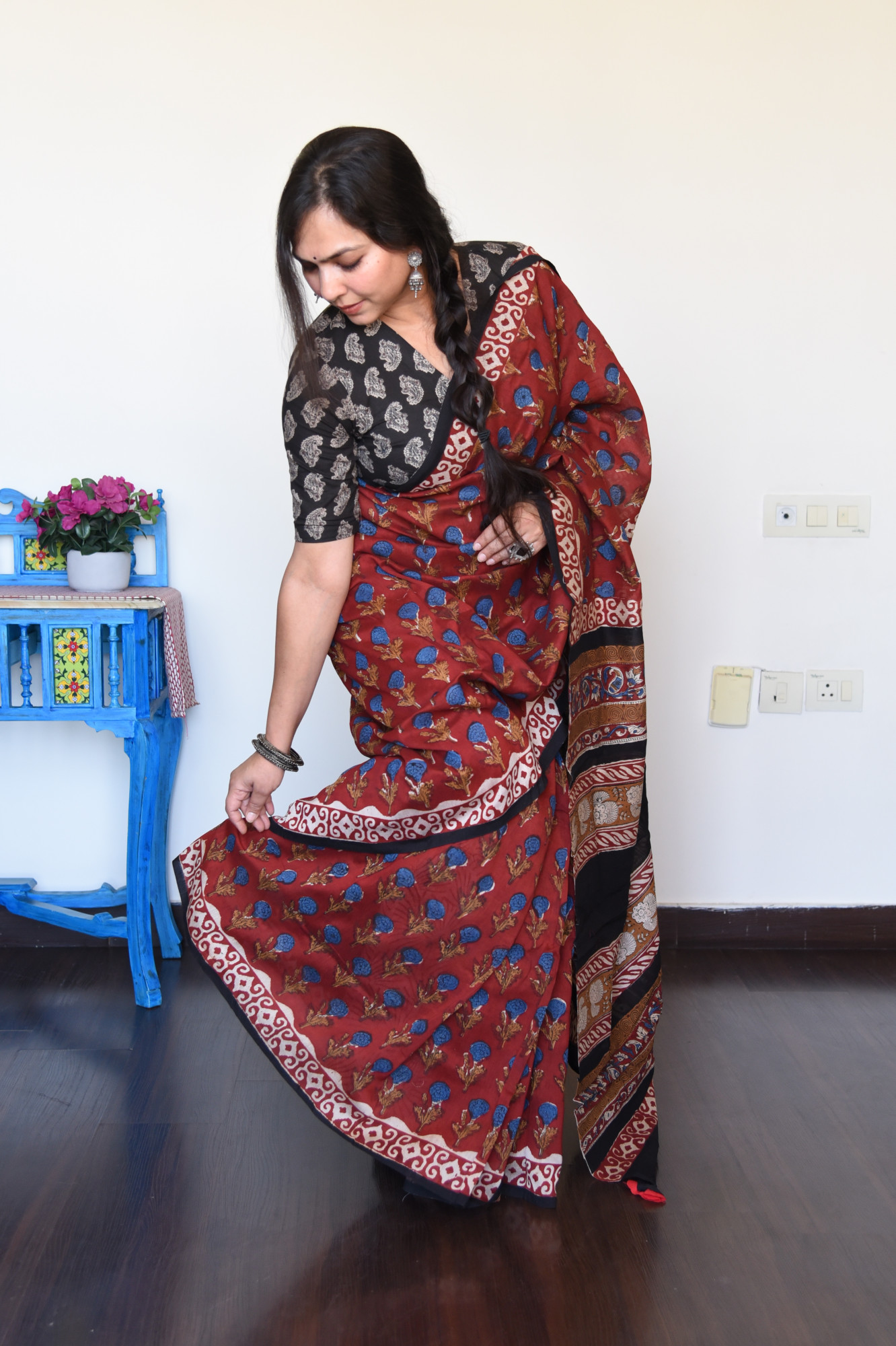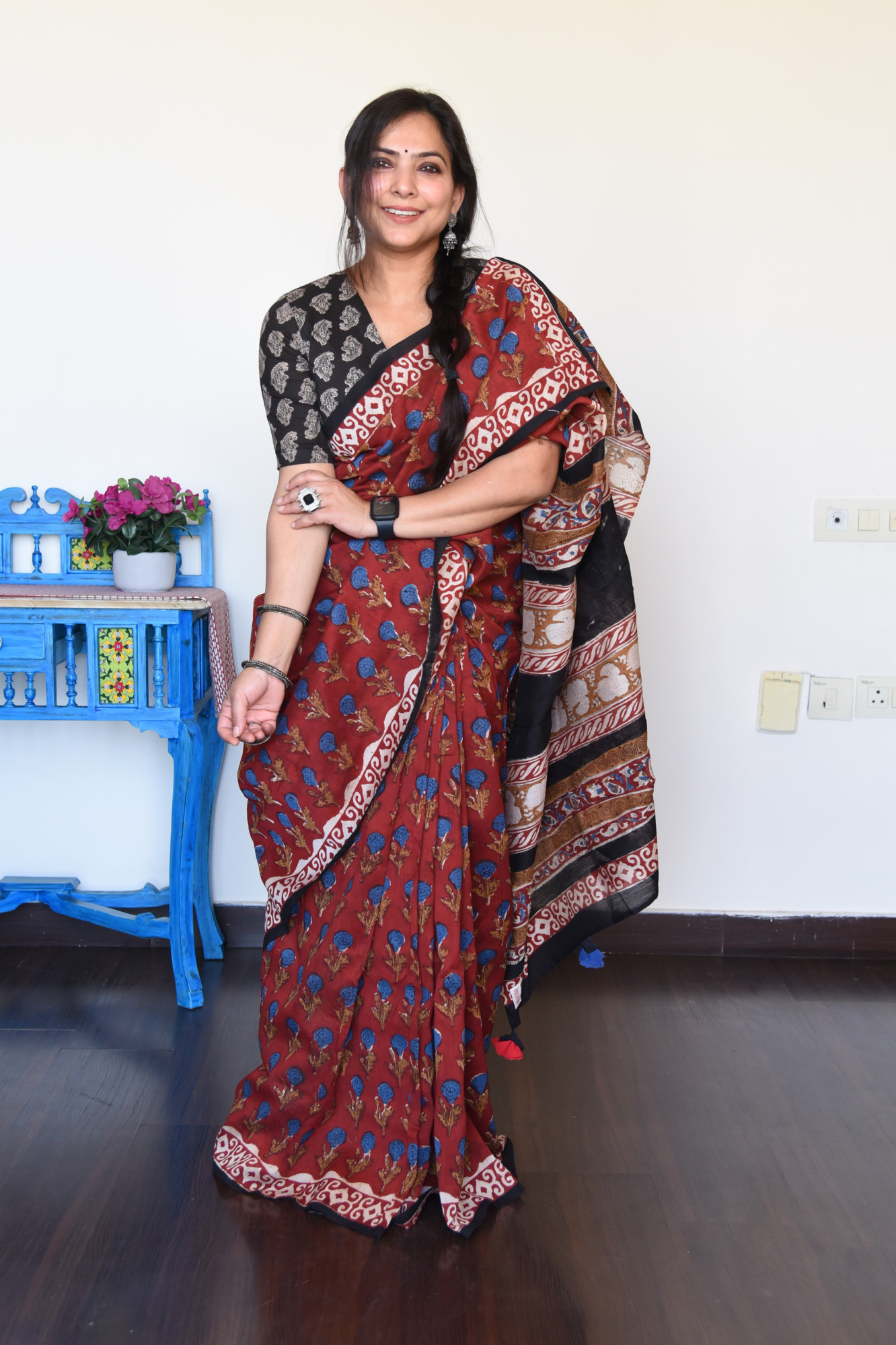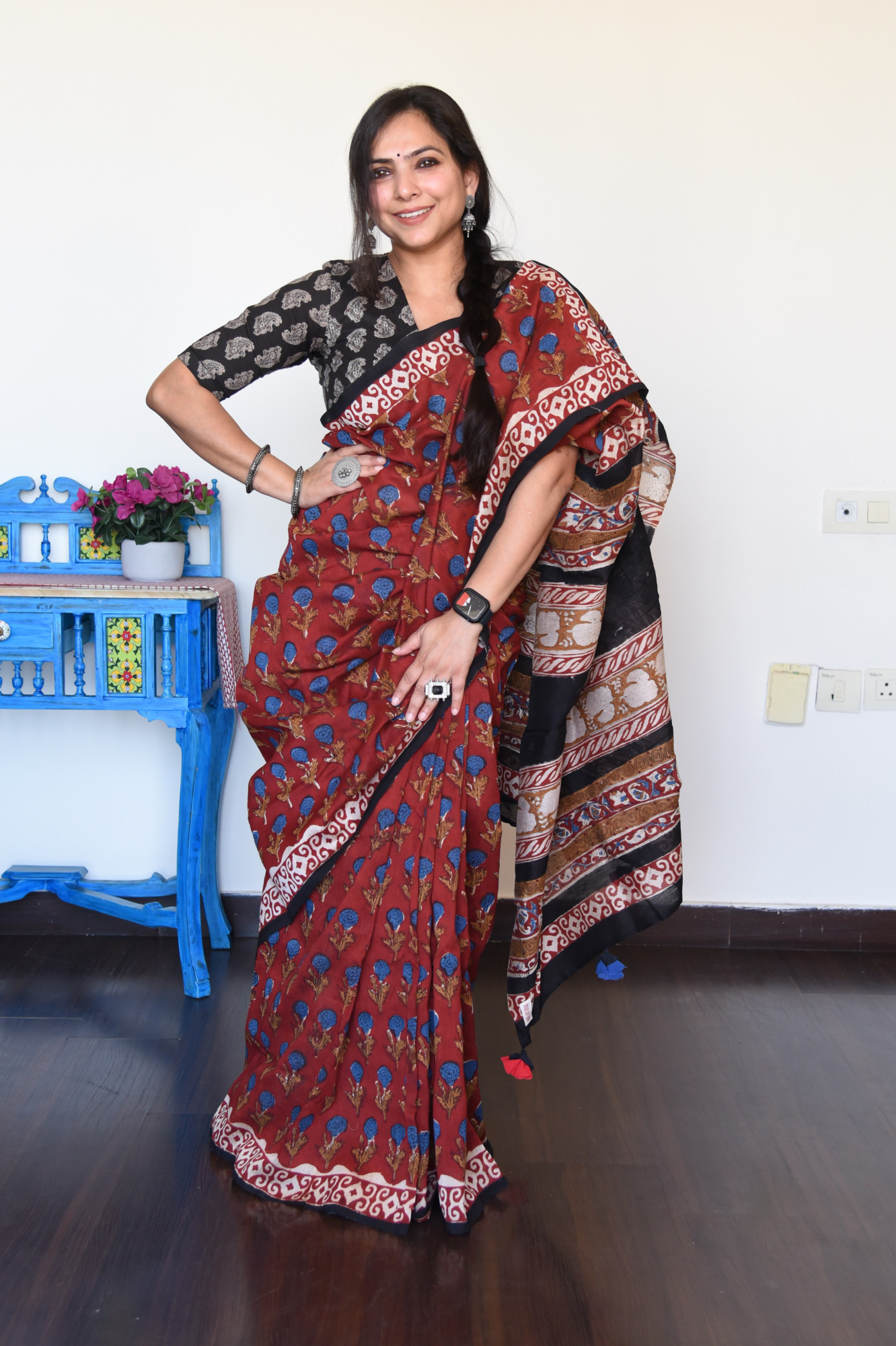 Hand block printed red and blue cotton silk saree with black selvedge without zari border.