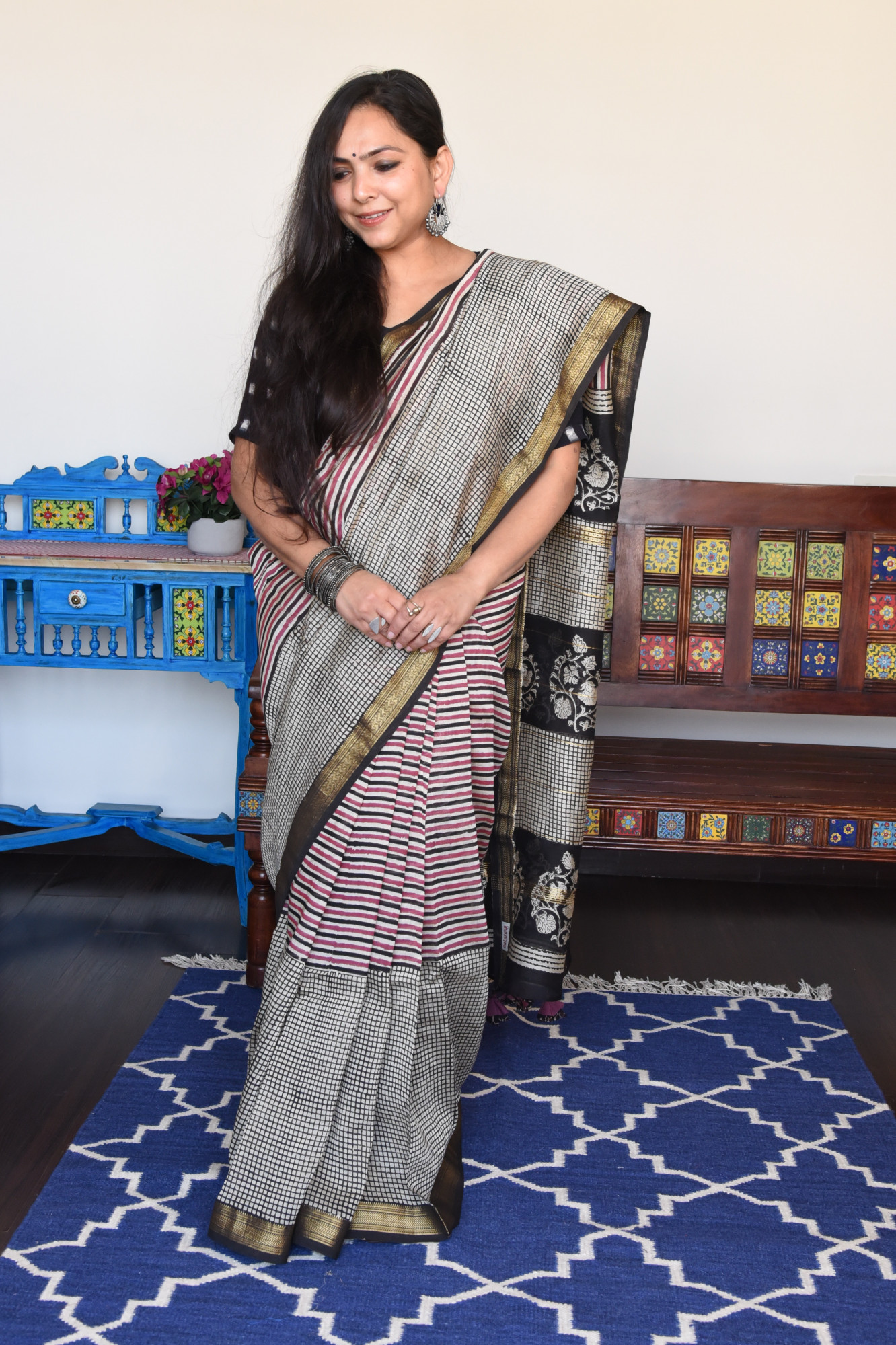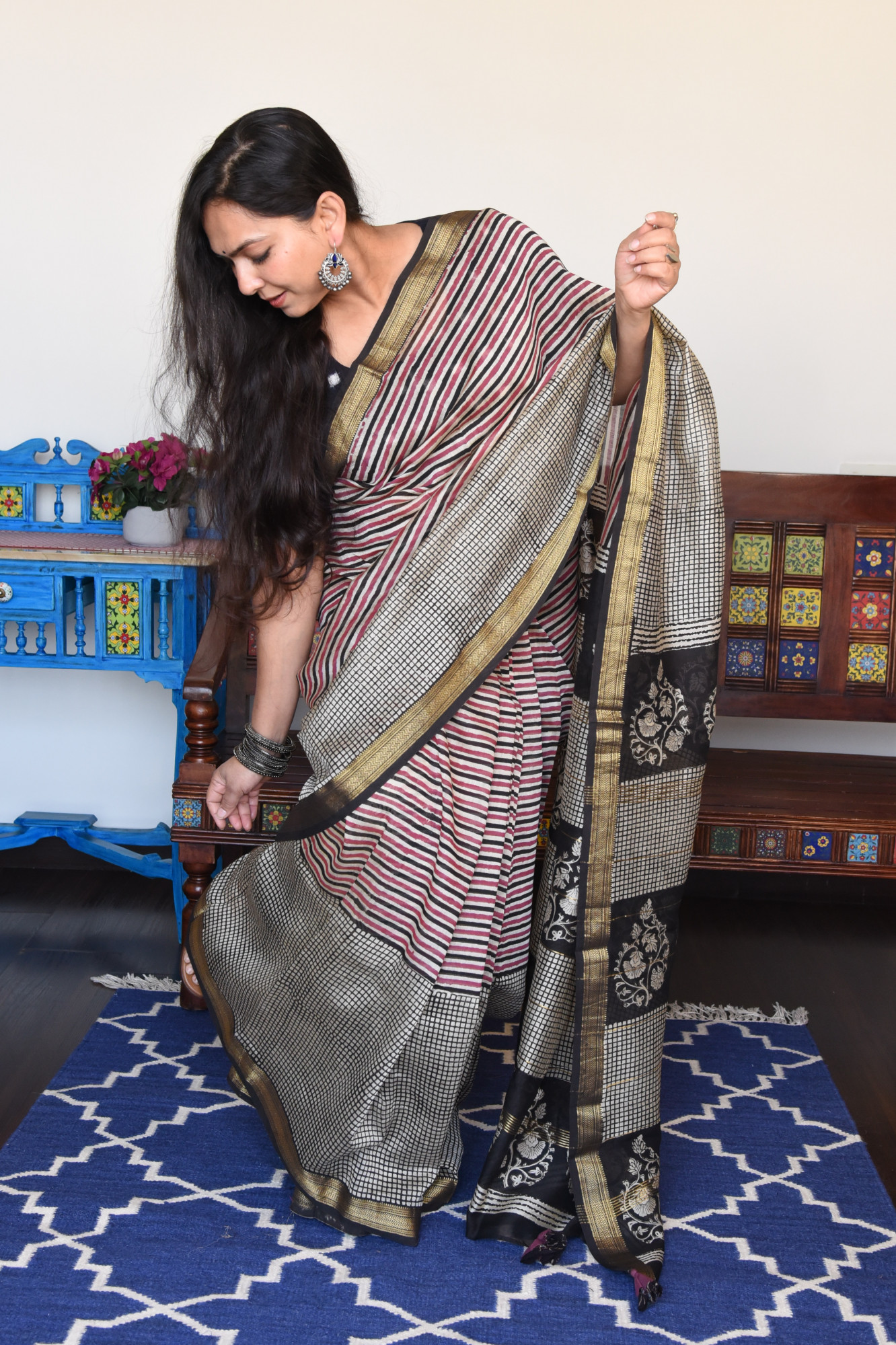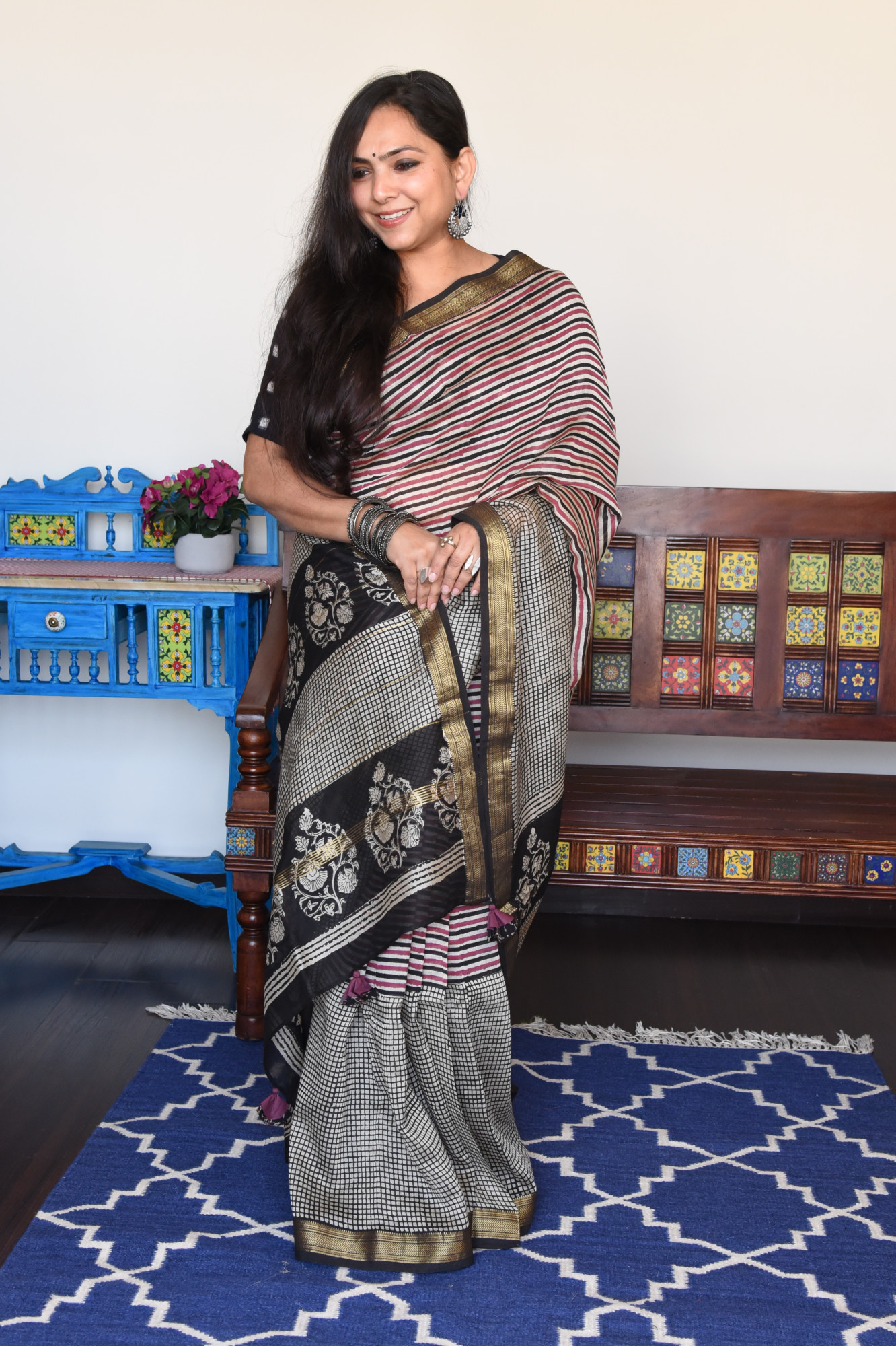 Hand block printed half black - dull pink striped - half small check beige - black cotton silk saree with golden zari border.