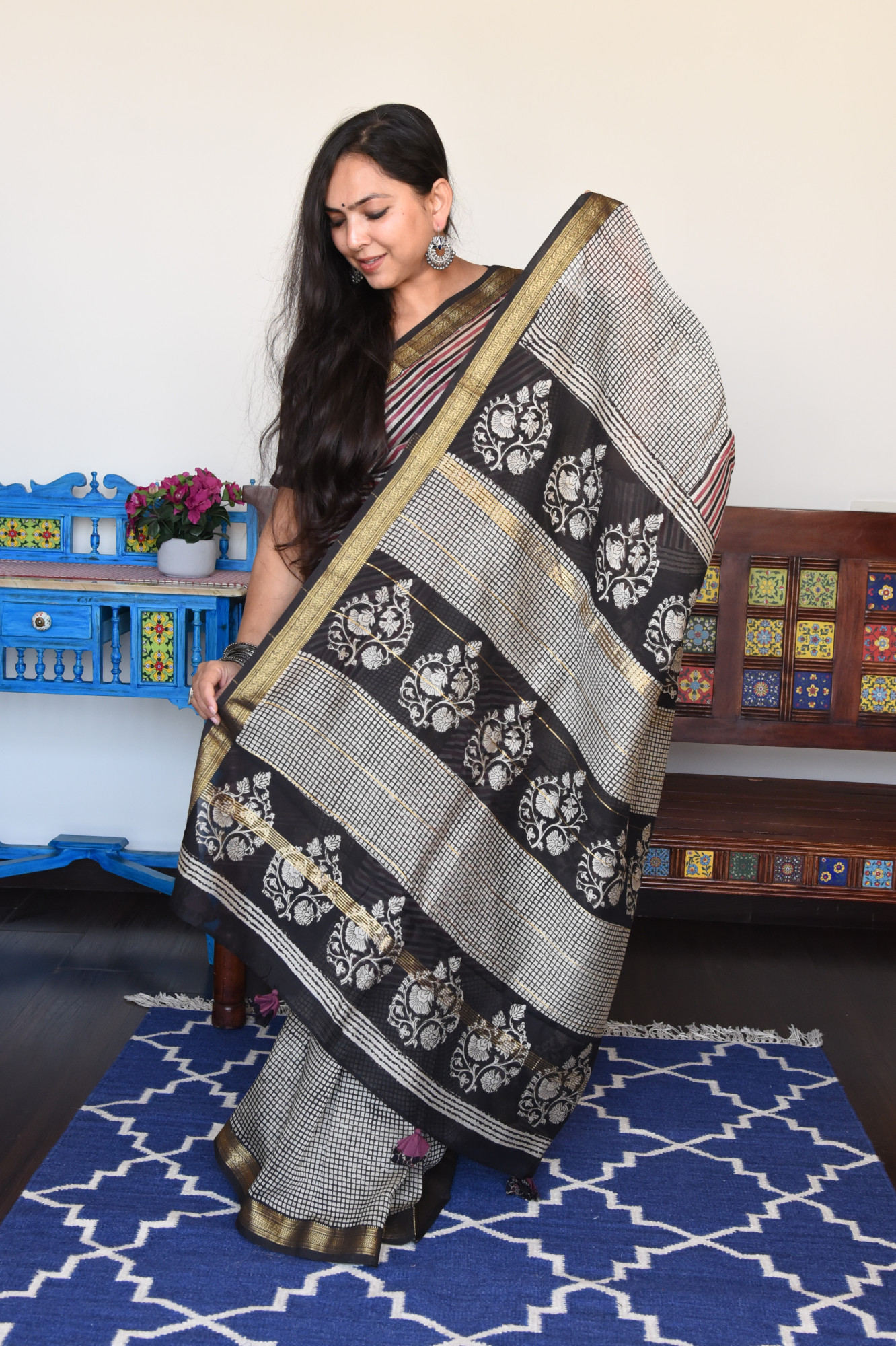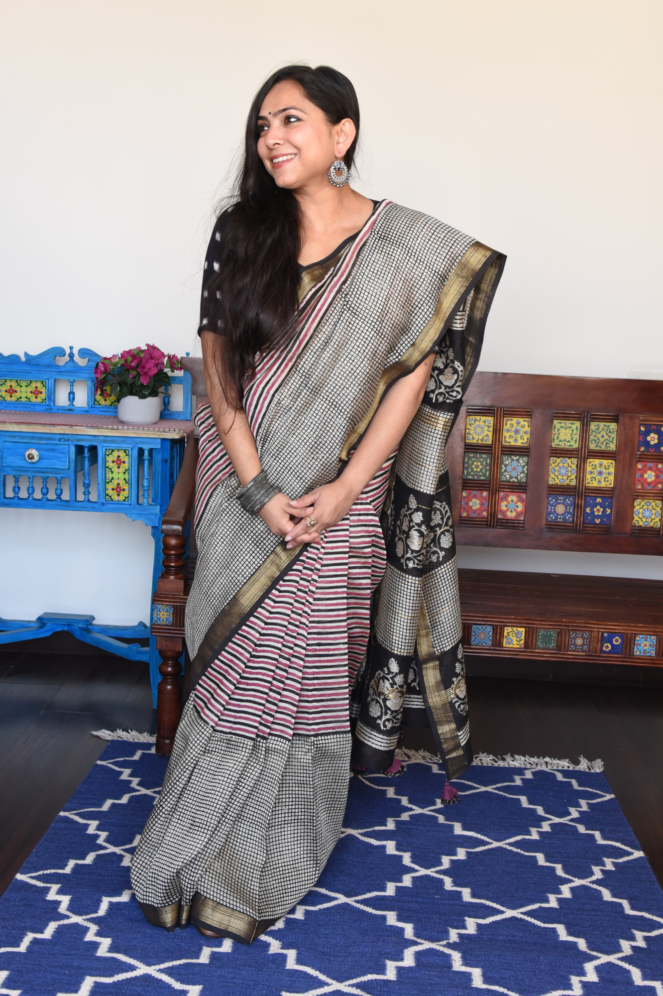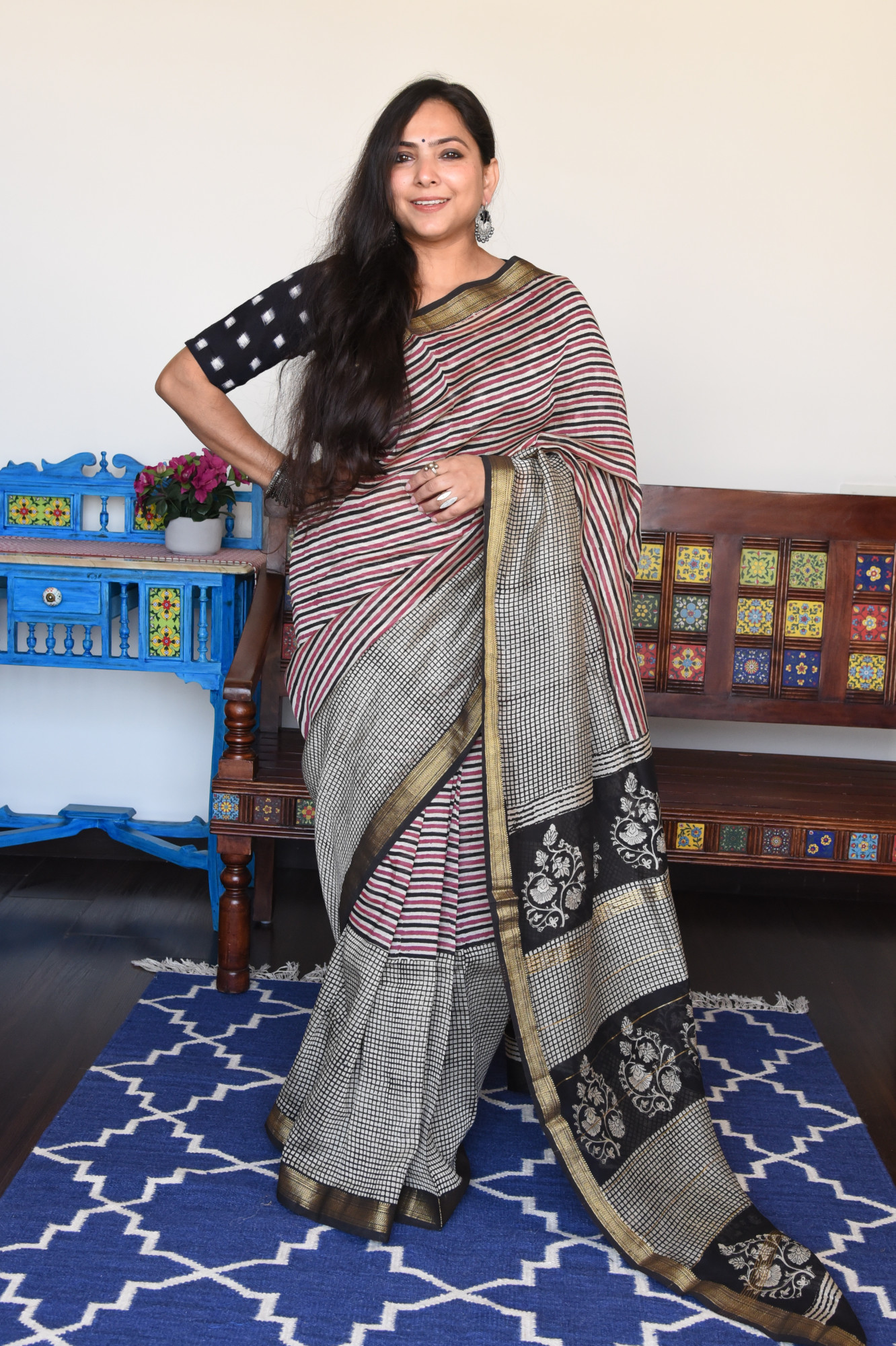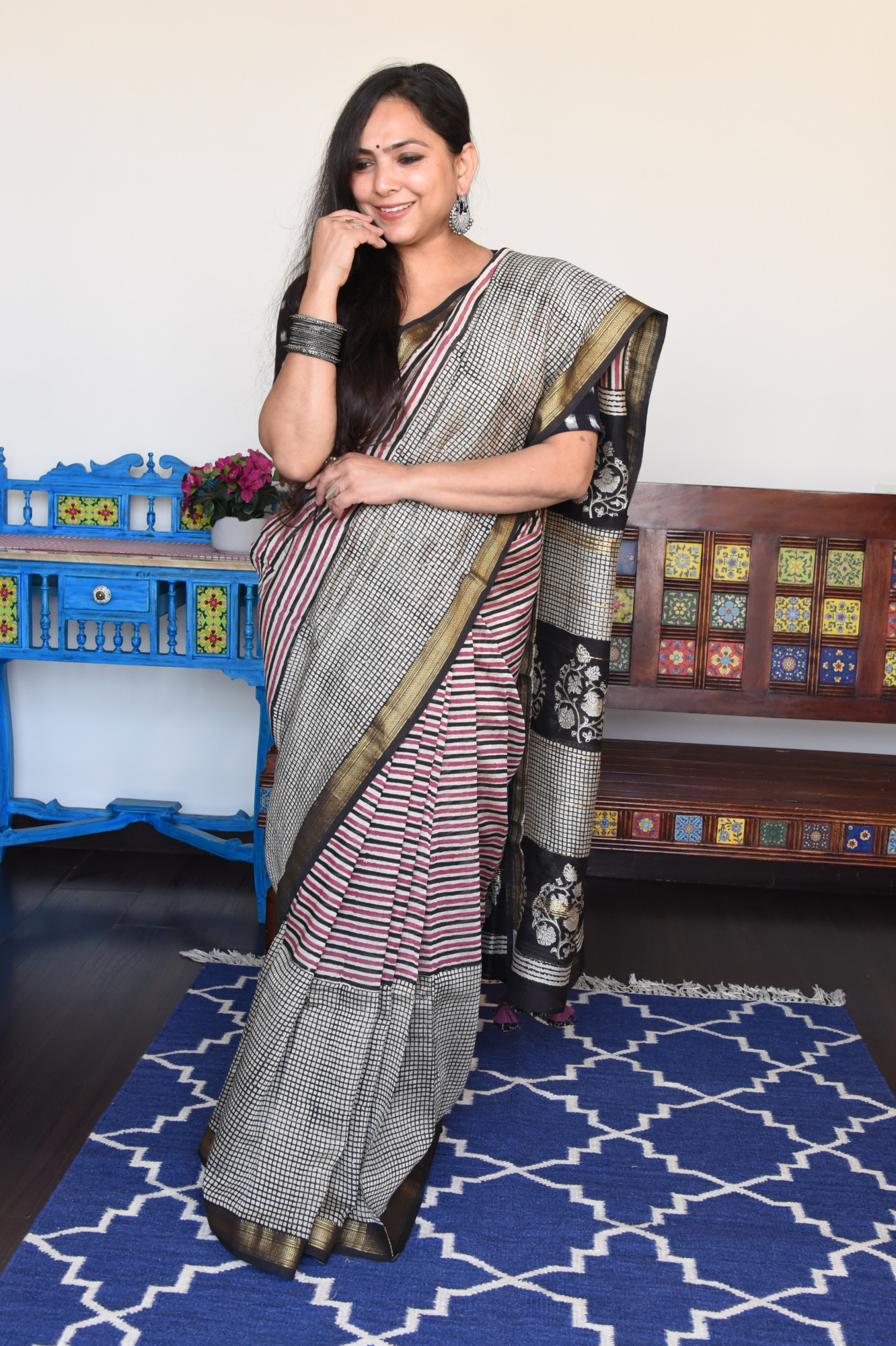 Hand block printed half black - dull pink striped - half small check beige - black cotton silk saree with golden zari border.