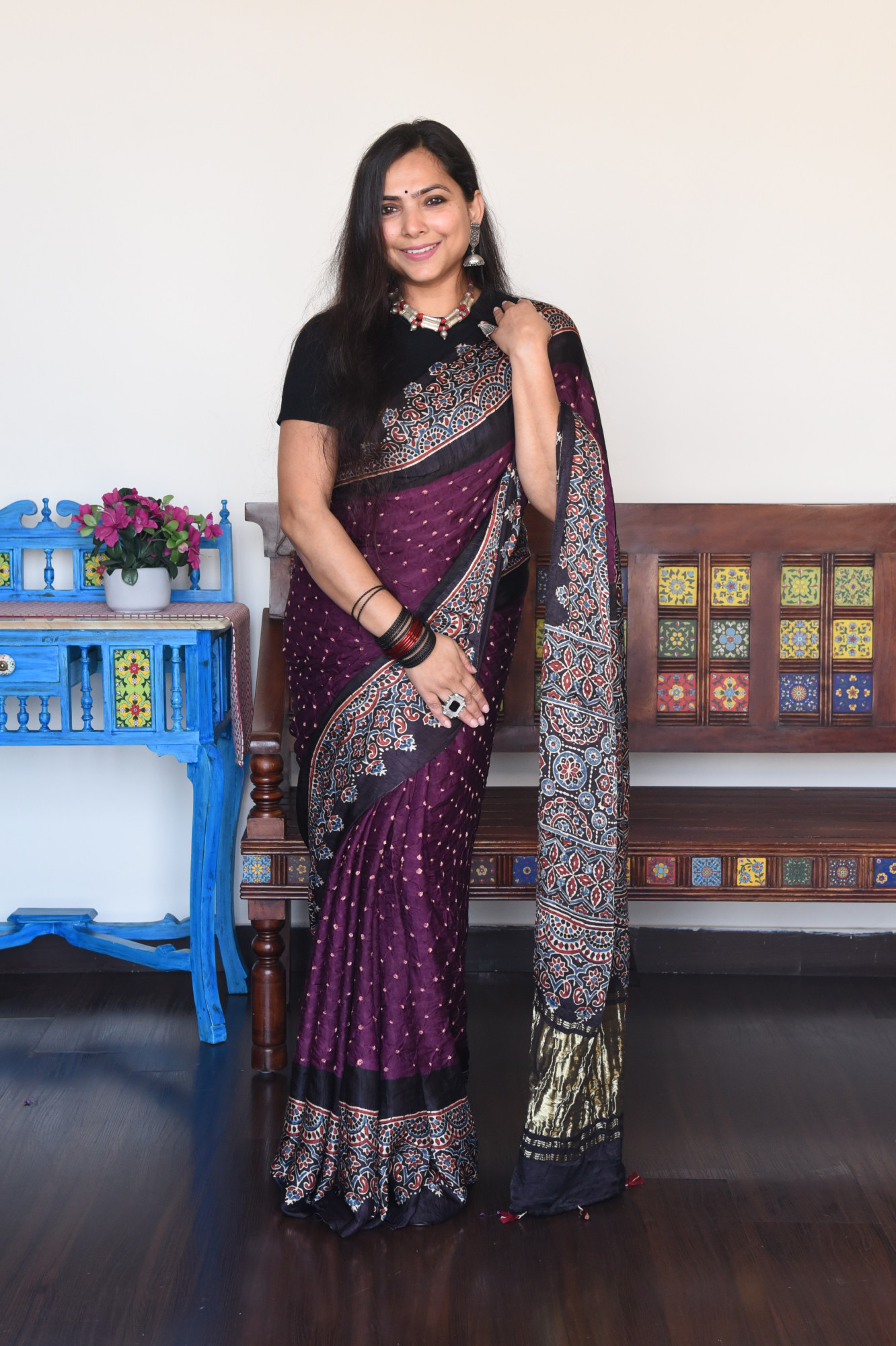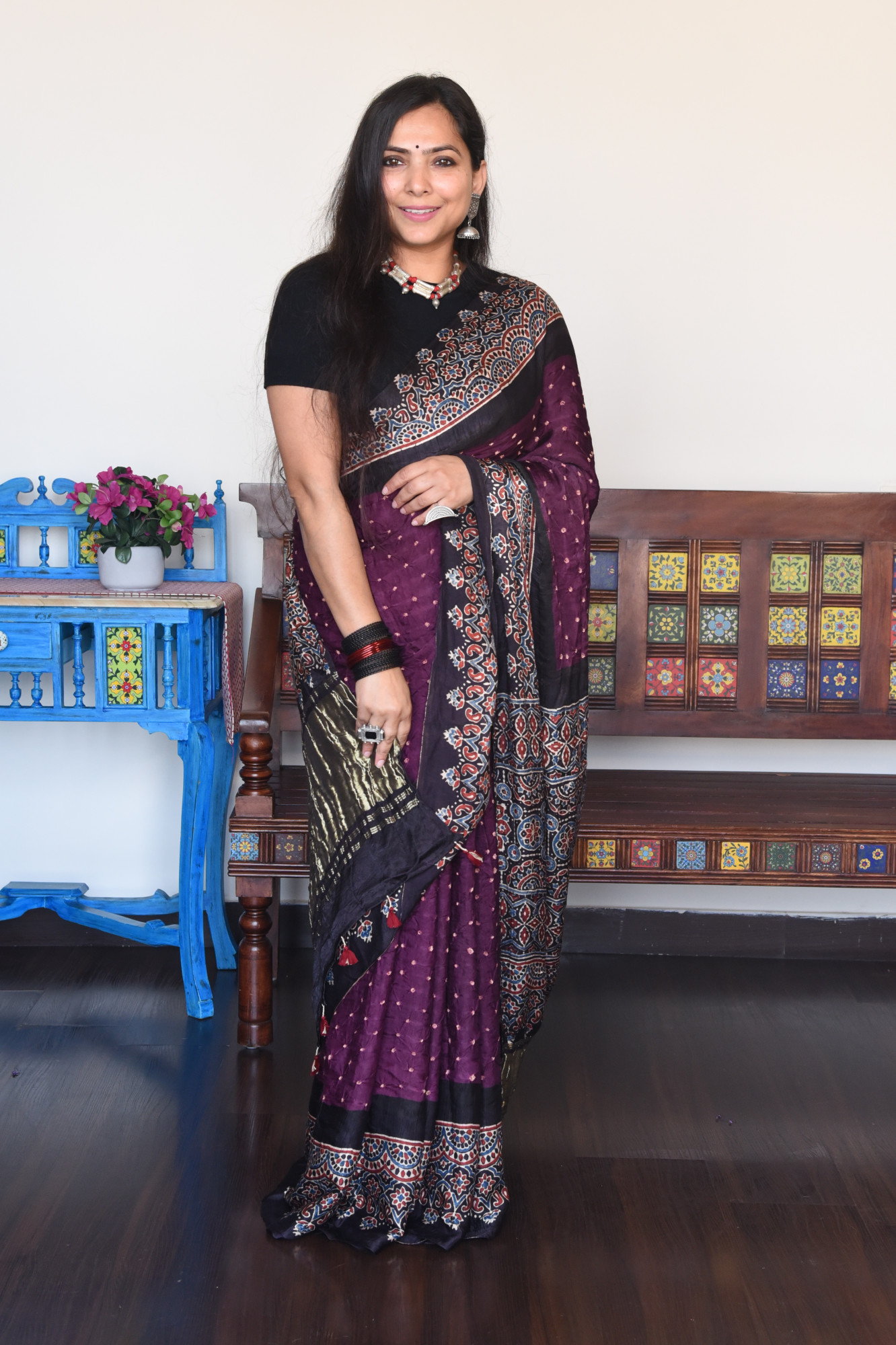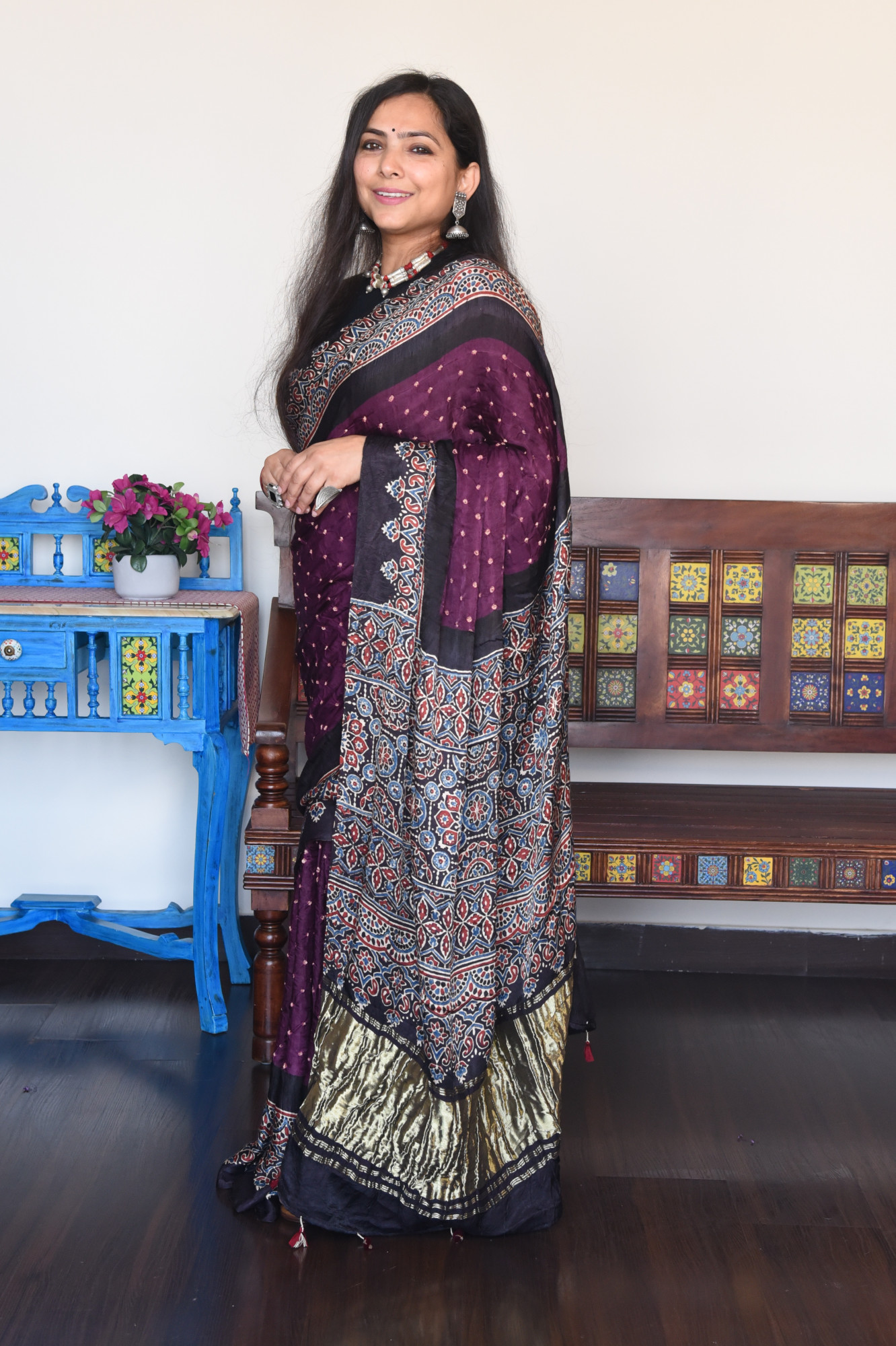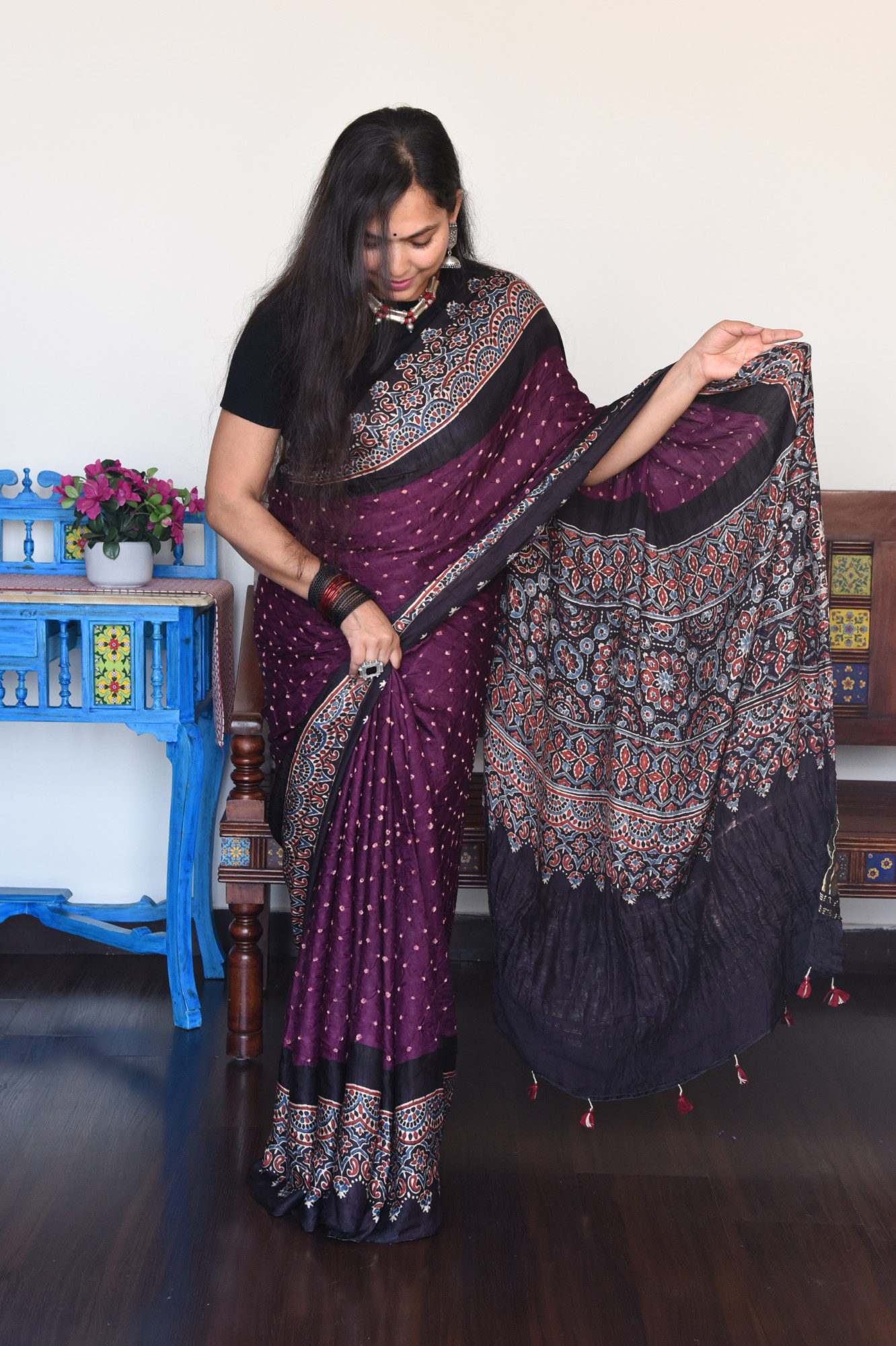 Hand-tied Bandhani saree with Handblock printed Ajrakh border and golden tissue Ajrakh palla. Accessorised with tassles.