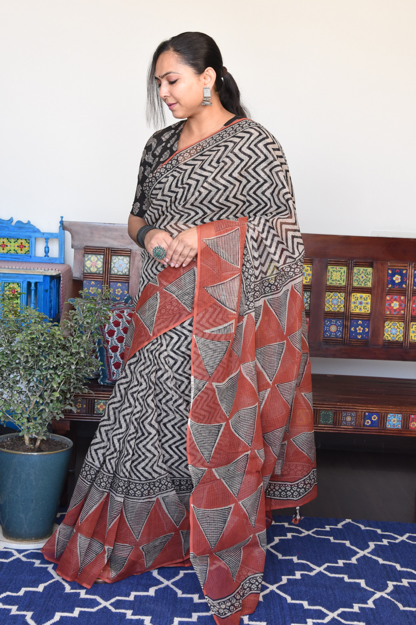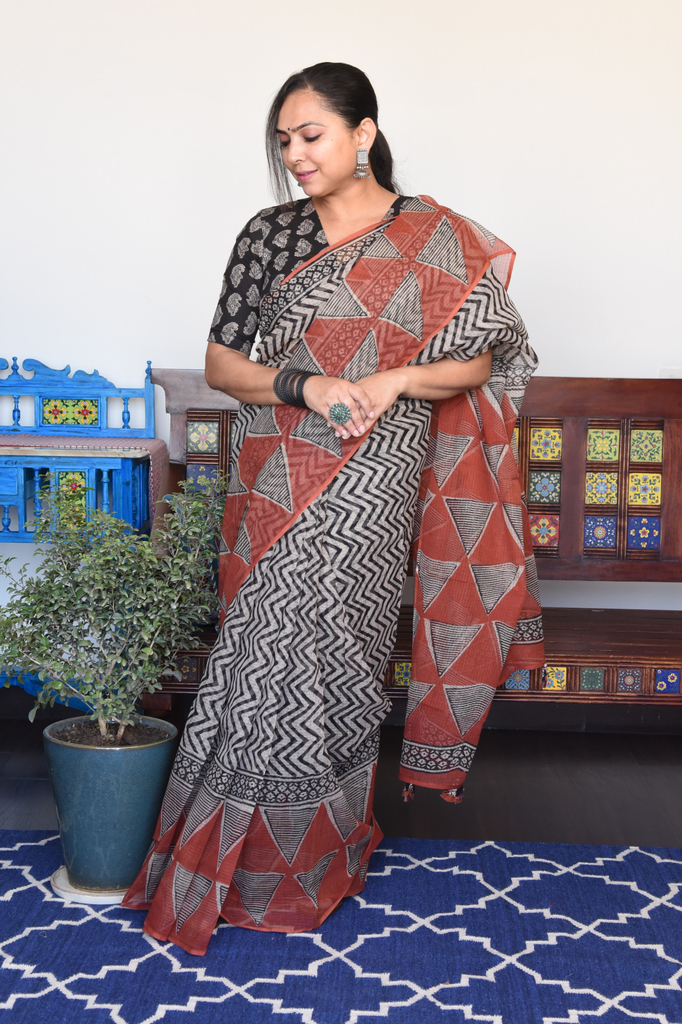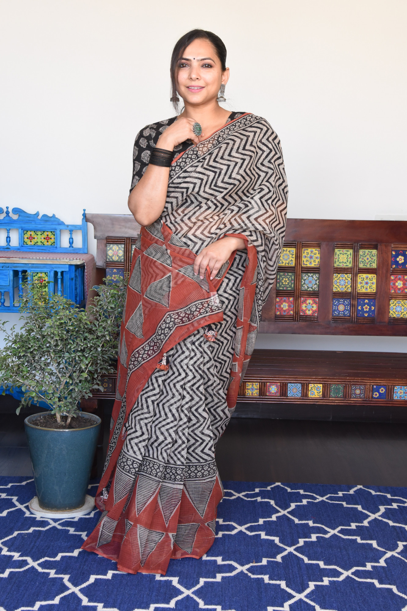 Handblock printed zig-zag black red kota doria cotton saree. Accessorised with fabric tassels.