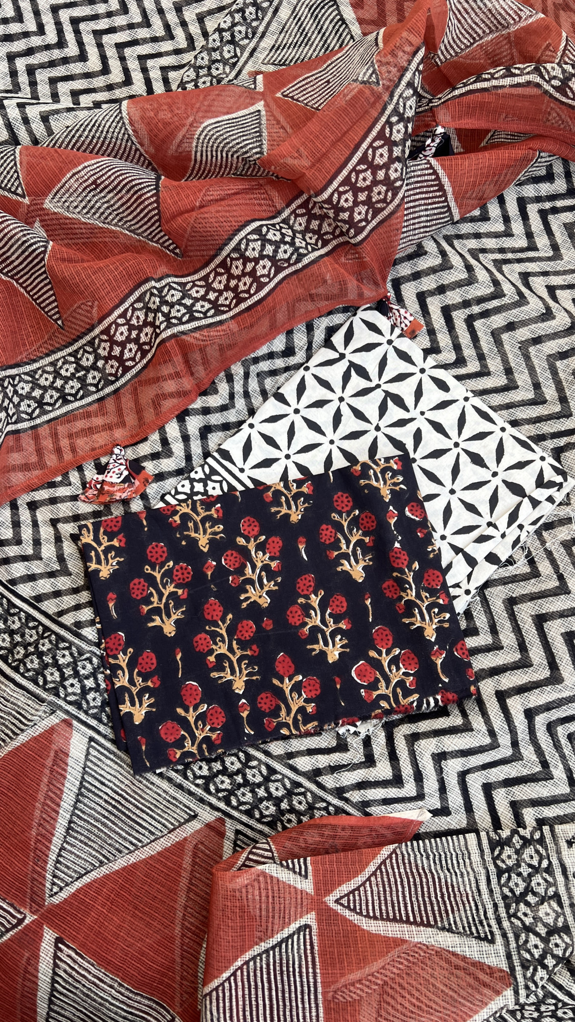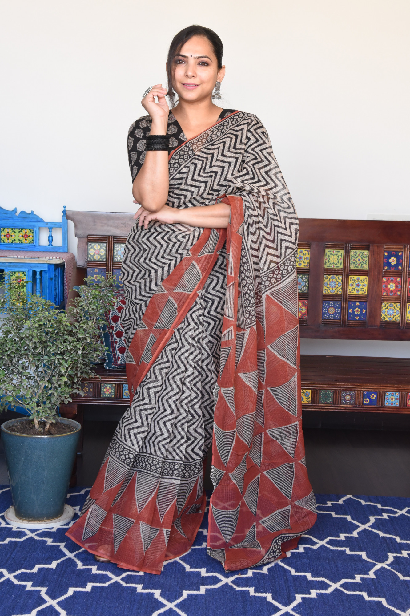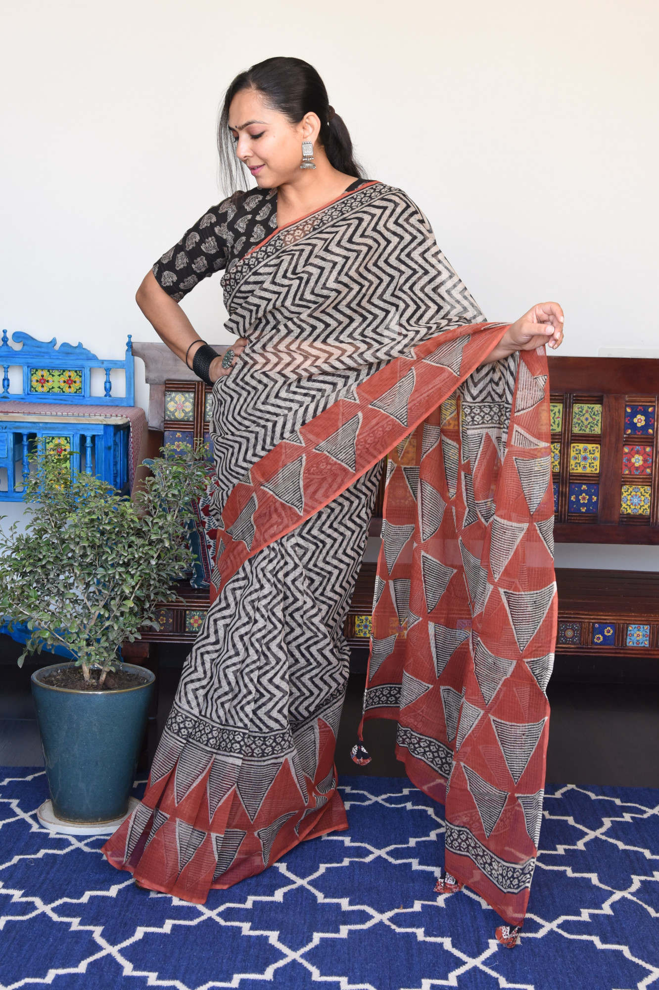 Handblock printed zig-zag black red kota doria cotton saree. Accessorised with fabric tassels.