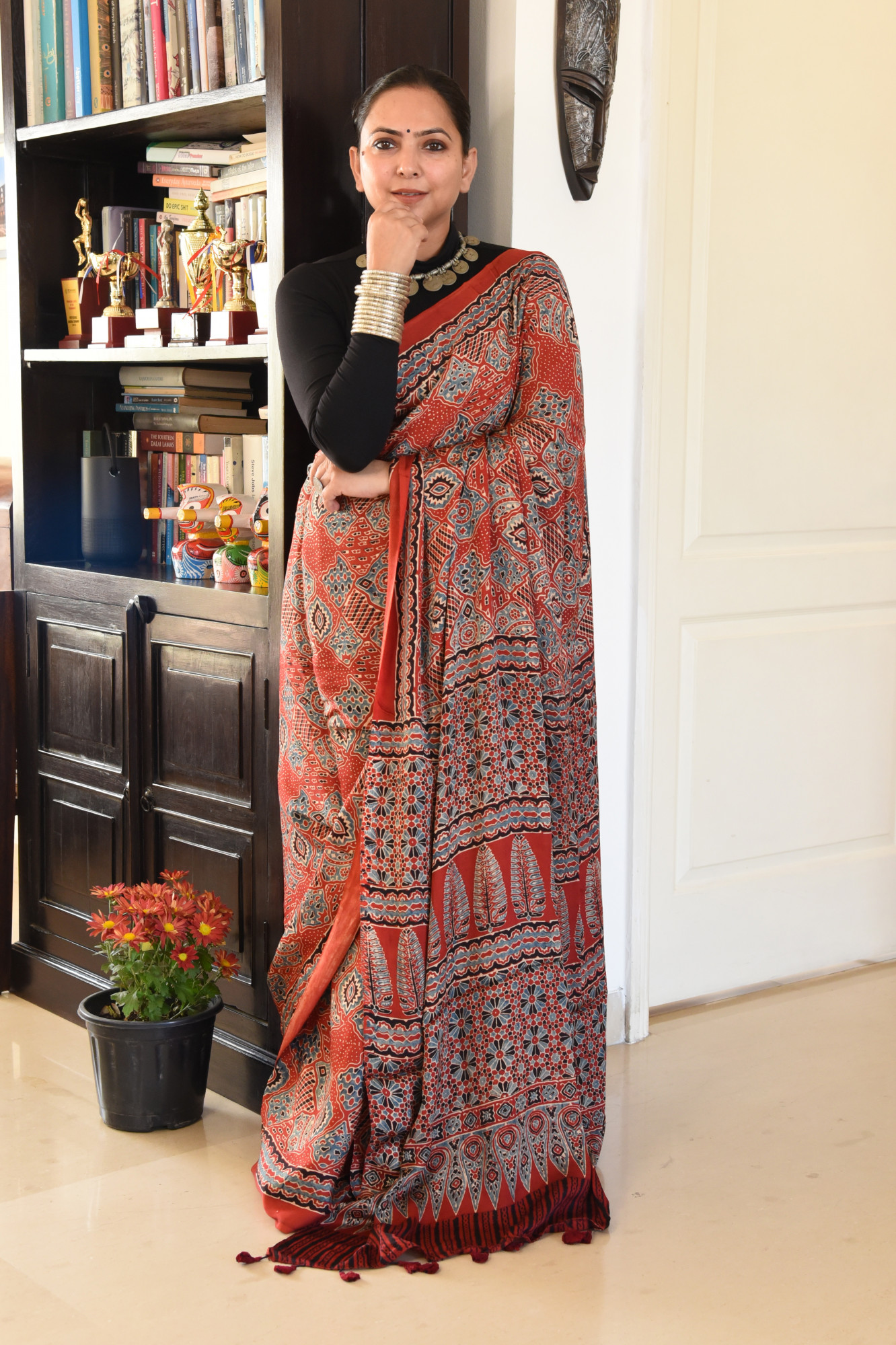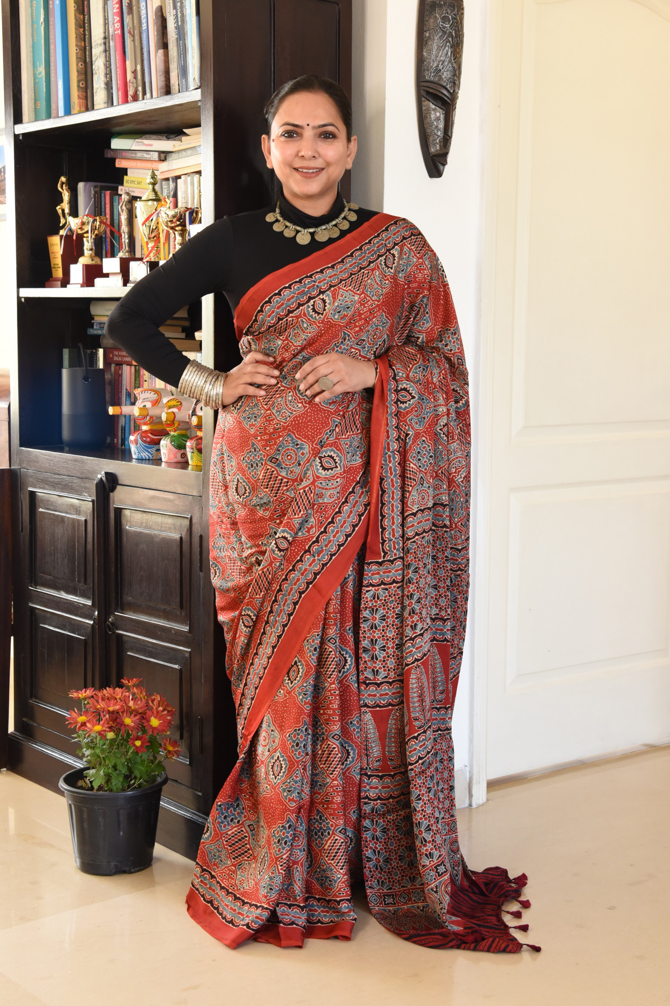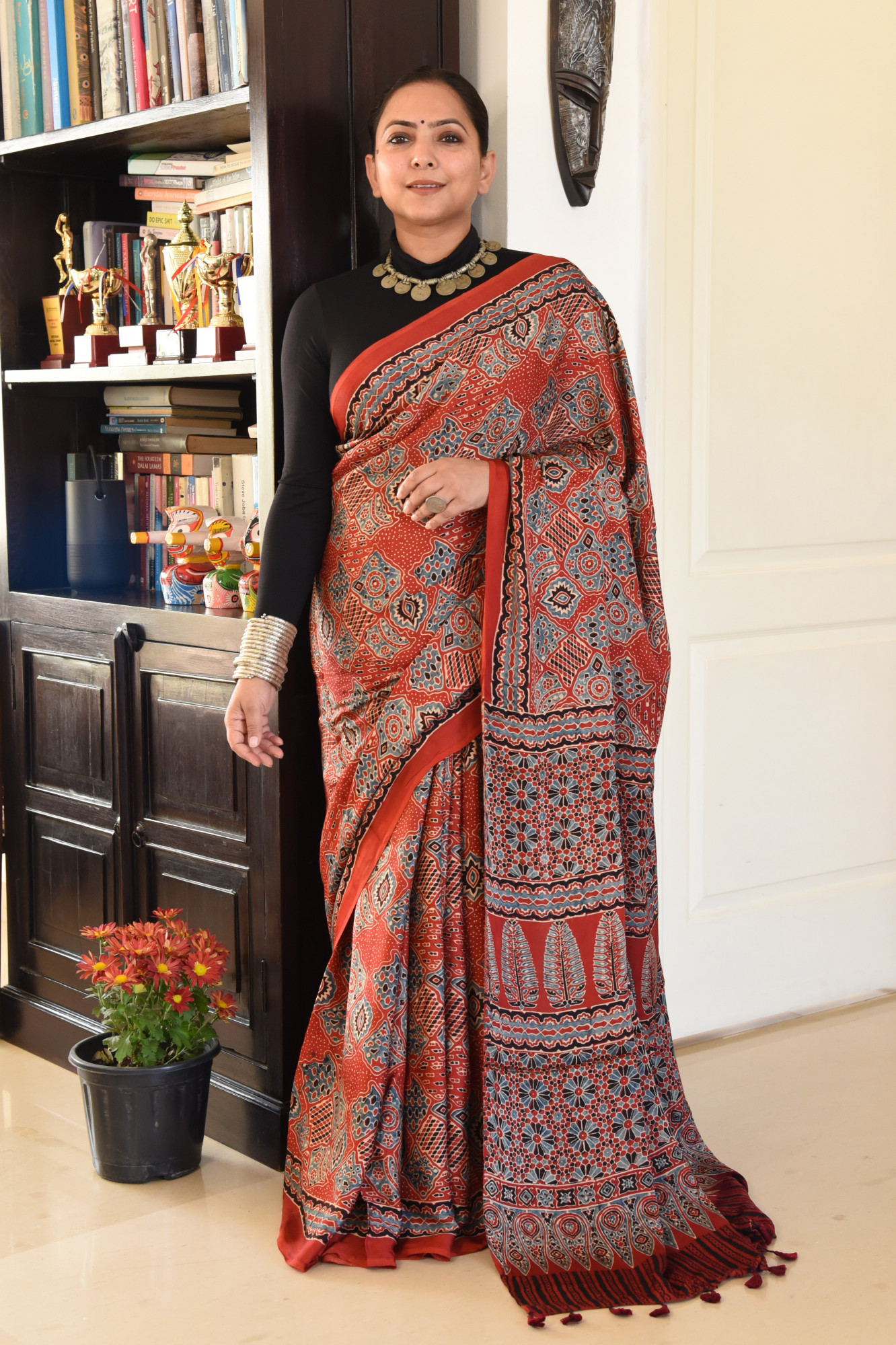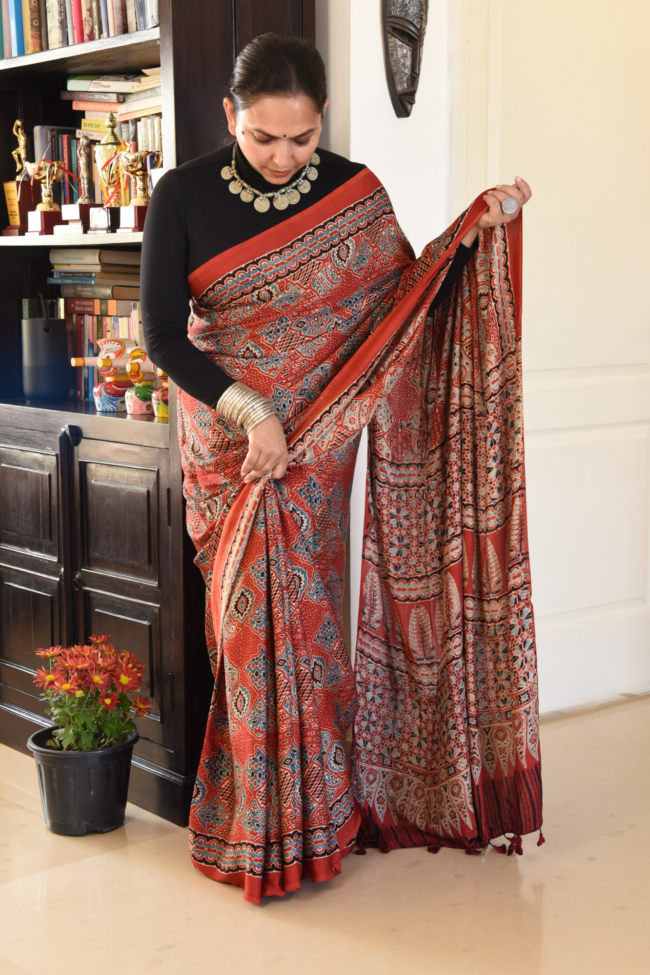Handcrafted - Hand block printed with environment friendly natural dyes, modal silk saree with symmetrical geometric patterns, symbolising elements in nature and inspired by Persian art . A beautiful ornamental pattern on the palla is sure to take your breath away. Accessorised with tassles.