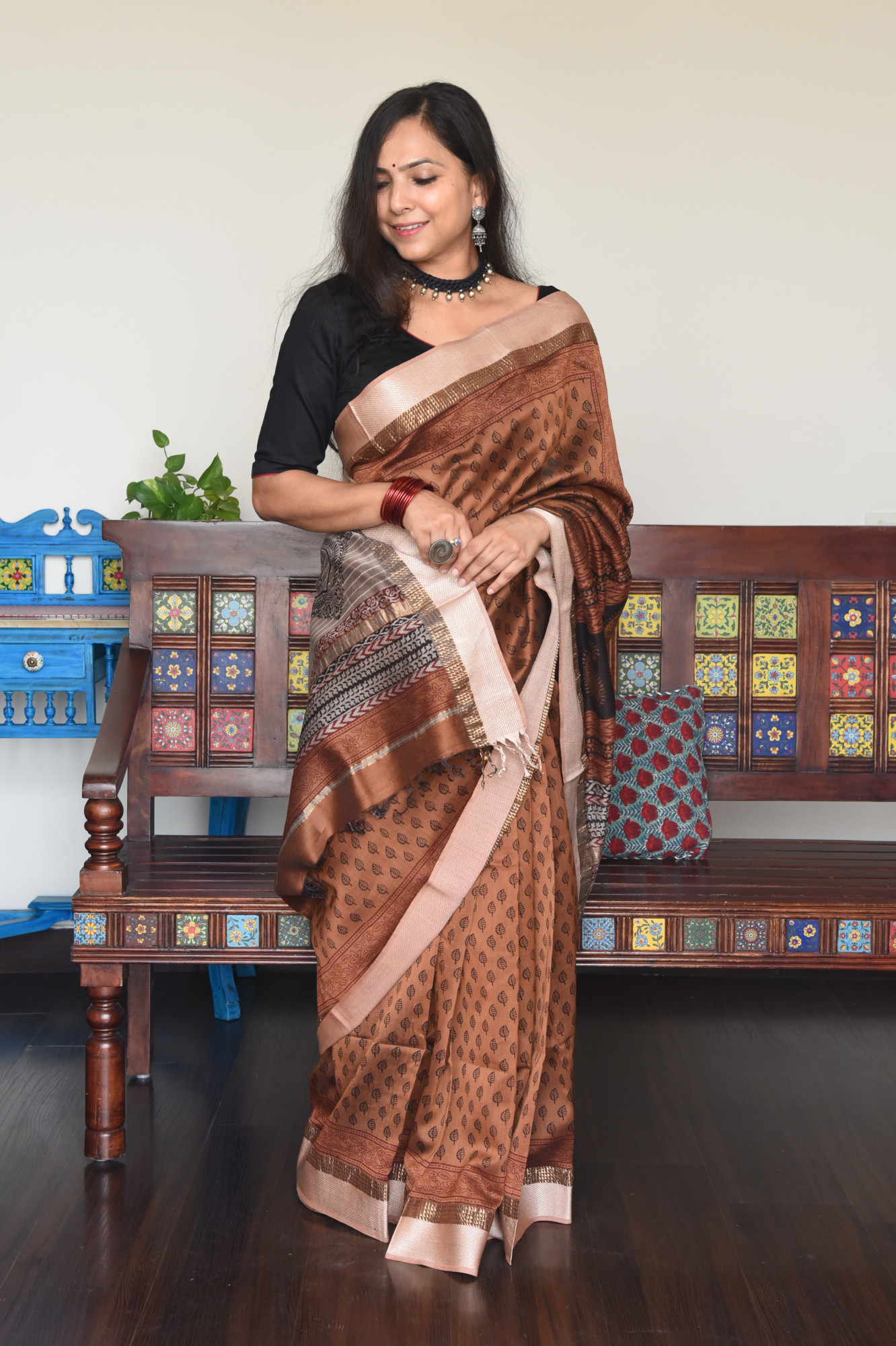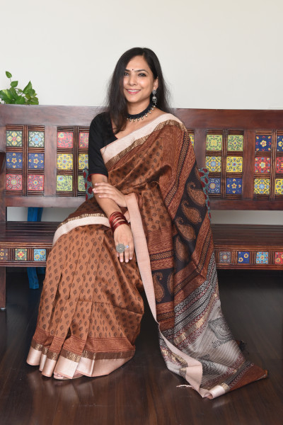 Handblock Bagh on Handwoven Golden brown Maheshwari cotton silk saree with woven resham border on each side and elaborate palla.