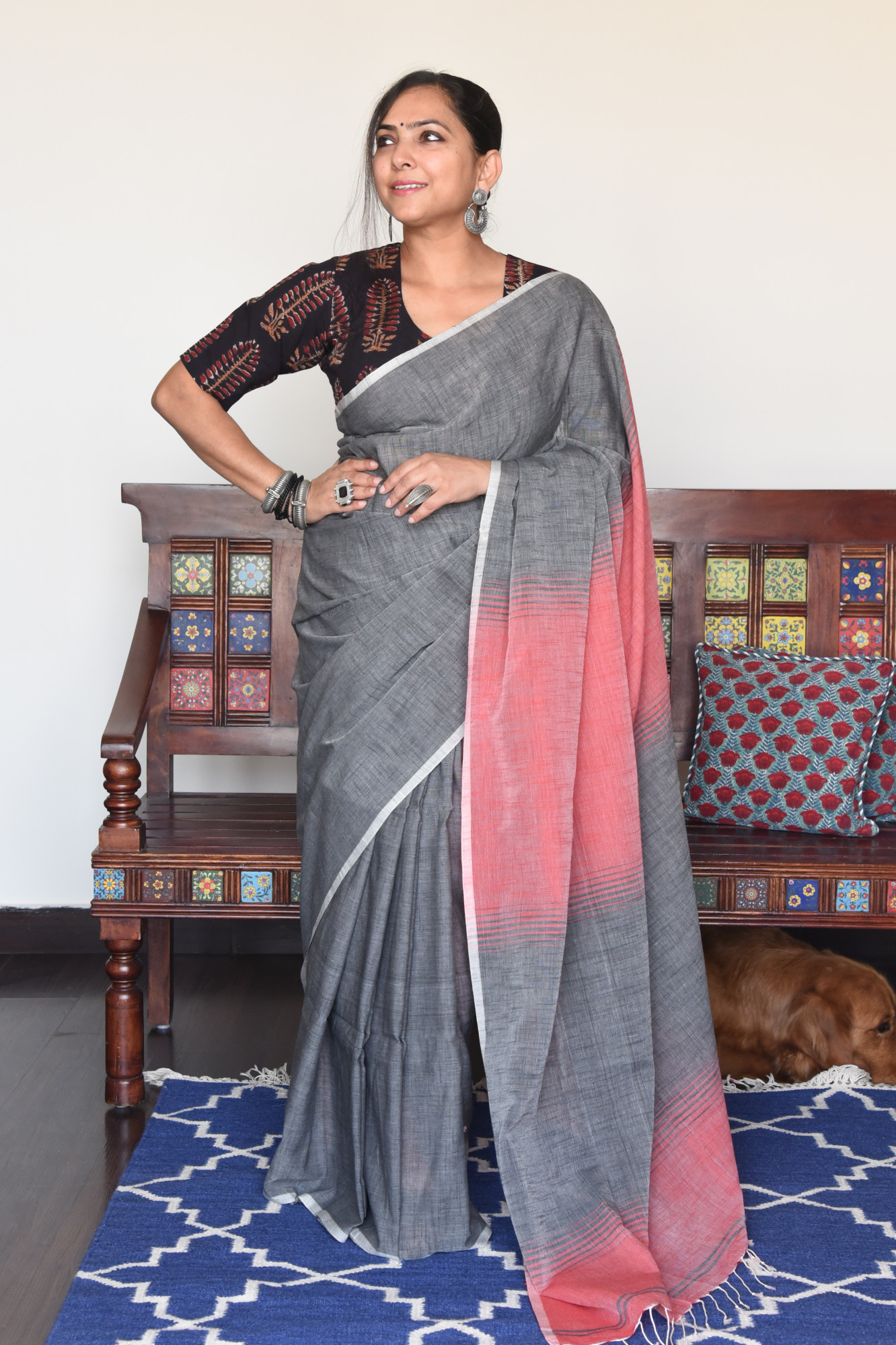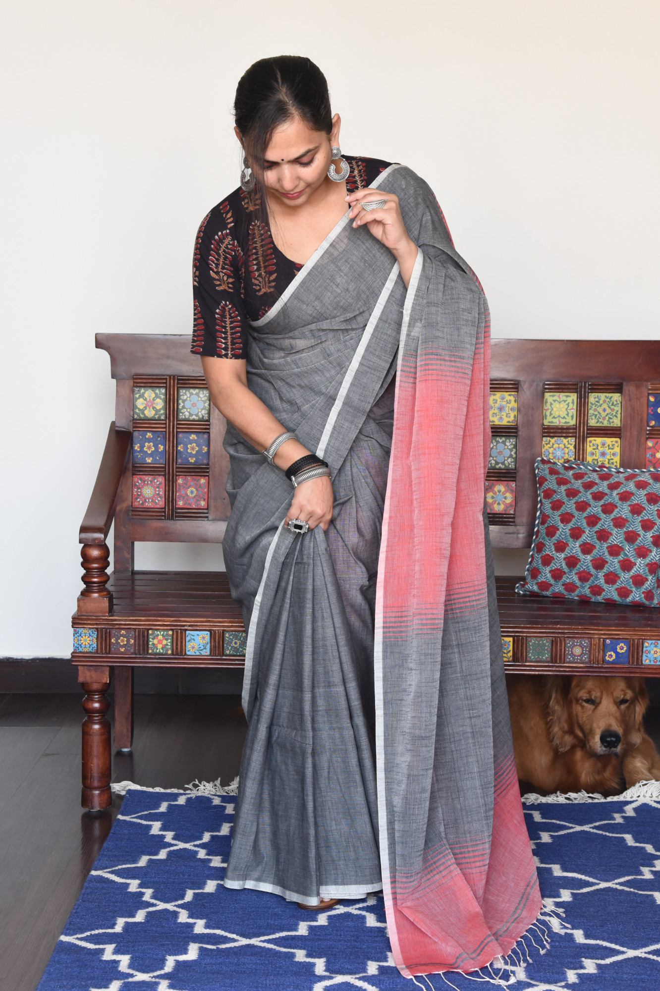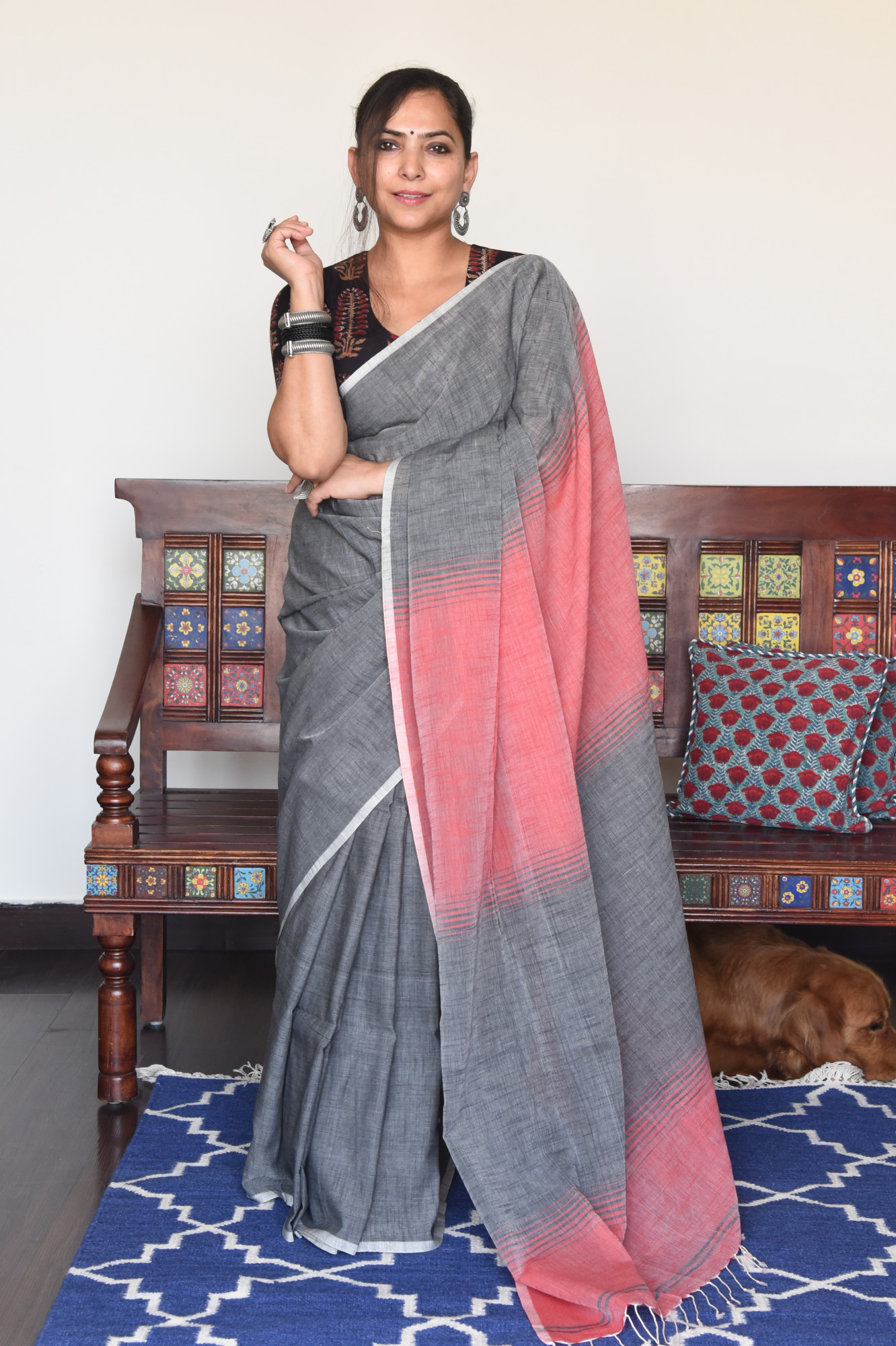 Handwoven pure grey Bengal cotton saree with salmon red palla.