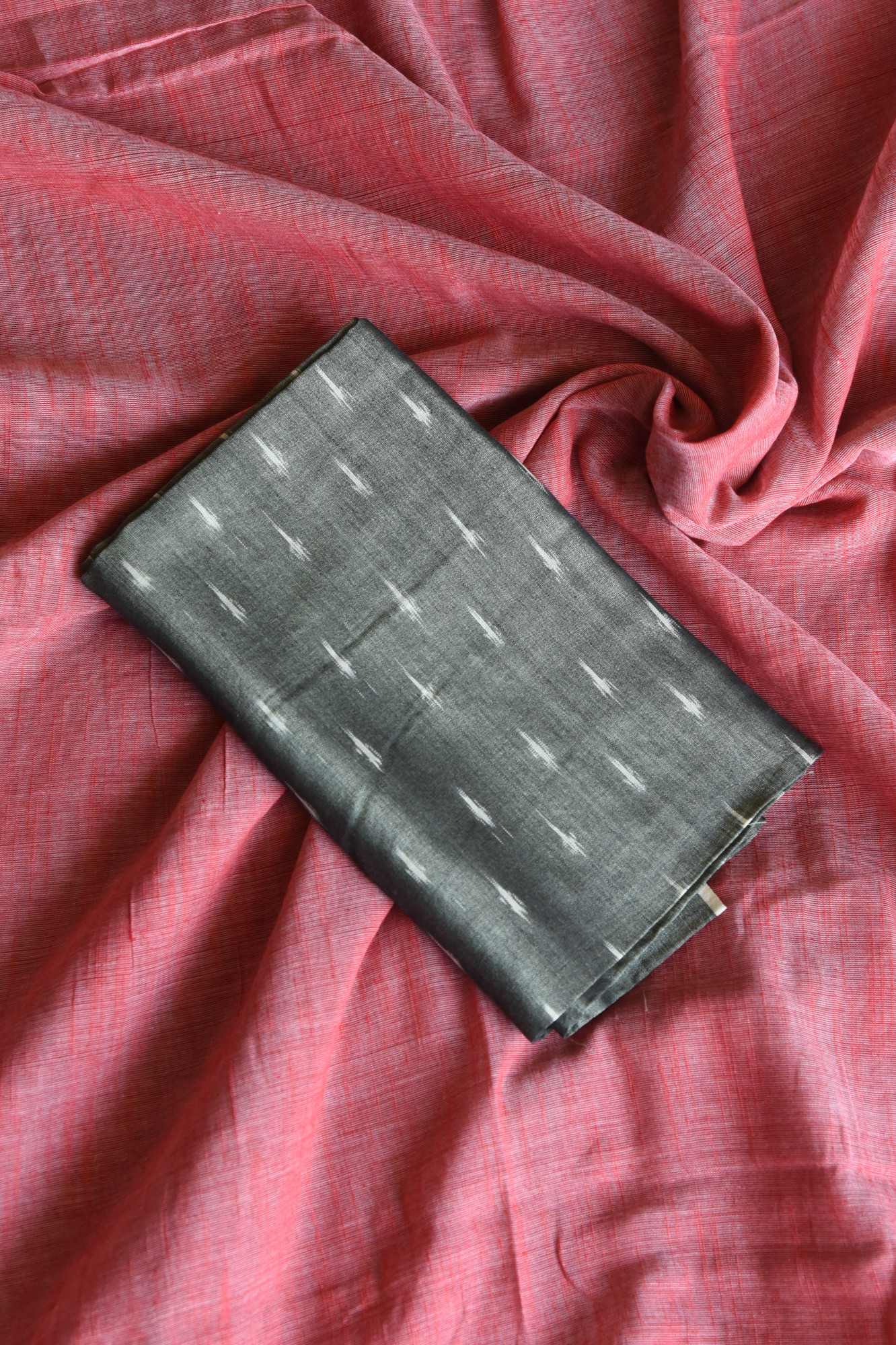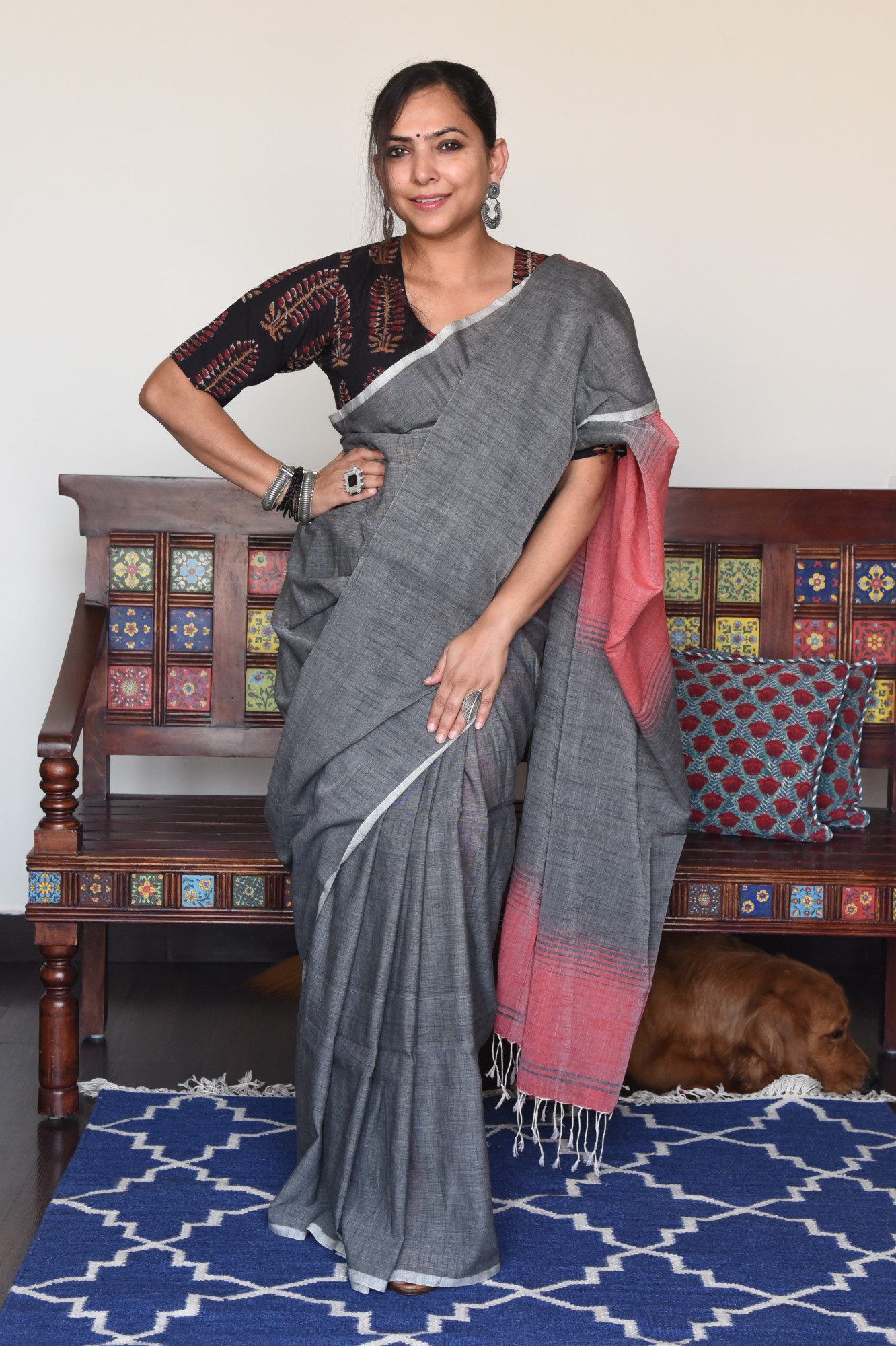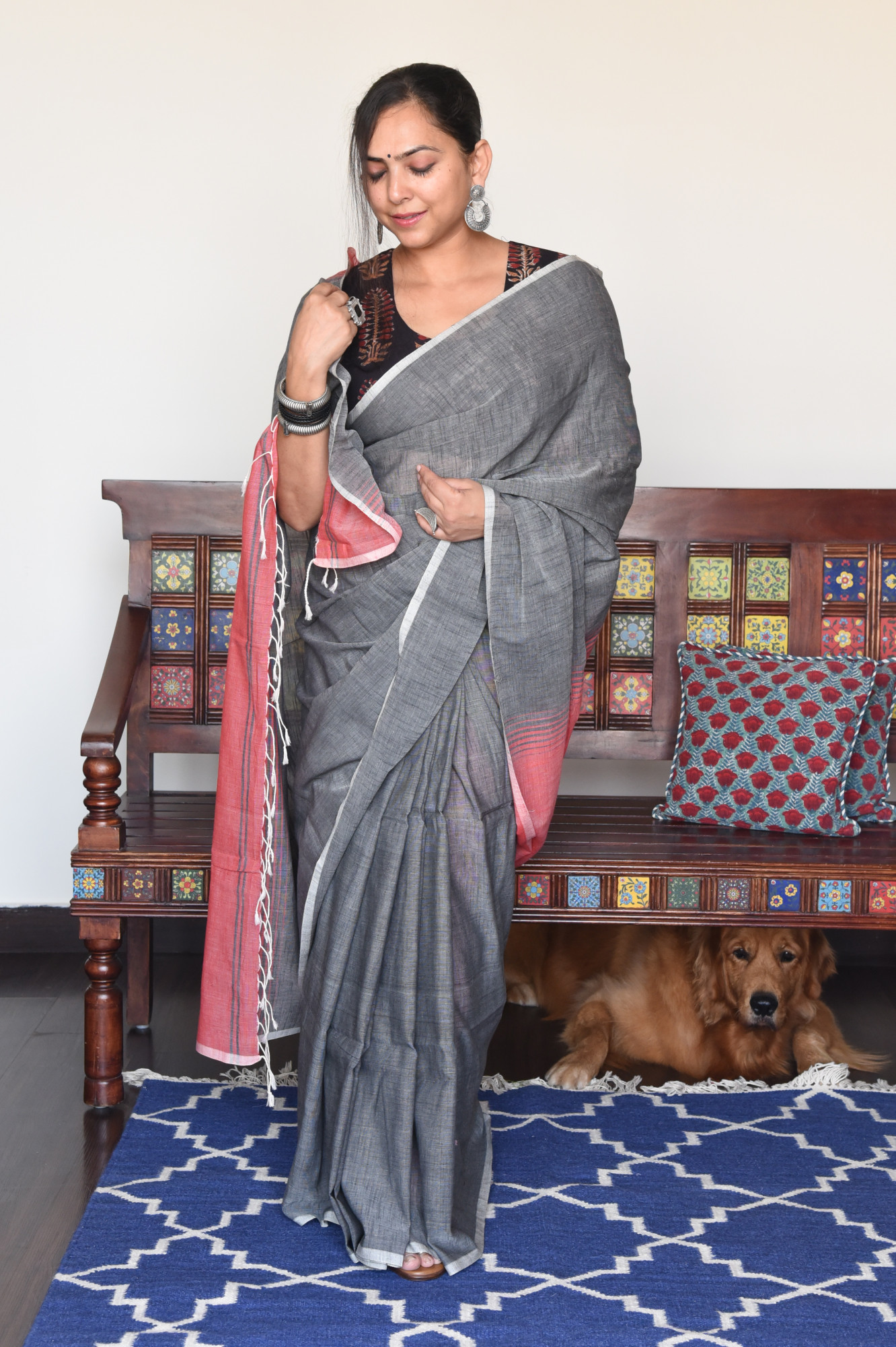 Handwoven pure grey Bengal cotton saree with salmon red palla.
