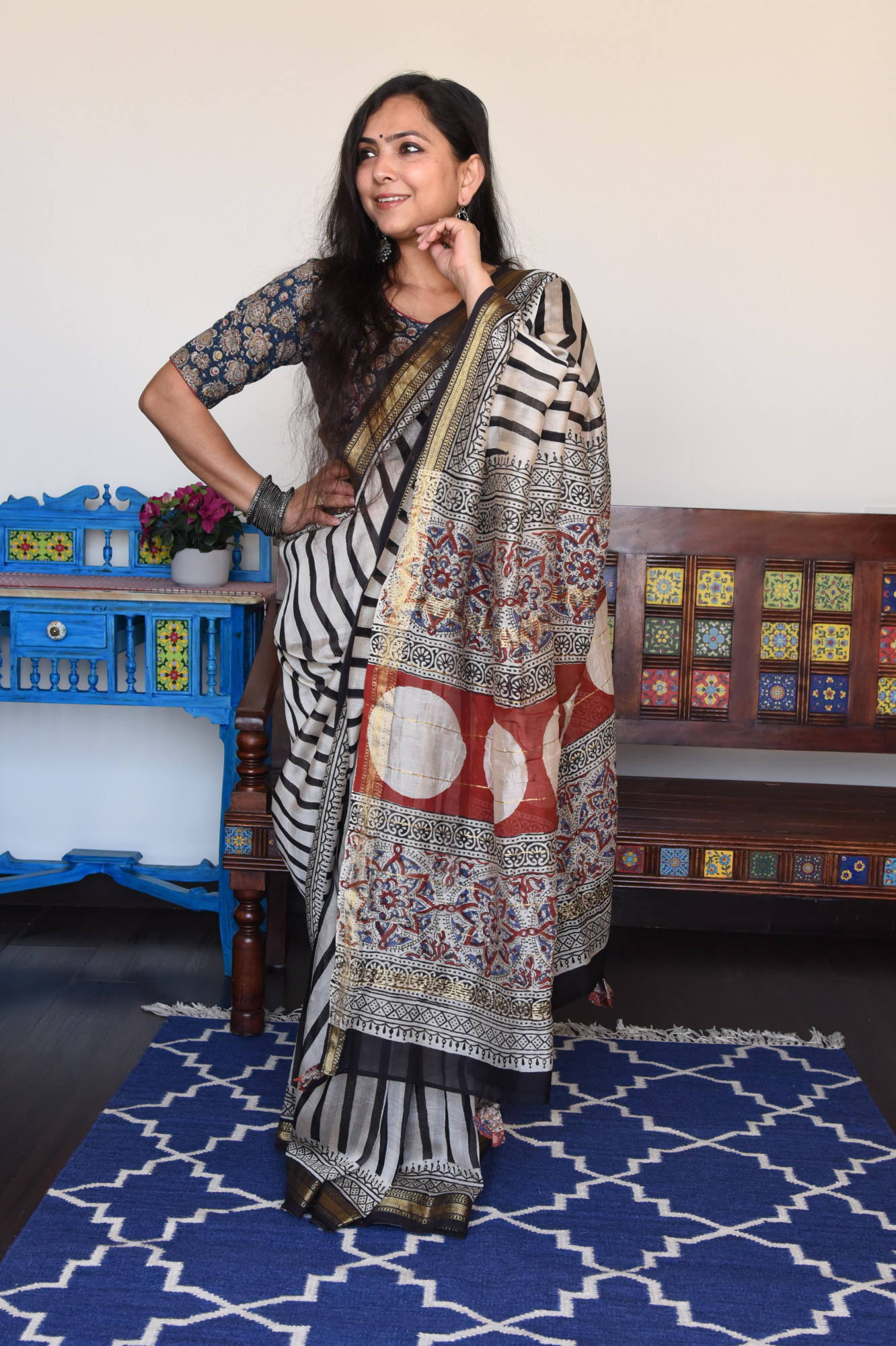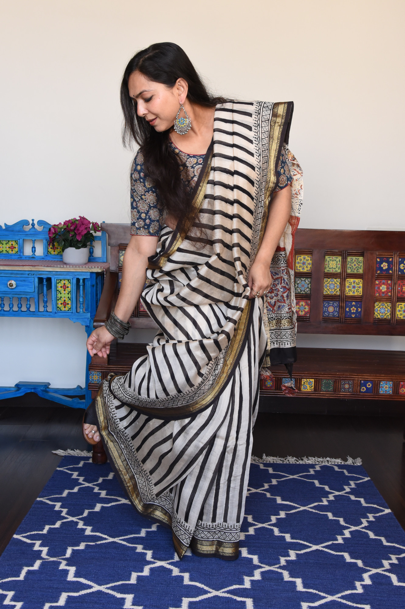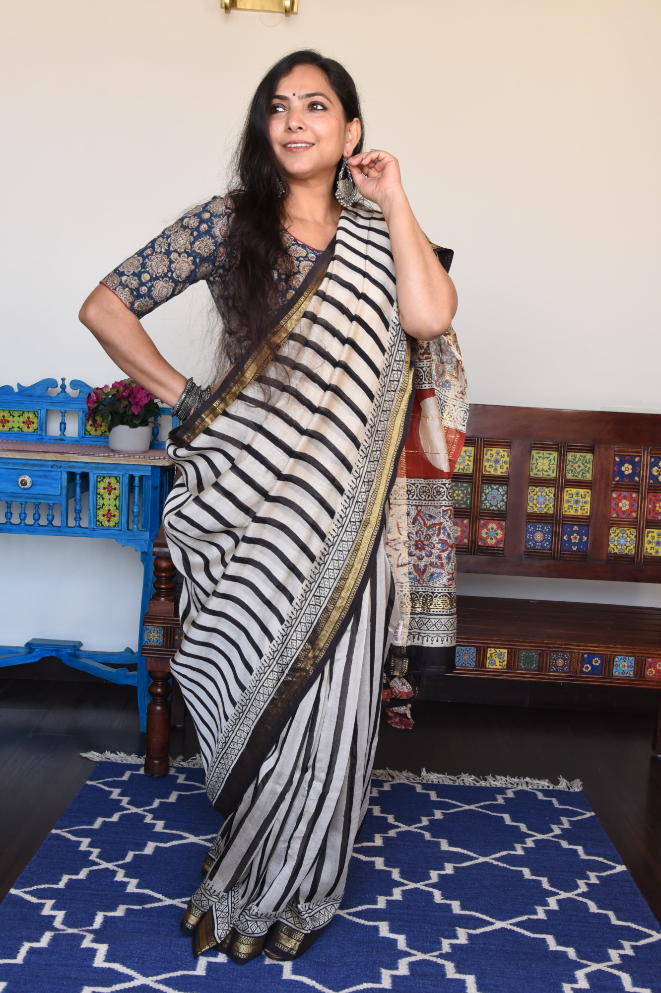 Hand block printed striped black -beige cotton silk saree with kalamkari inspired palla and golden zari border.