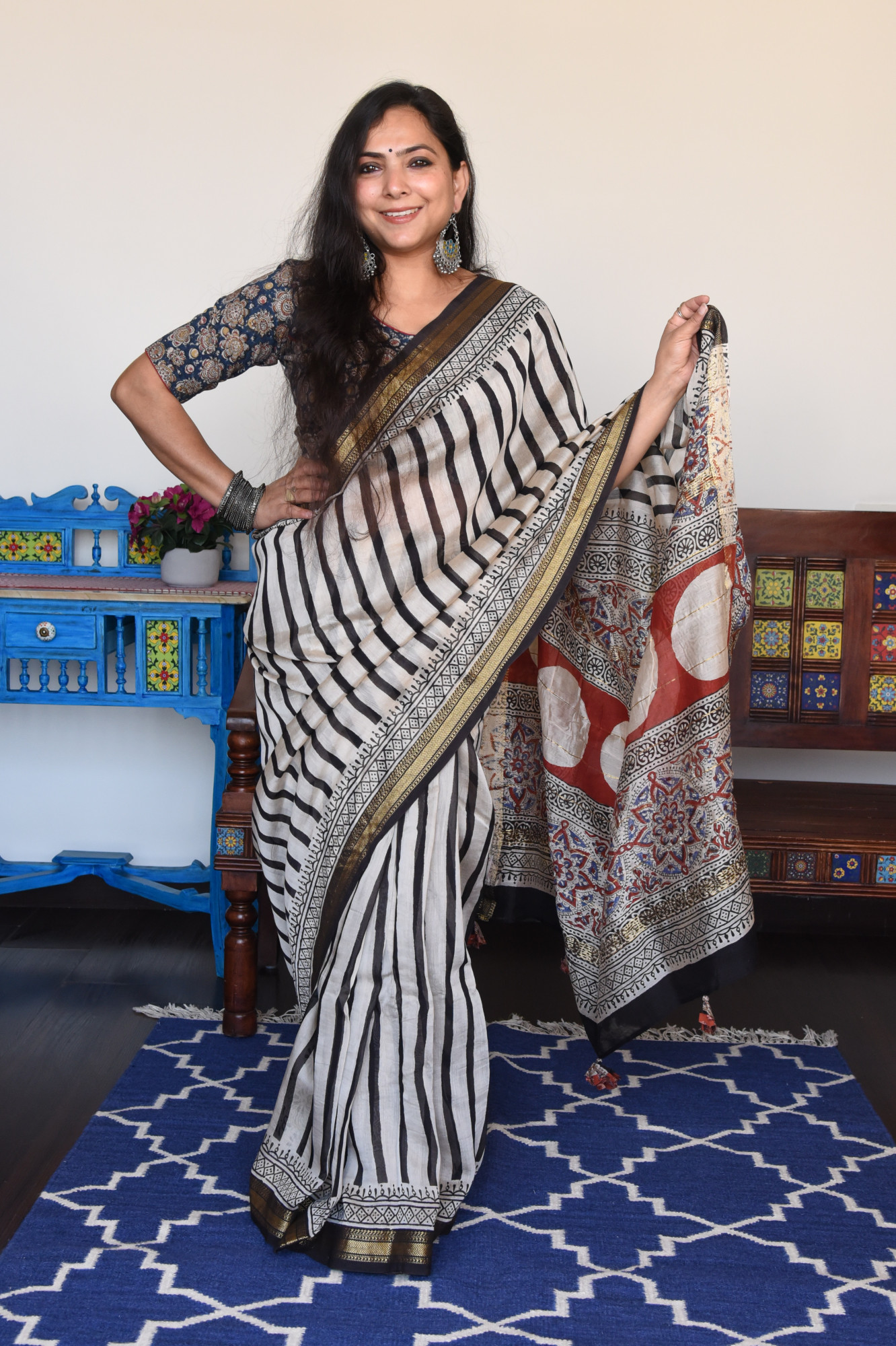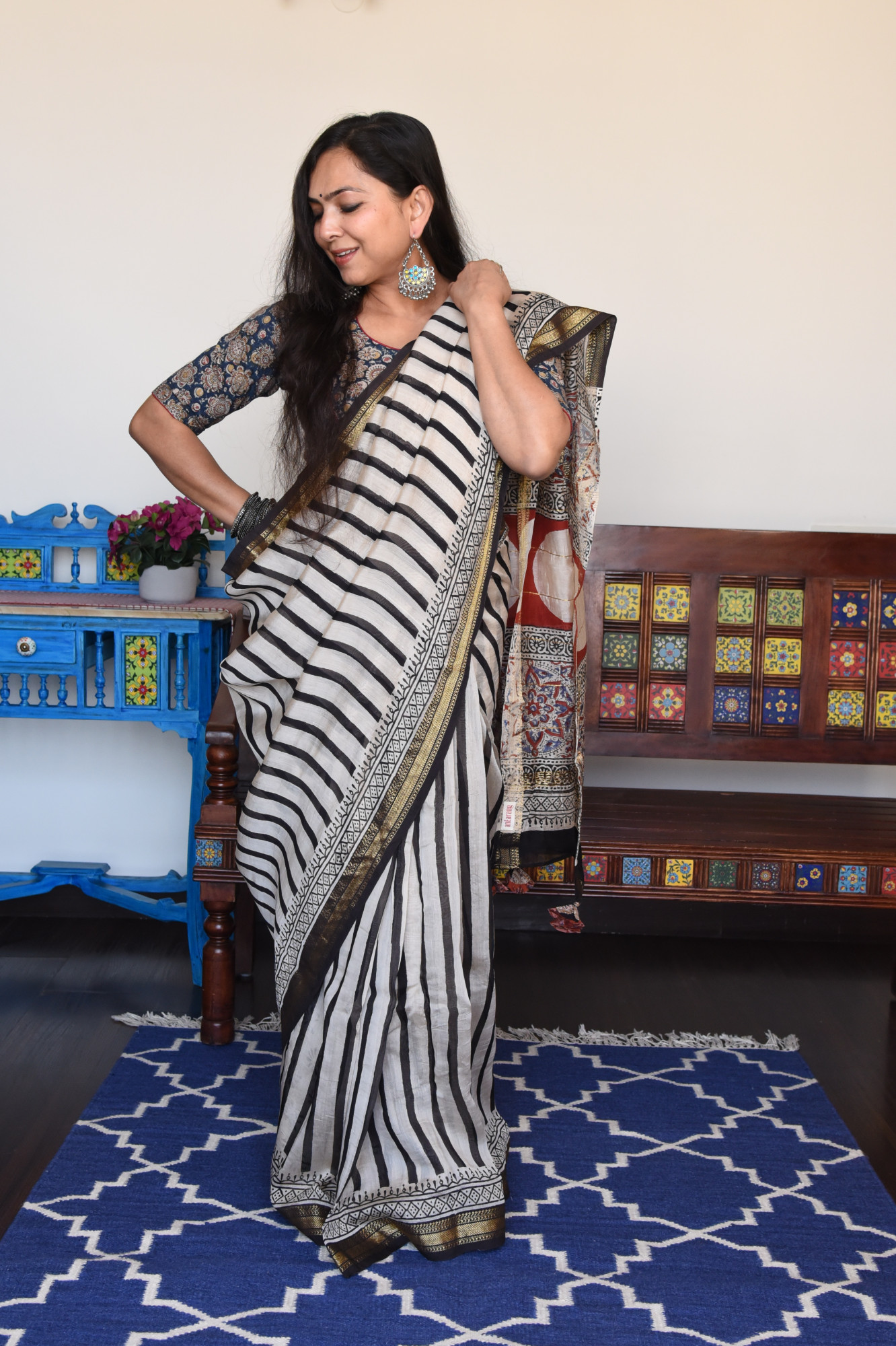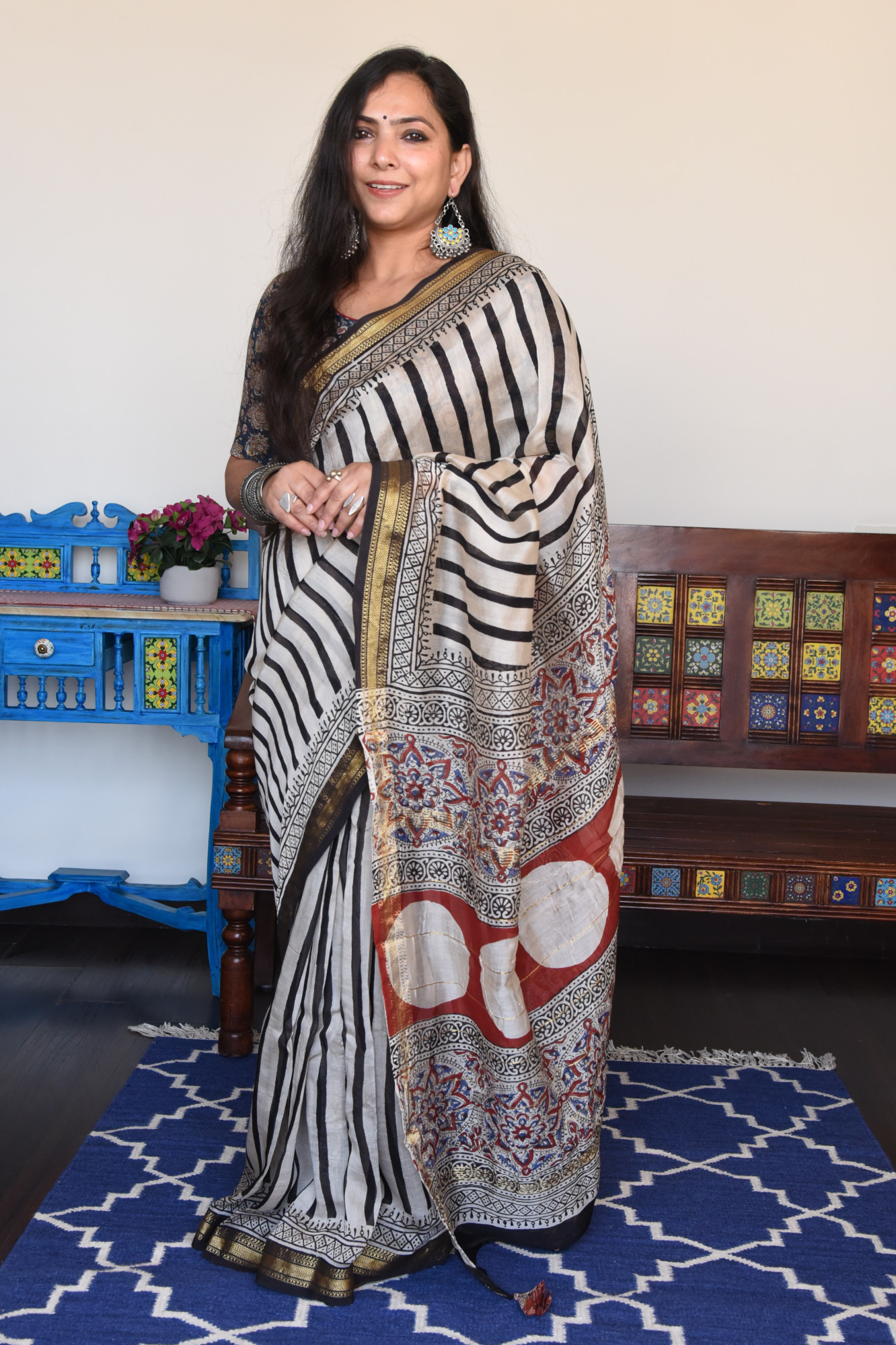 Hand block printed striped black -beige cotton silk saree with kalamkari inspired palla and golden zari border.