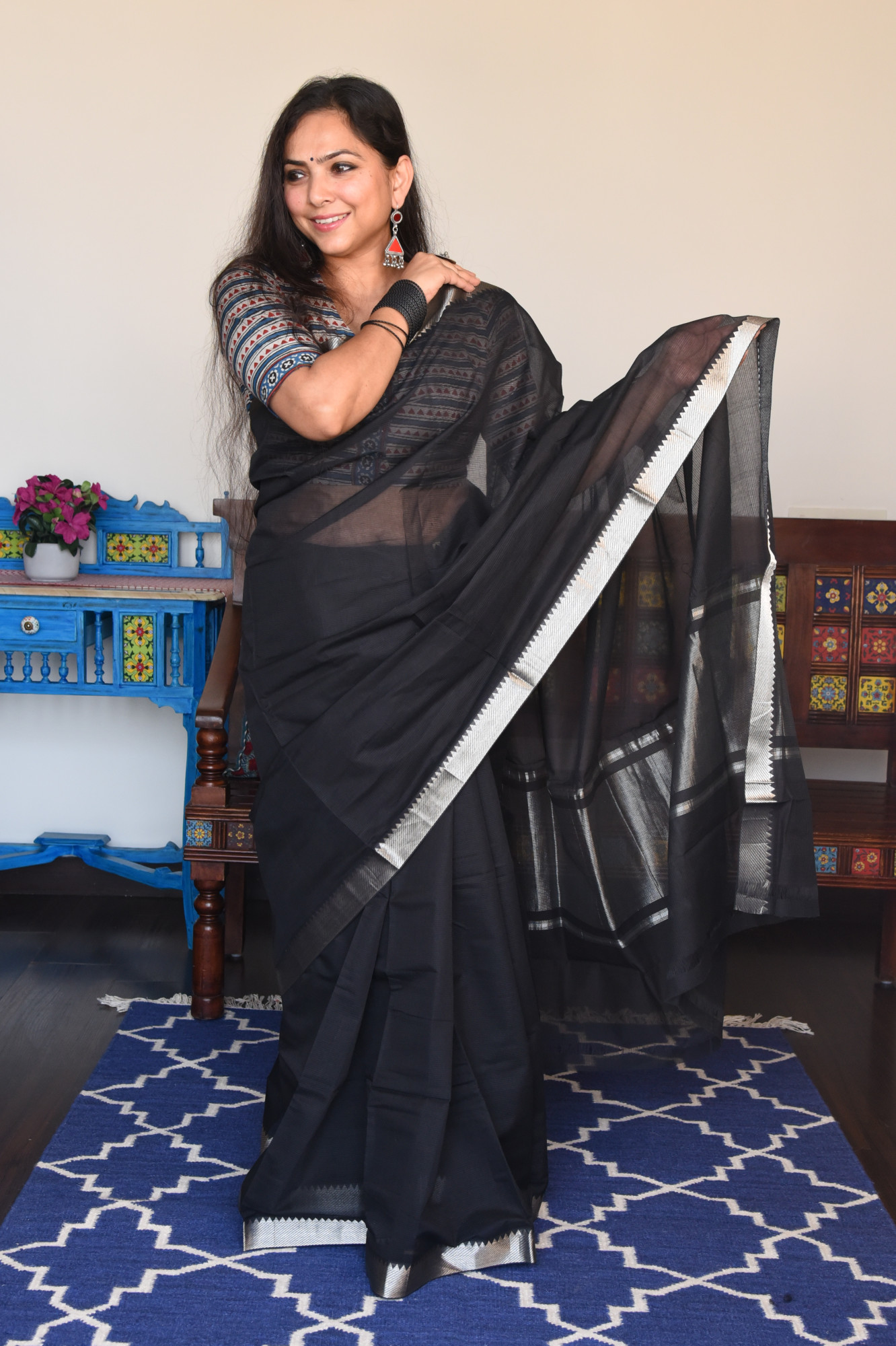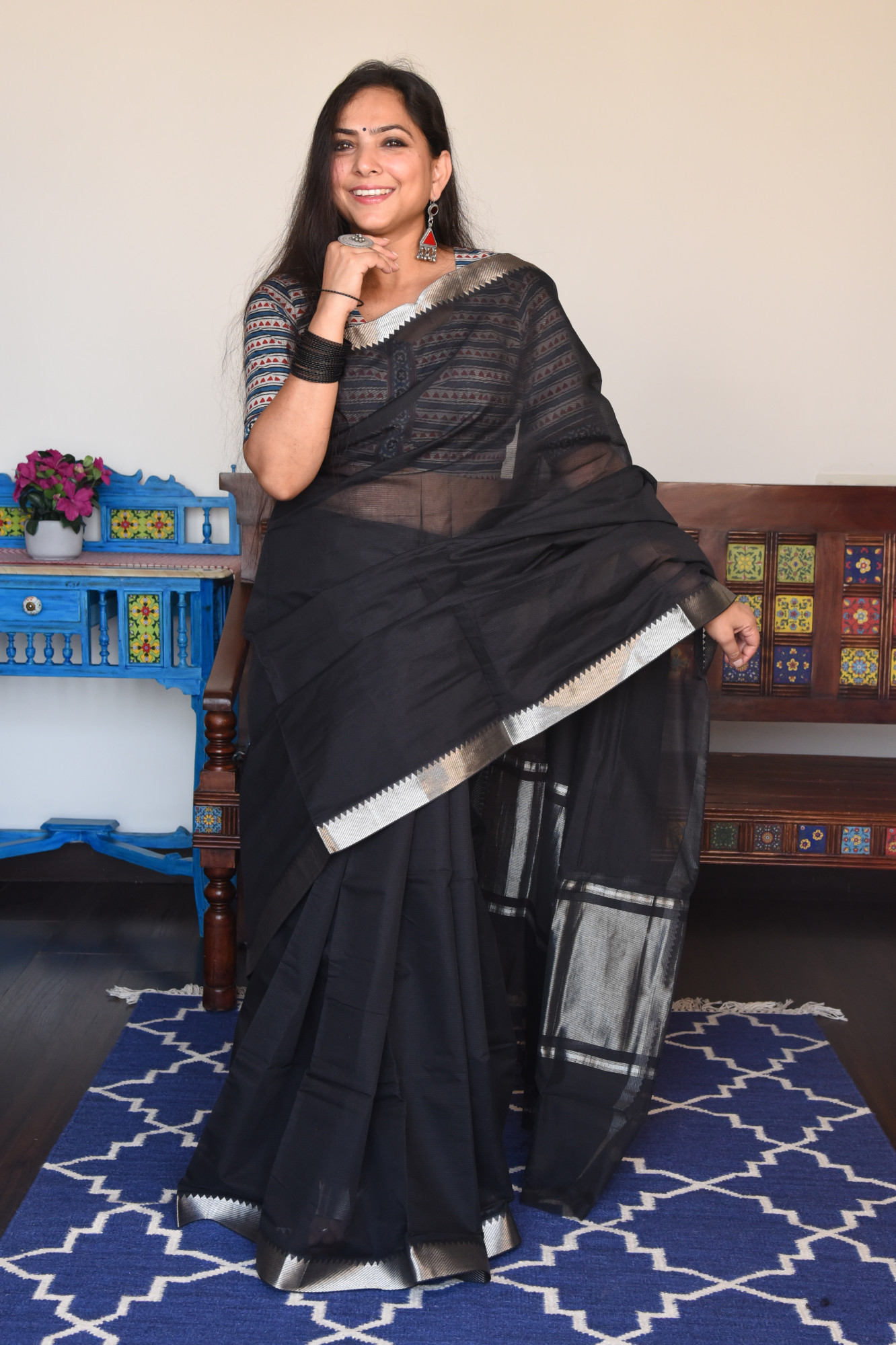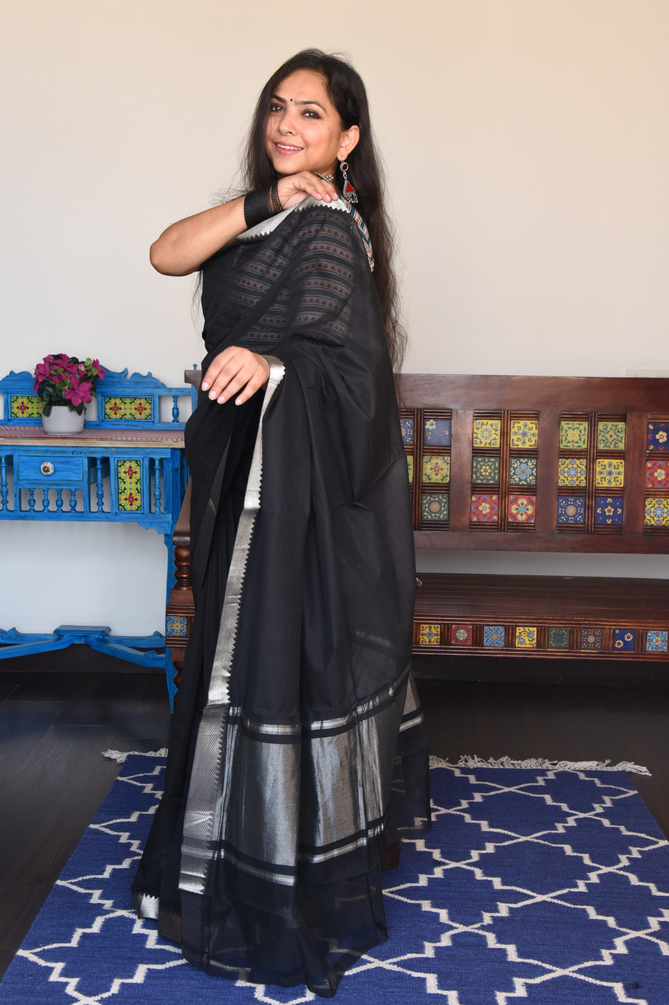 Mangalgiri missing weave cotton saree with silver zari nizam border and zari palla. Accessorised with self tassels.