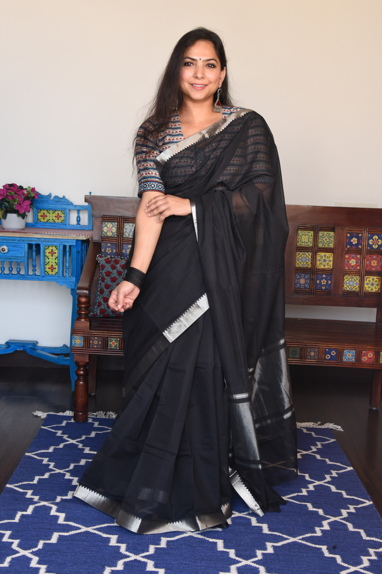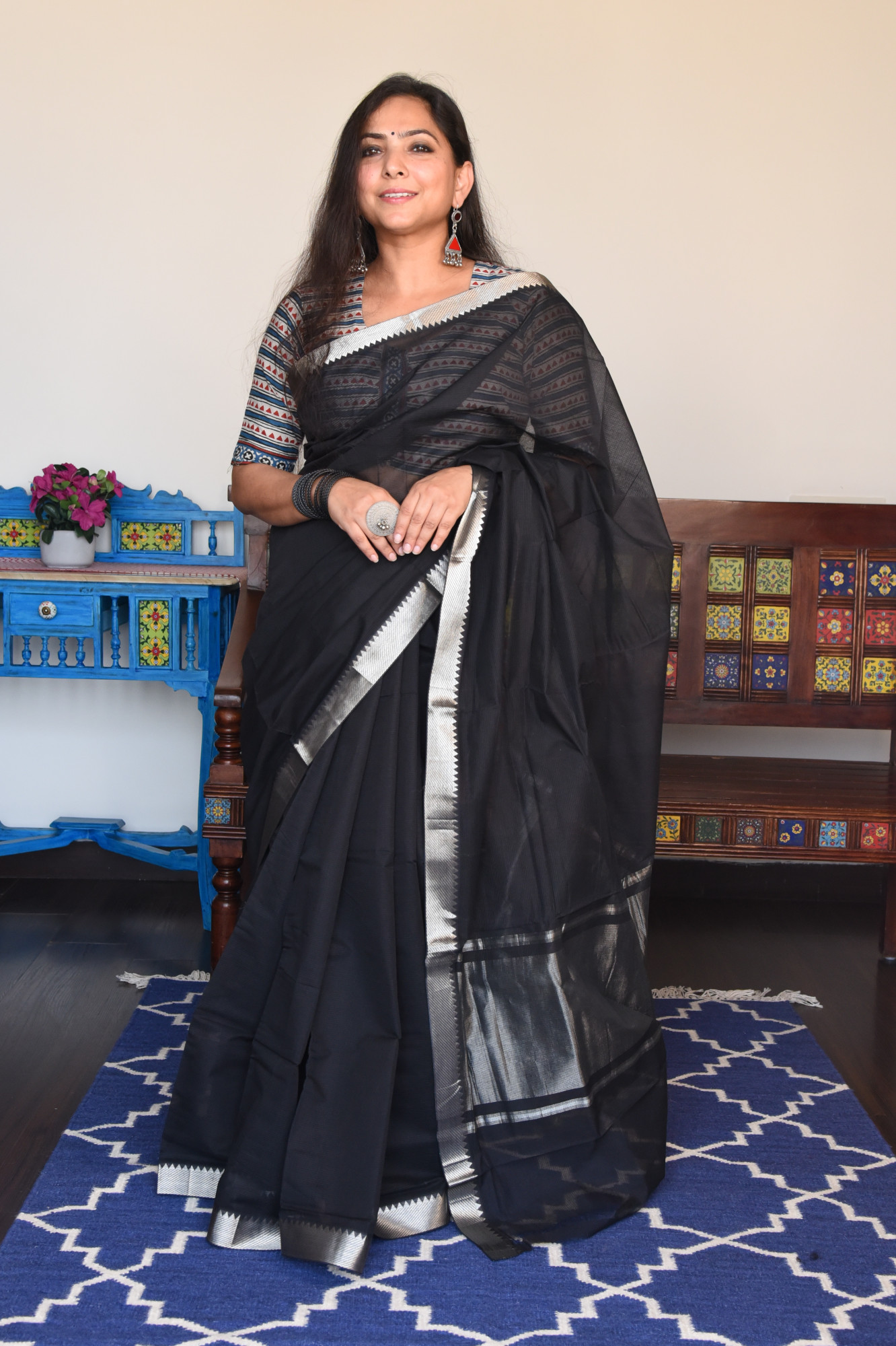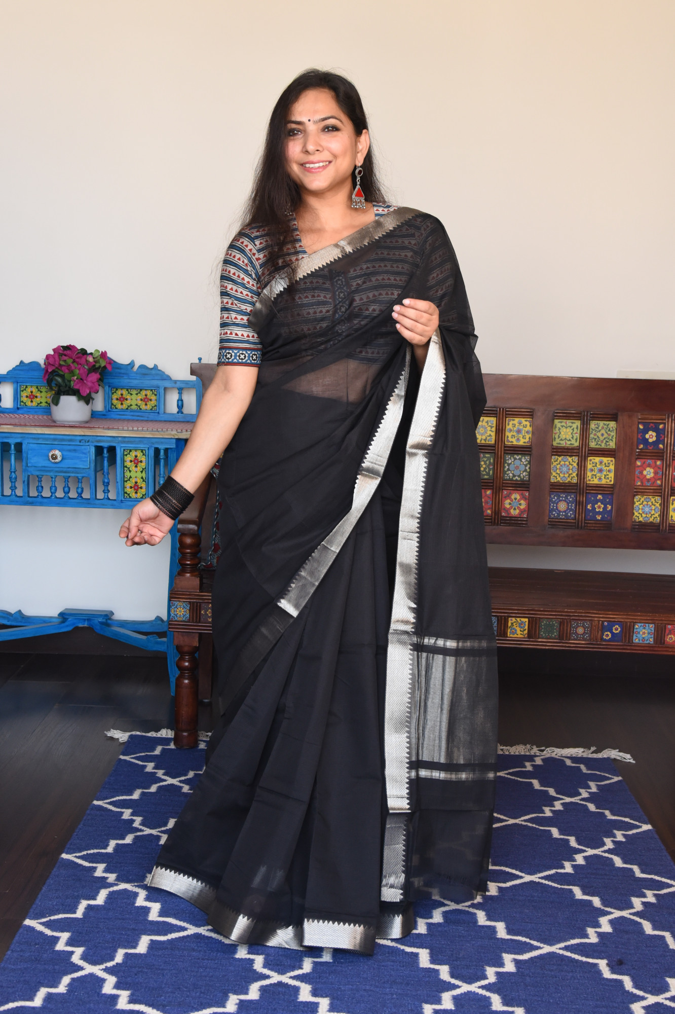 Mangalgiri missing weave cotton saree with silver zari nizam border and zari palla. Accessorised with self tassels.