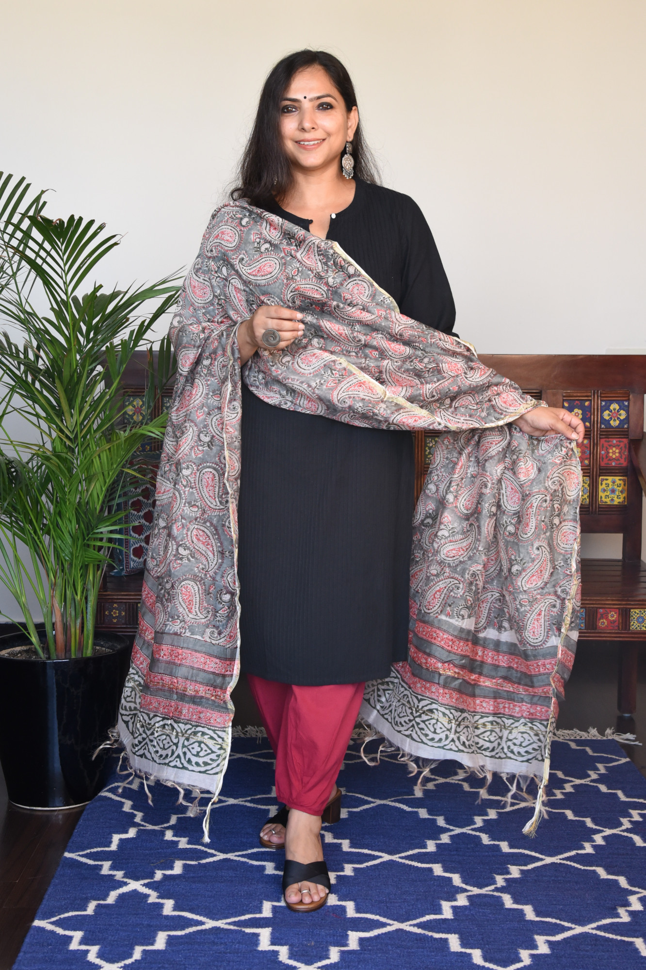 Handblock printed paisley grey cotton silk dupatta. Accessorised with handmade tassles.