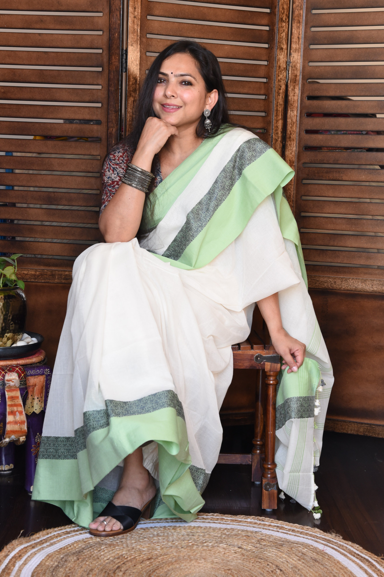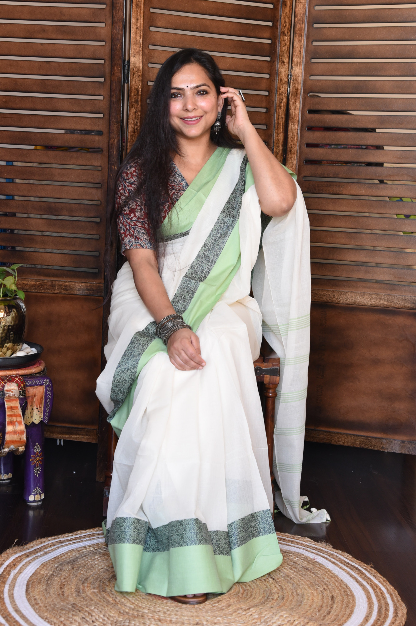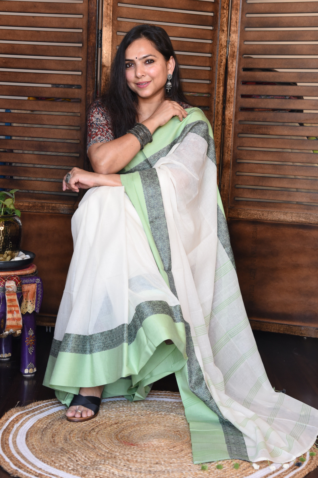 Handwoven white Bengal cotton saree with green border having grey resham thread work and striped palla. Accessorised with self tassles