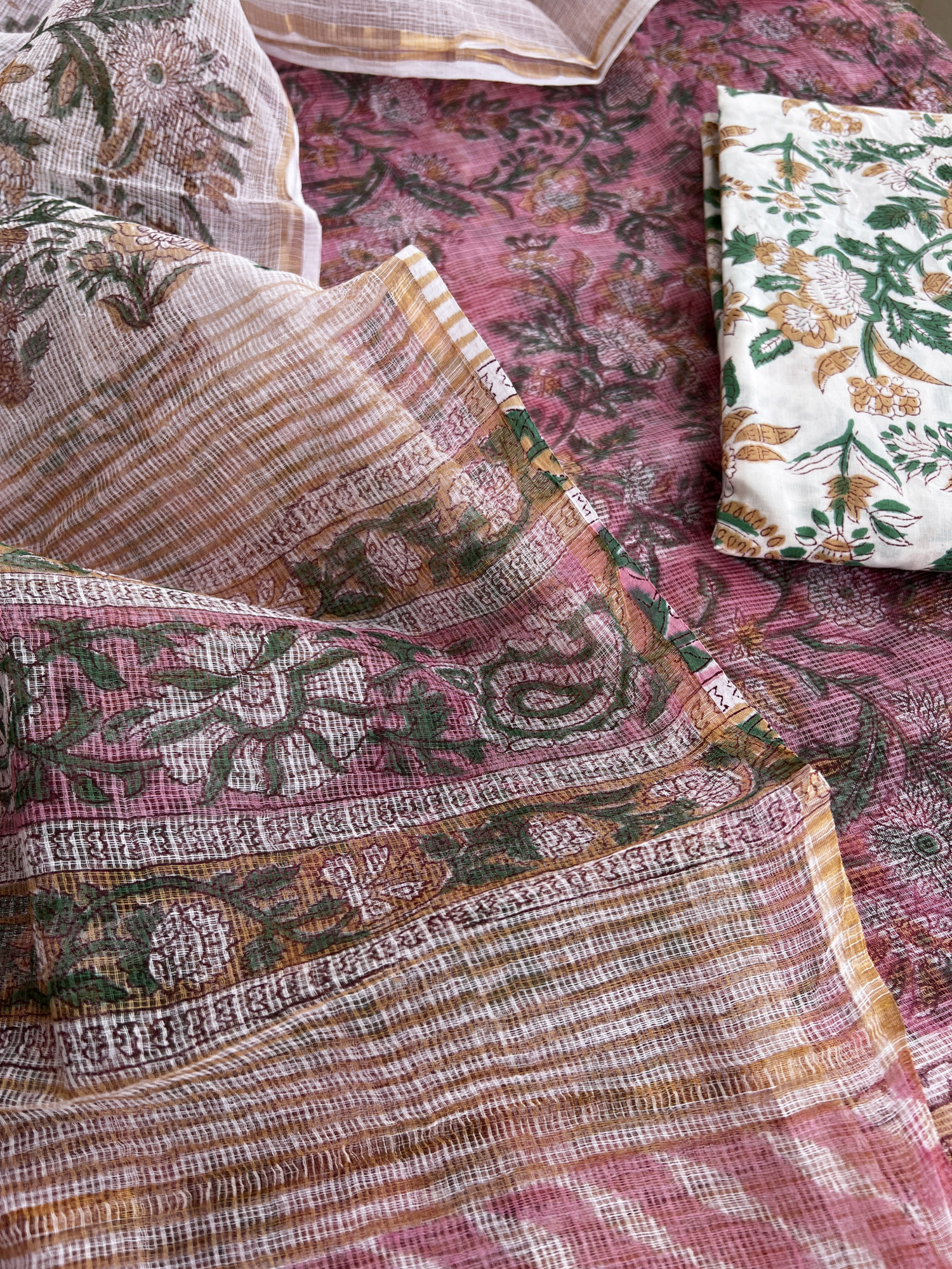 Handblock printed kota dupatta with gold zari comes with Kota kurta fabric and cotton bottom.