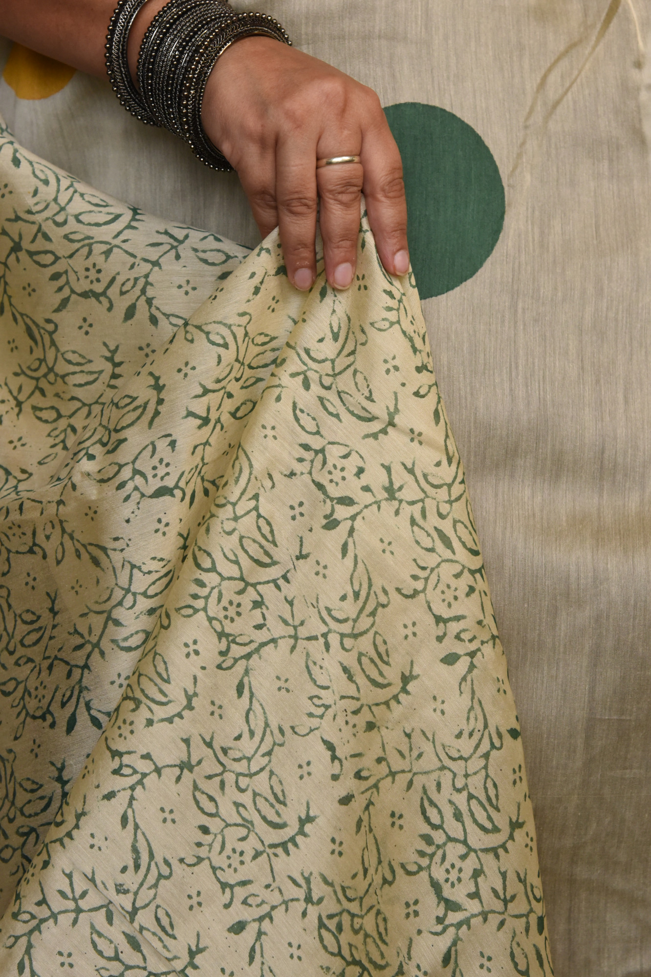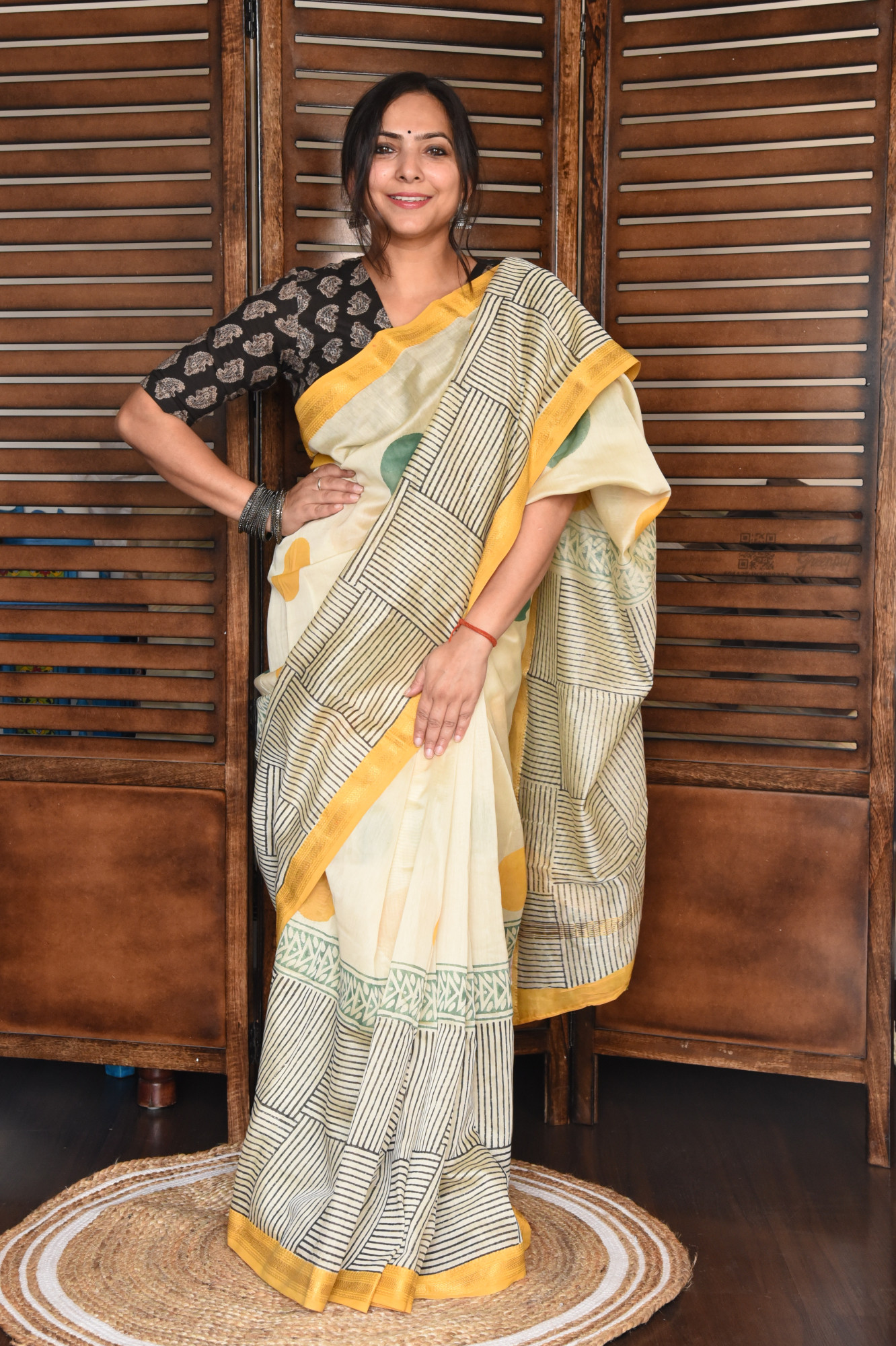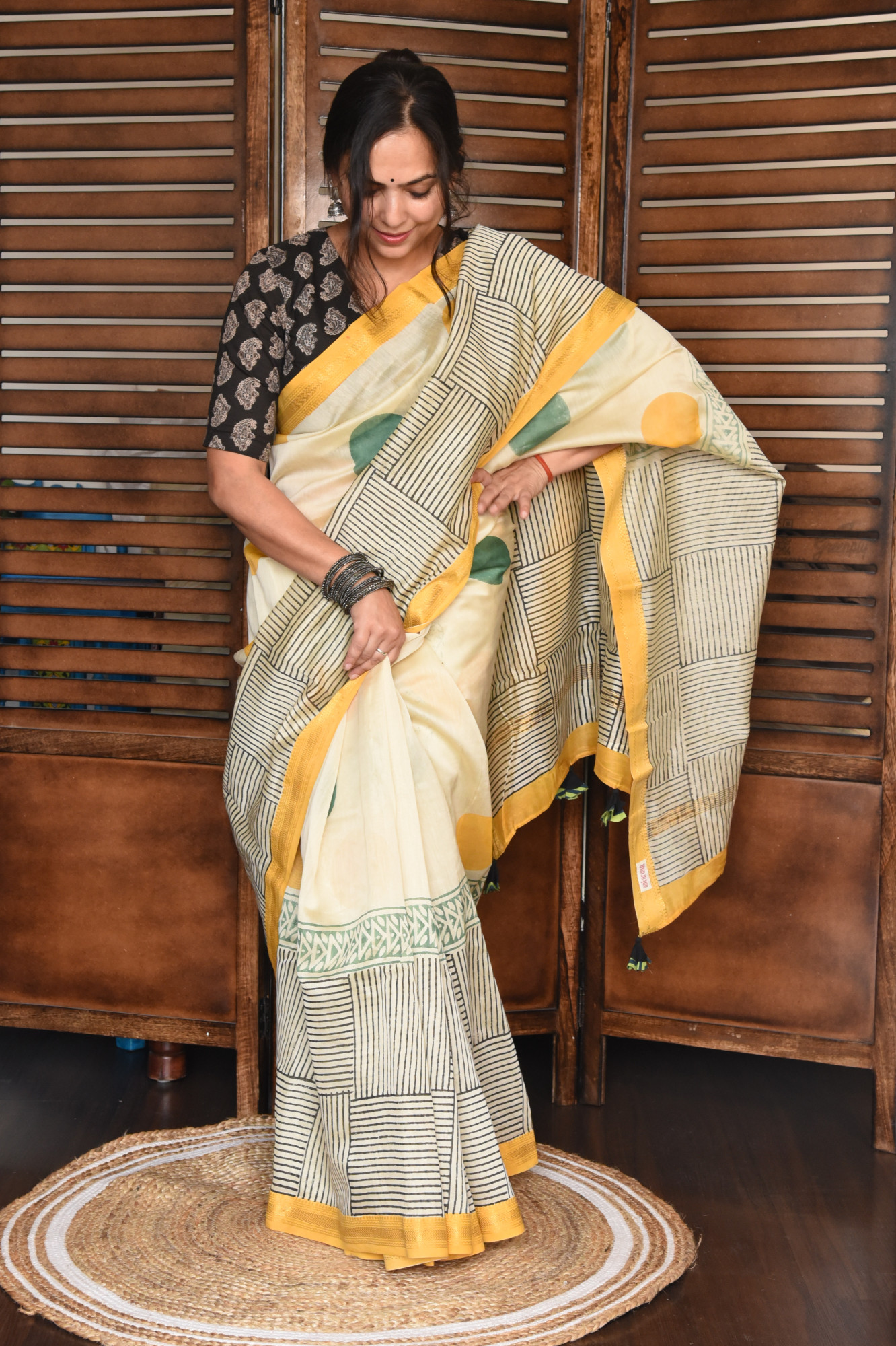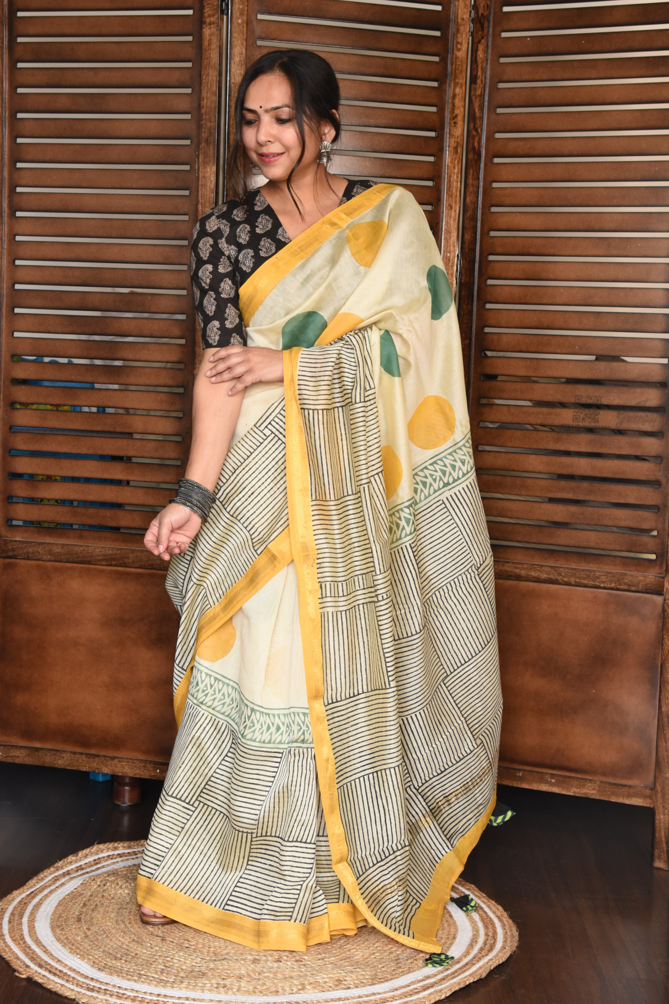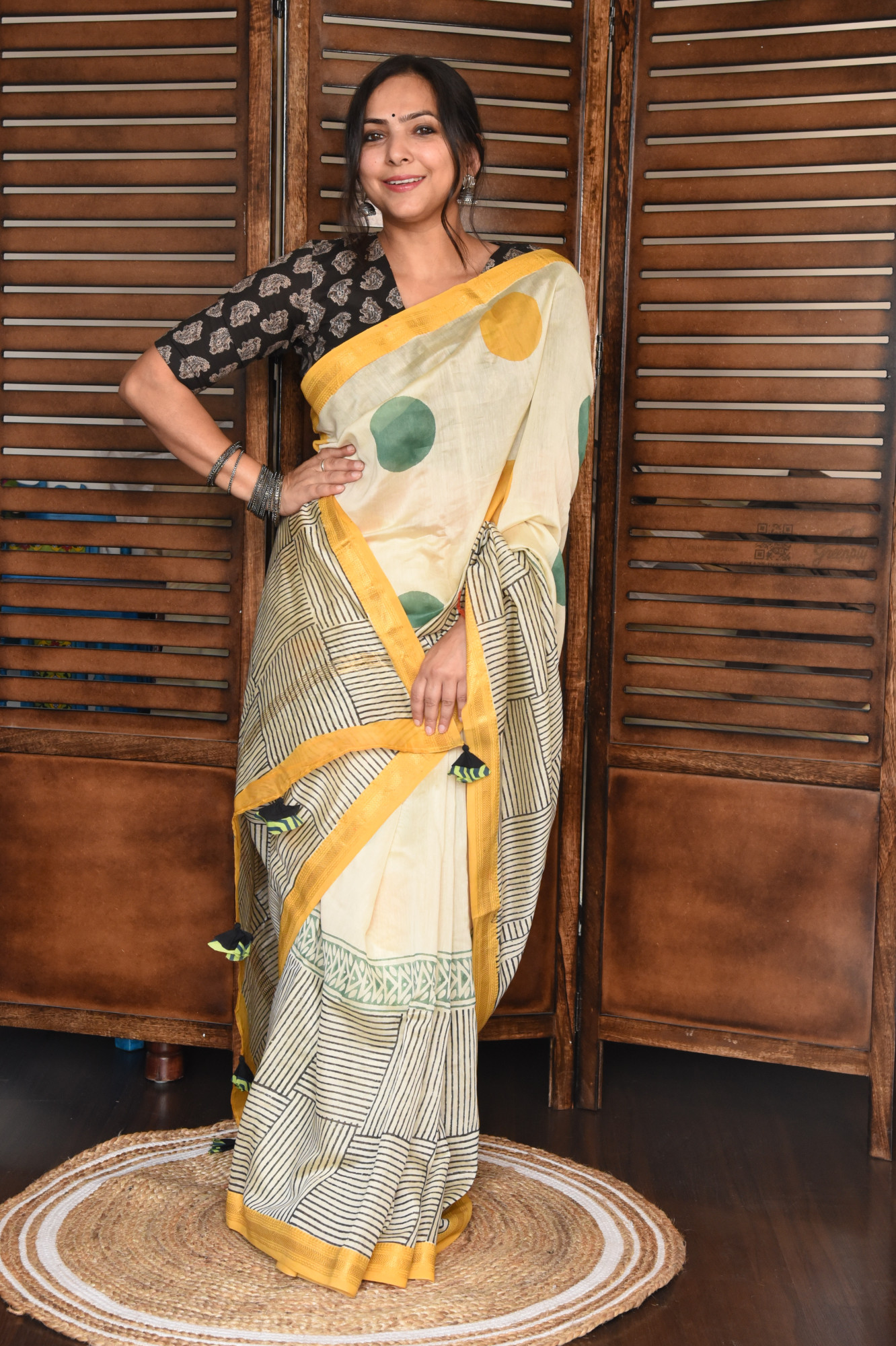 Hand block printed polka on beige cotton silk saree with golden zari border.