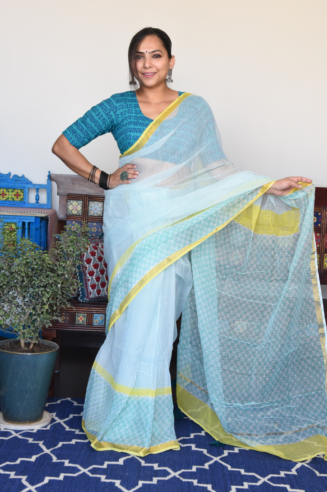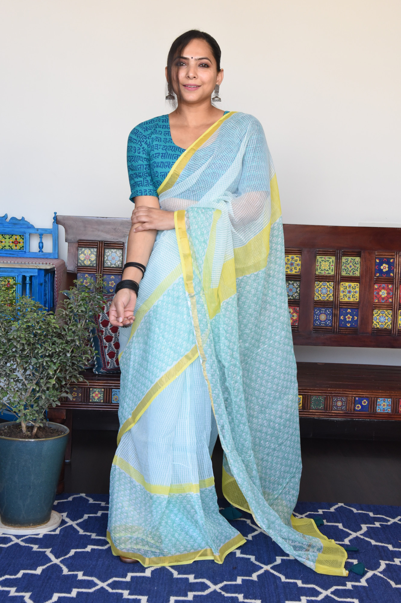 Handblock printed striped light blue kota doria cotton saree. Accessorised with fabric tassels.