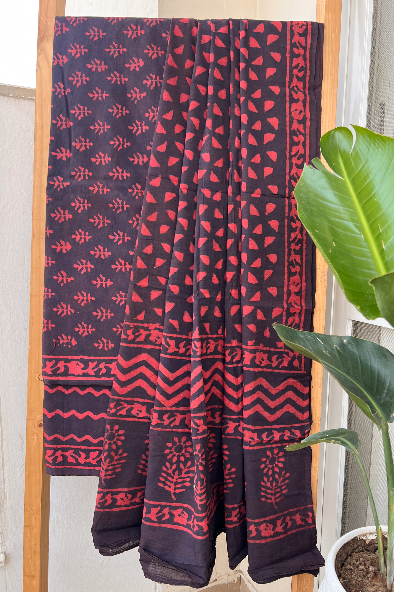 Handblock printed cotton kurta fabric with hand block printed cotton bottom paired with block printed cotton dupatta.