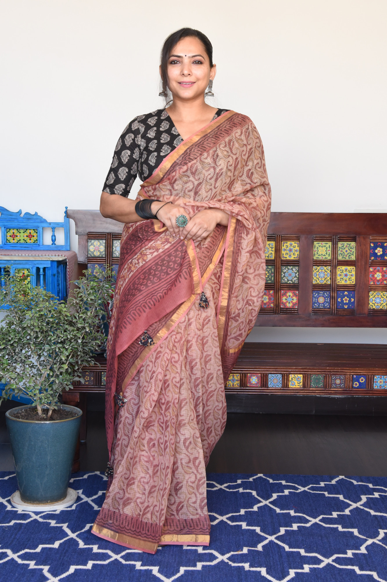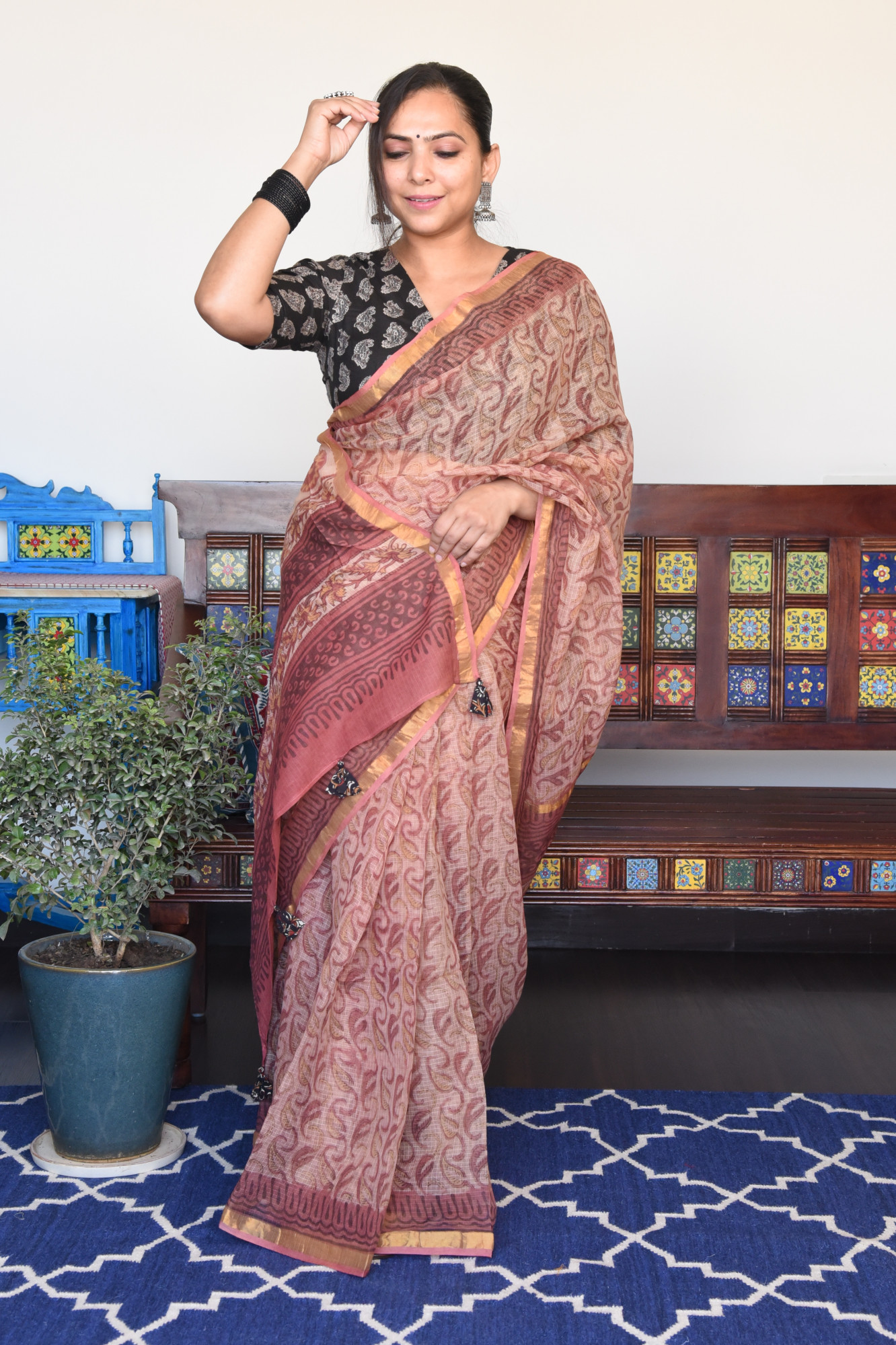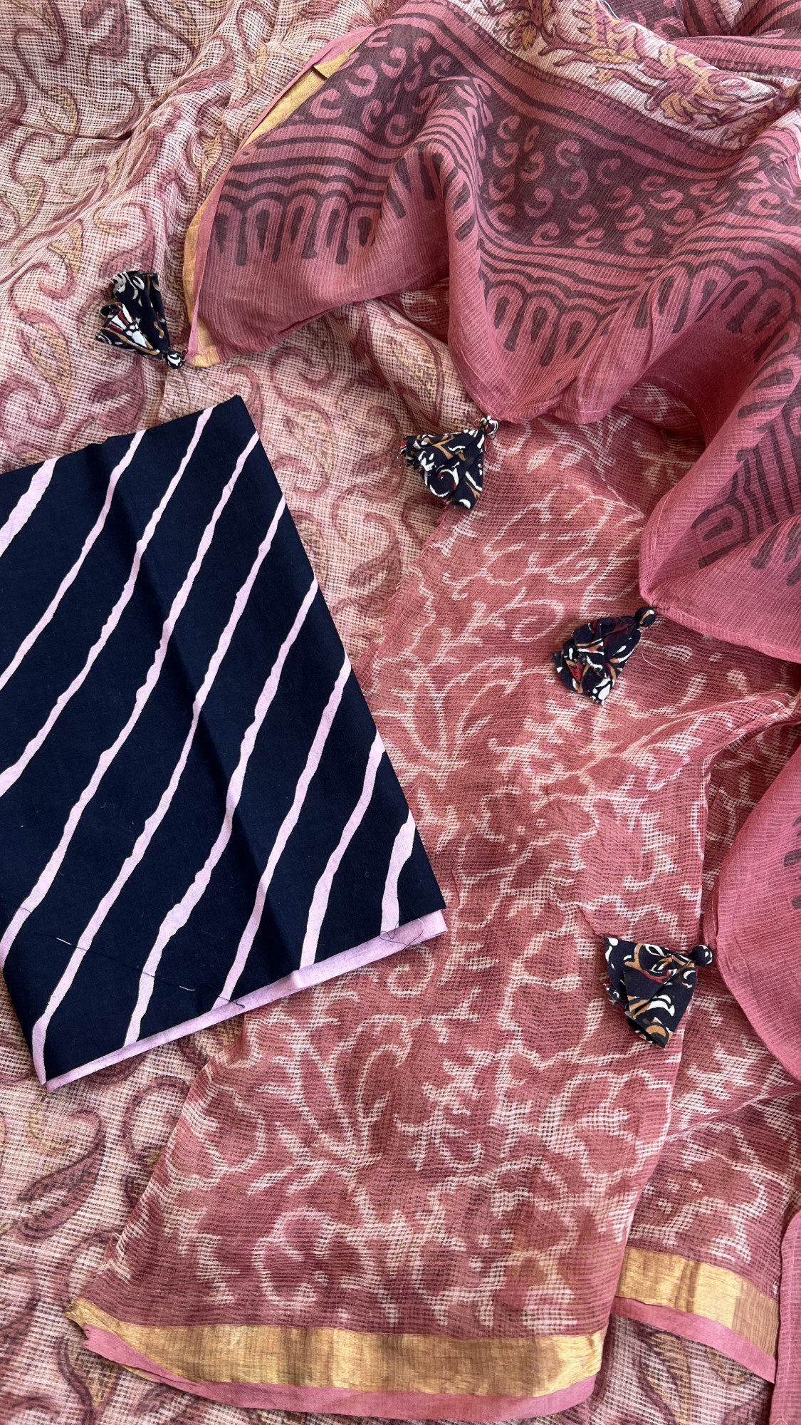 Handblock printed french rose vanaspati print kota doria cotton saree. Accessorised with fabric tassels.