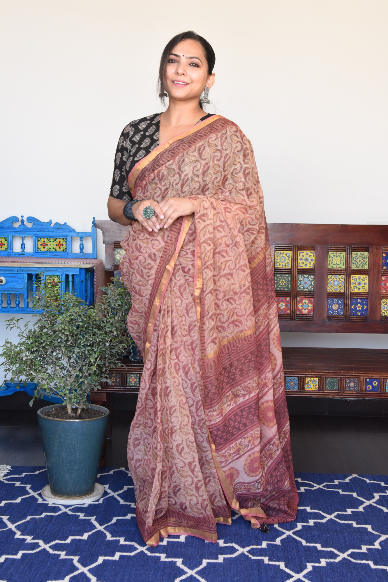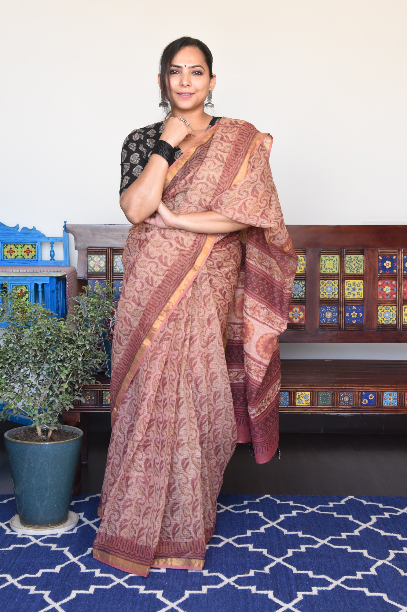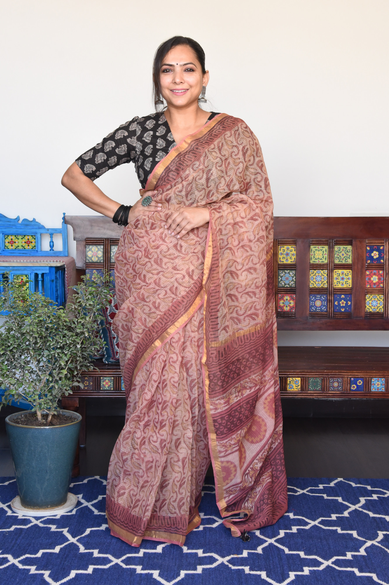 Handblock printed french rose vanaspati print kota doria cotton saree. Accessorised with fabric tassels.