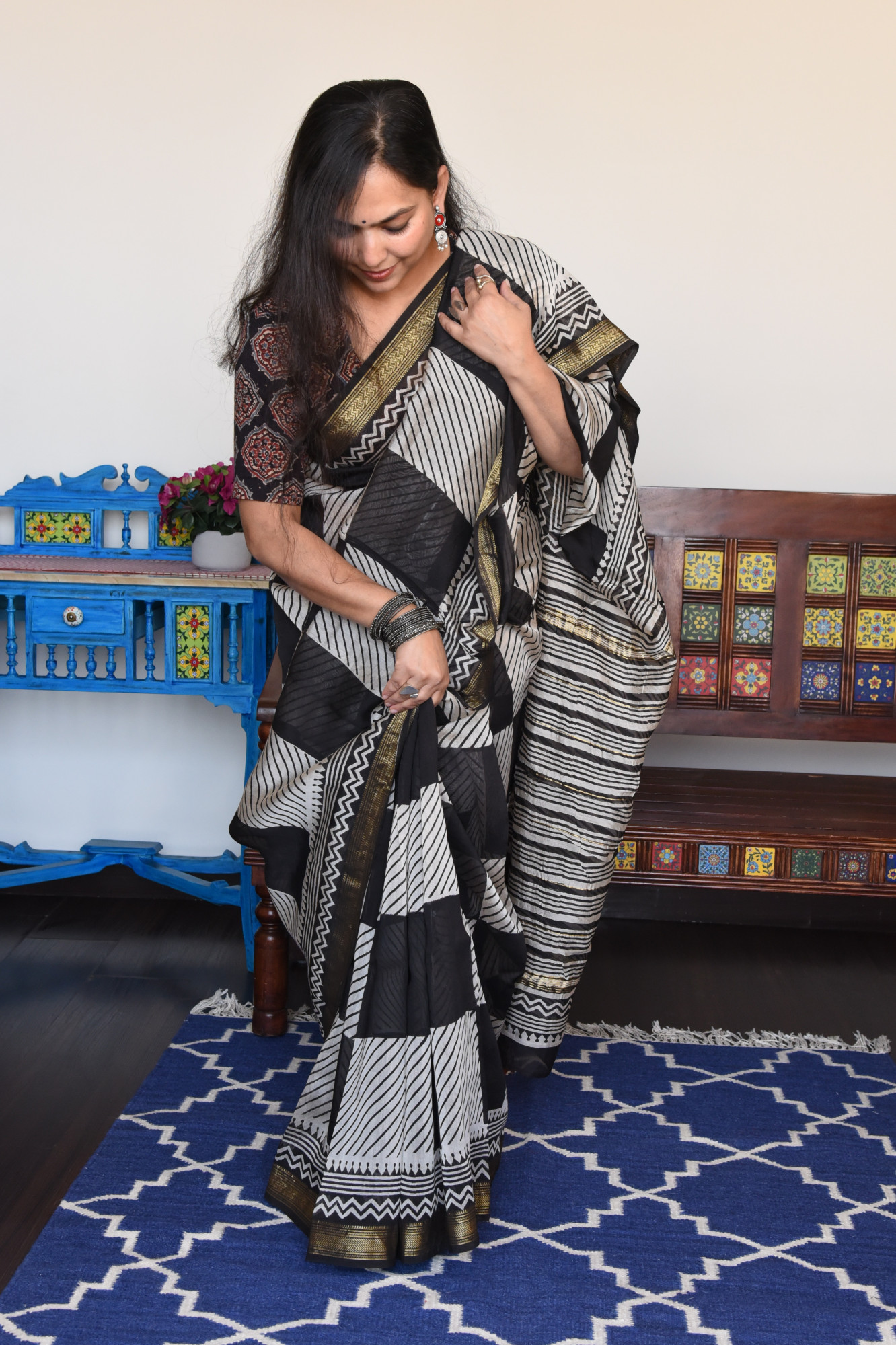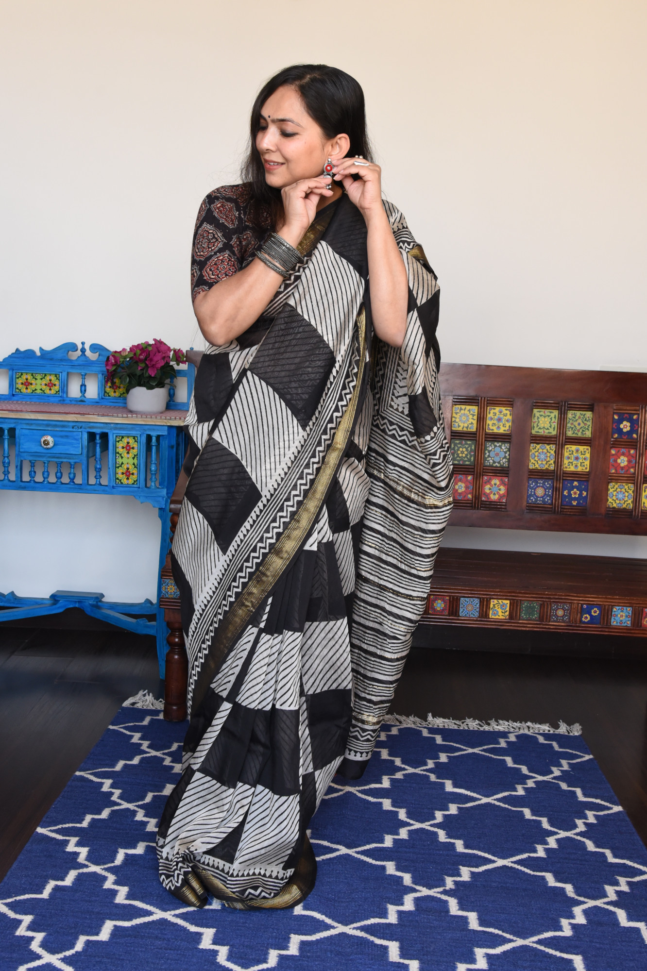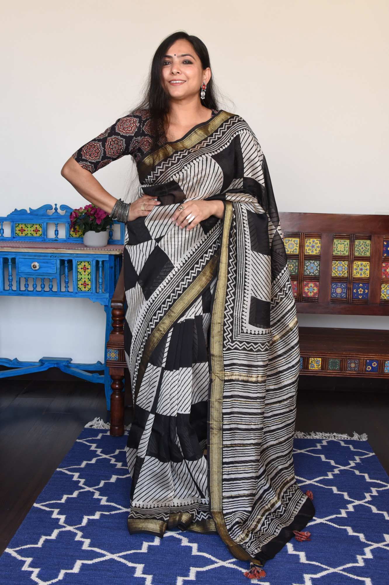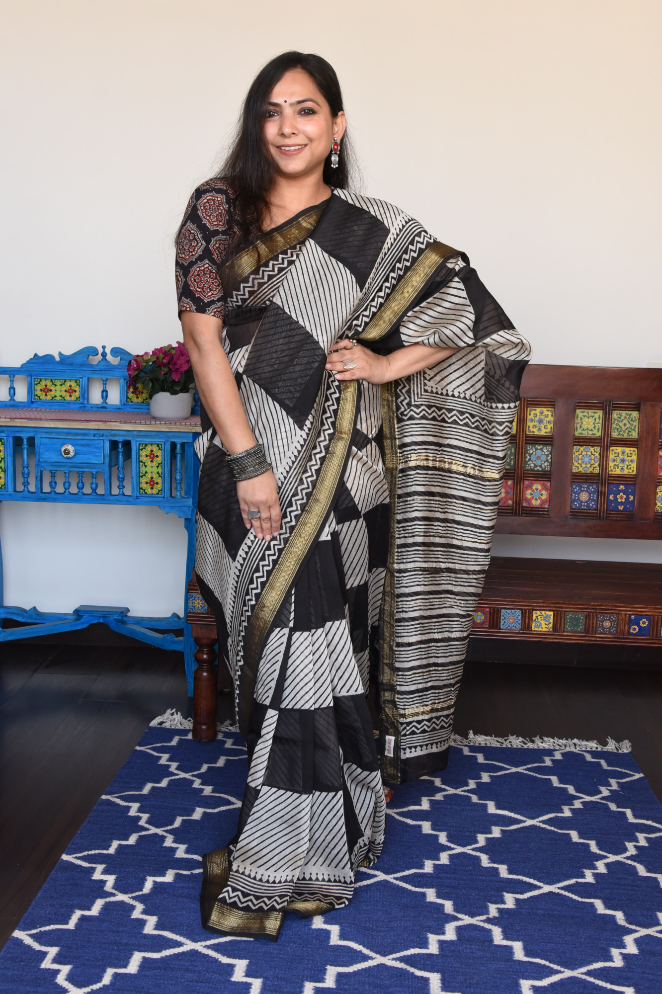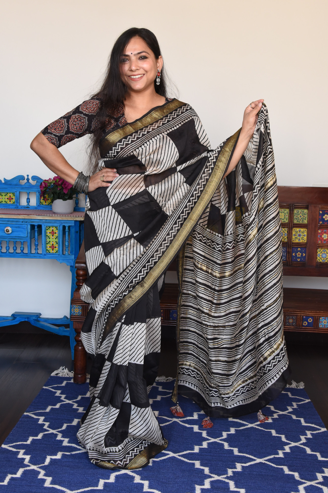 Hand block printed chequered striped beige - black cotton silk saree with golden zari border.