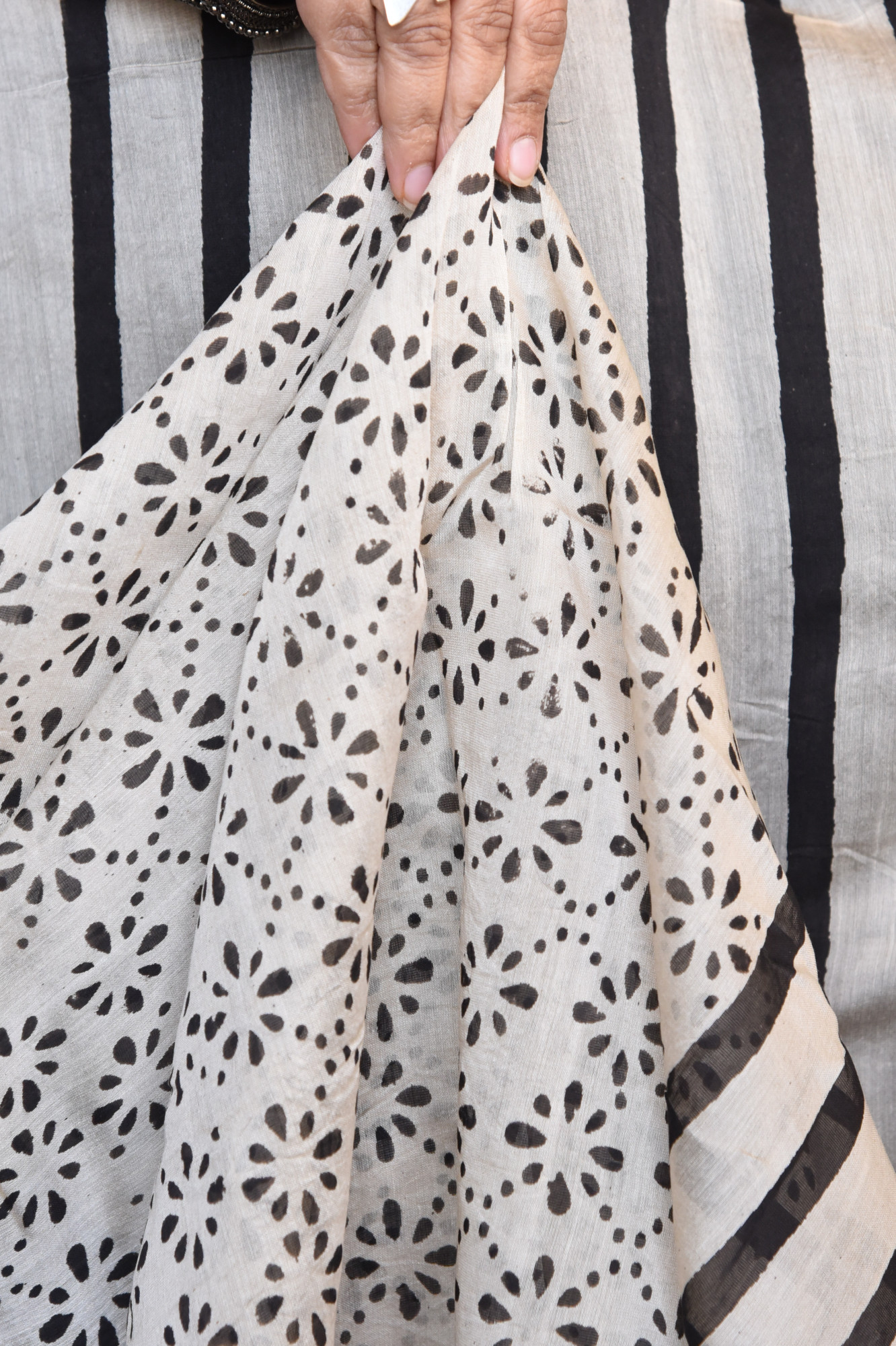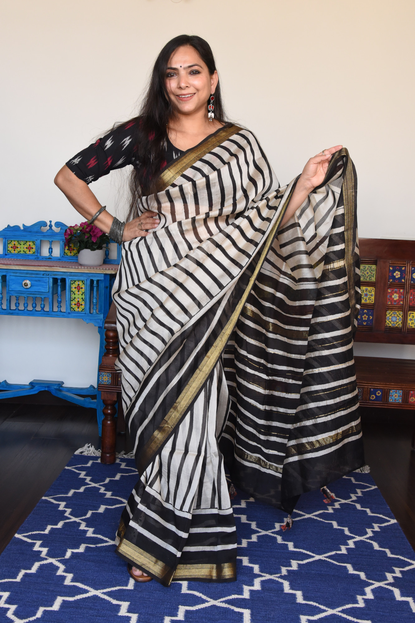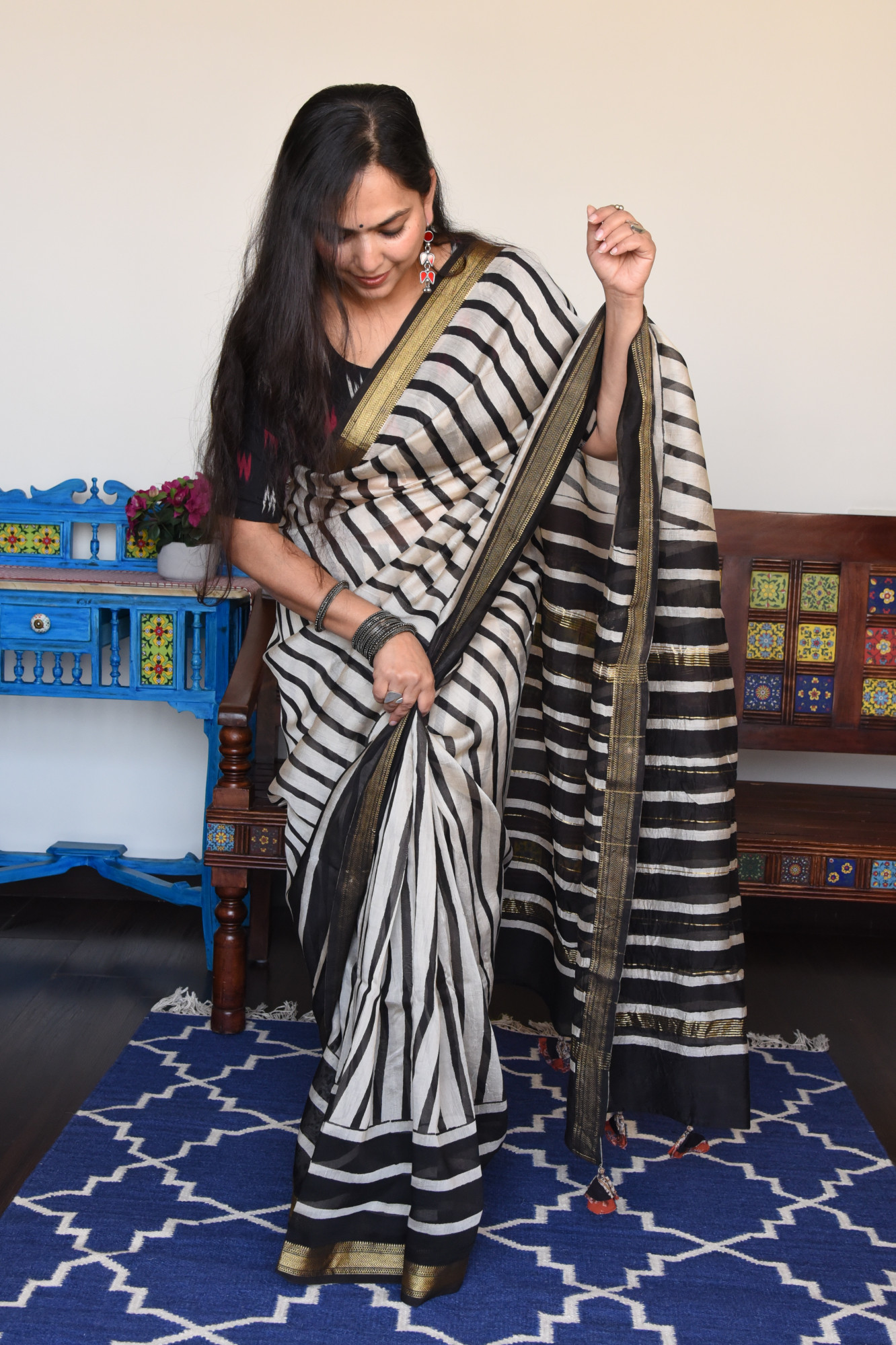 Hand block printed striped beige - black cotton silk saree with golden zari border.