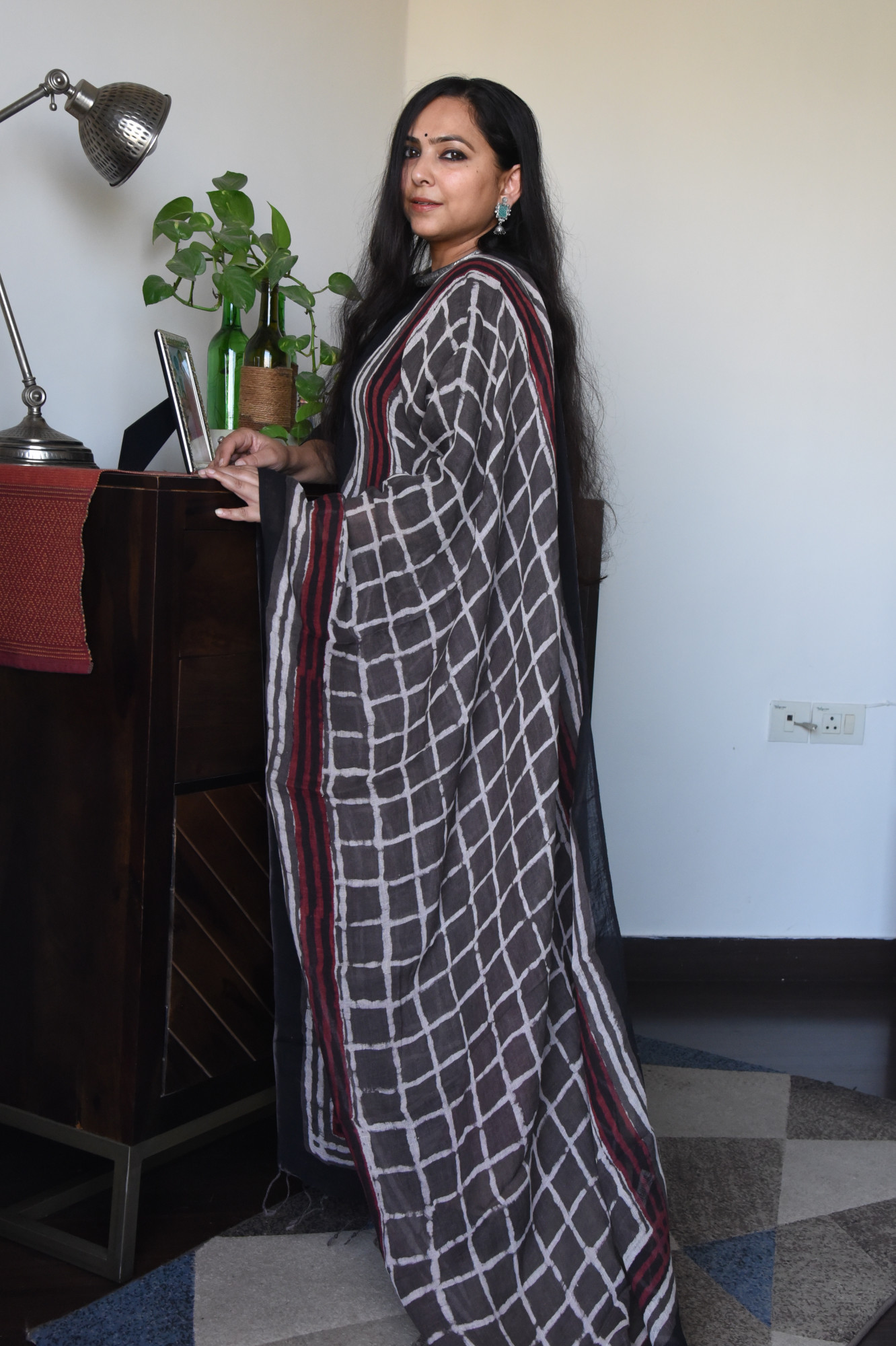 Hand block printed Linen dupatta in light grey with red and black. Accessorised with self tassles.