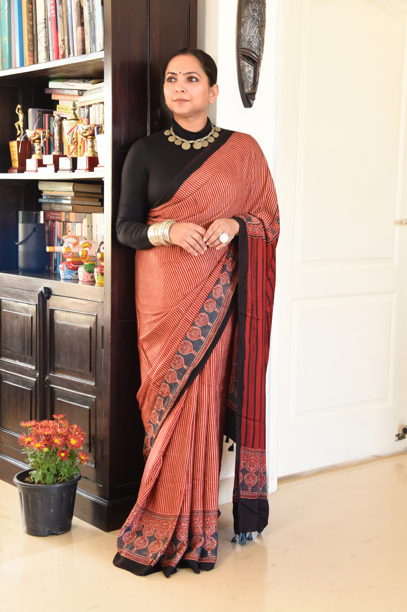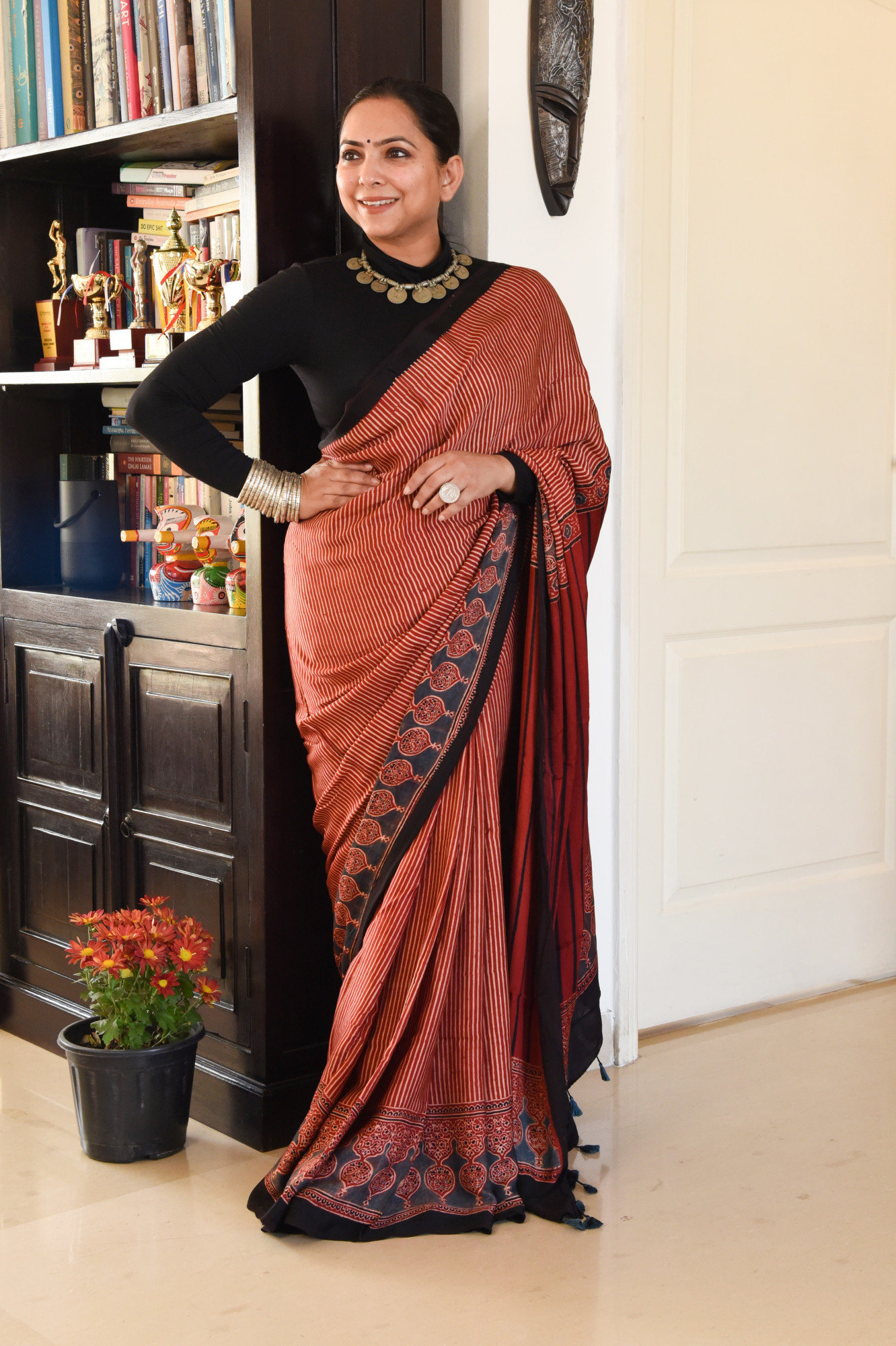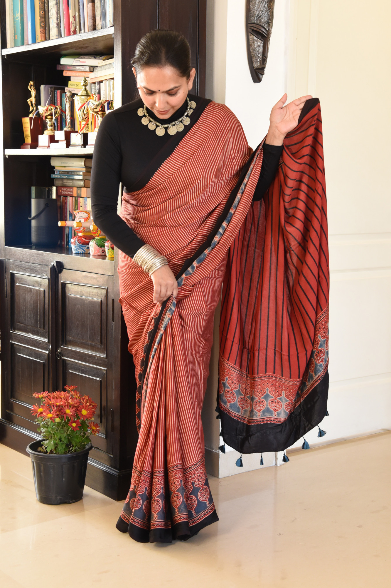 Handcrafted - Hand block printed with environment friendly natural dyes, modal silk saree with symmetrical geometric patterns, symbolising elements in nature and inspired by Persian art . A beautiful ornamental pattern on the palla is sure to take your breath away. Accessorised with tassles.