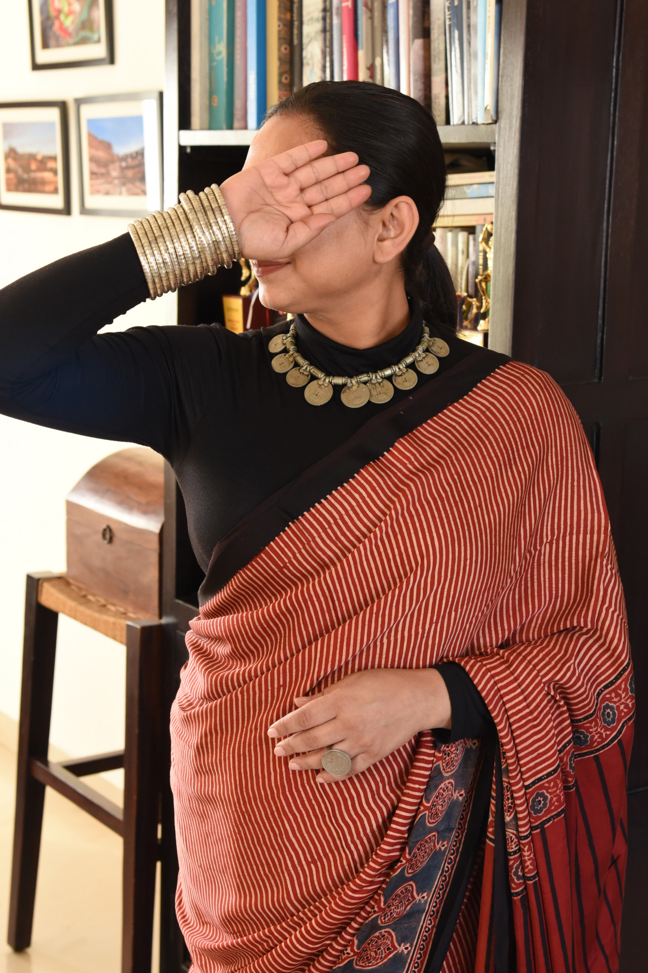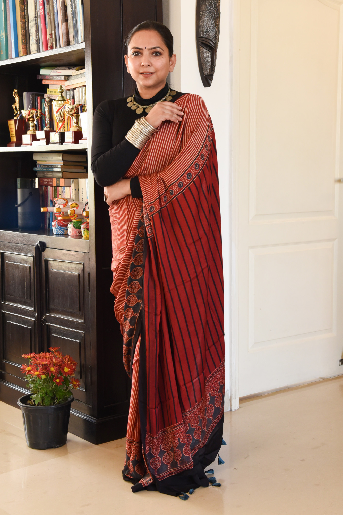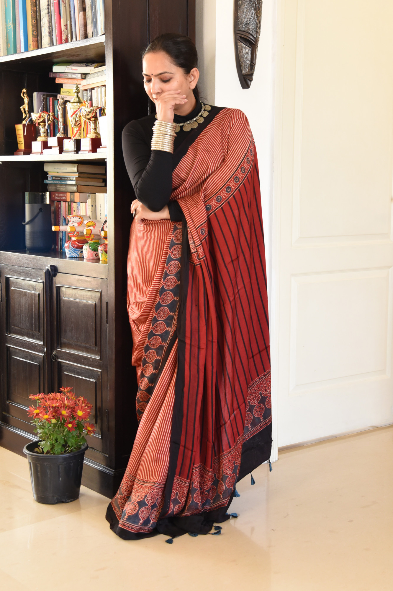 Handcrafted - Hand block printed with environment friendly natural dyes, modal silk saree with symmetrical geometric patterns, symbolising elements in nature and inspired by Persian art . A beautiful ornamental pattern on the palla is sure to take your breath away. Accessorised with tassles.