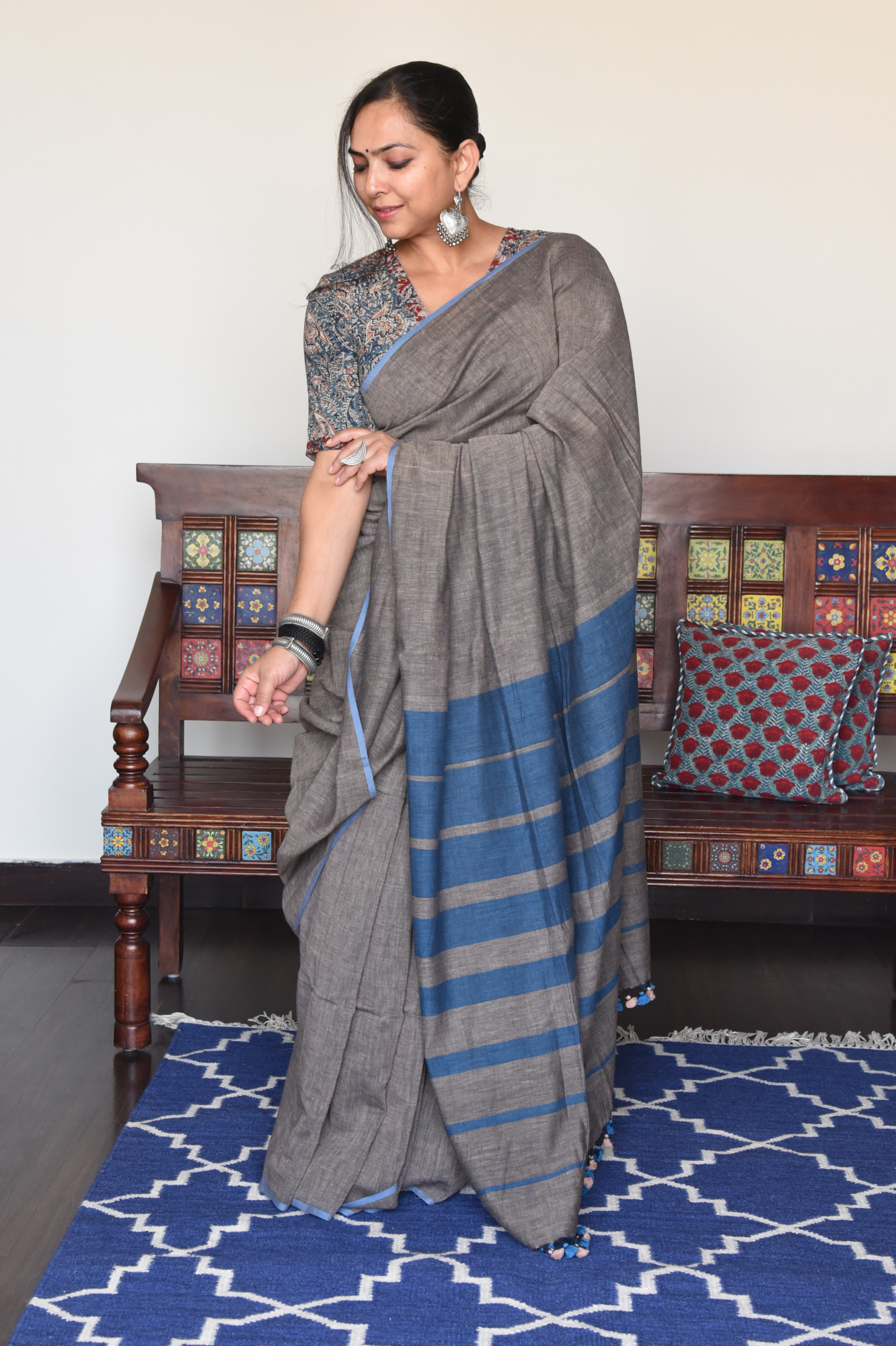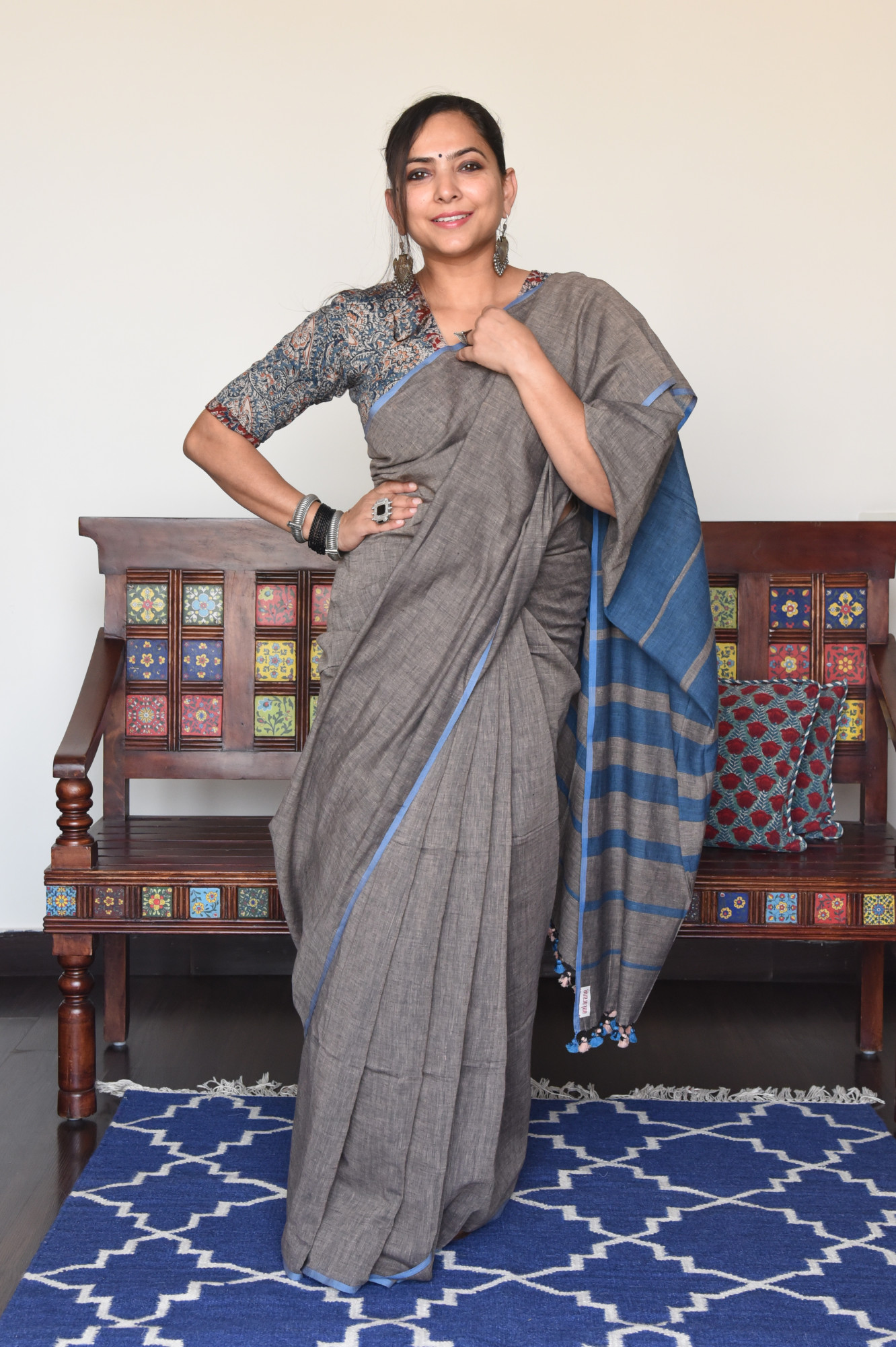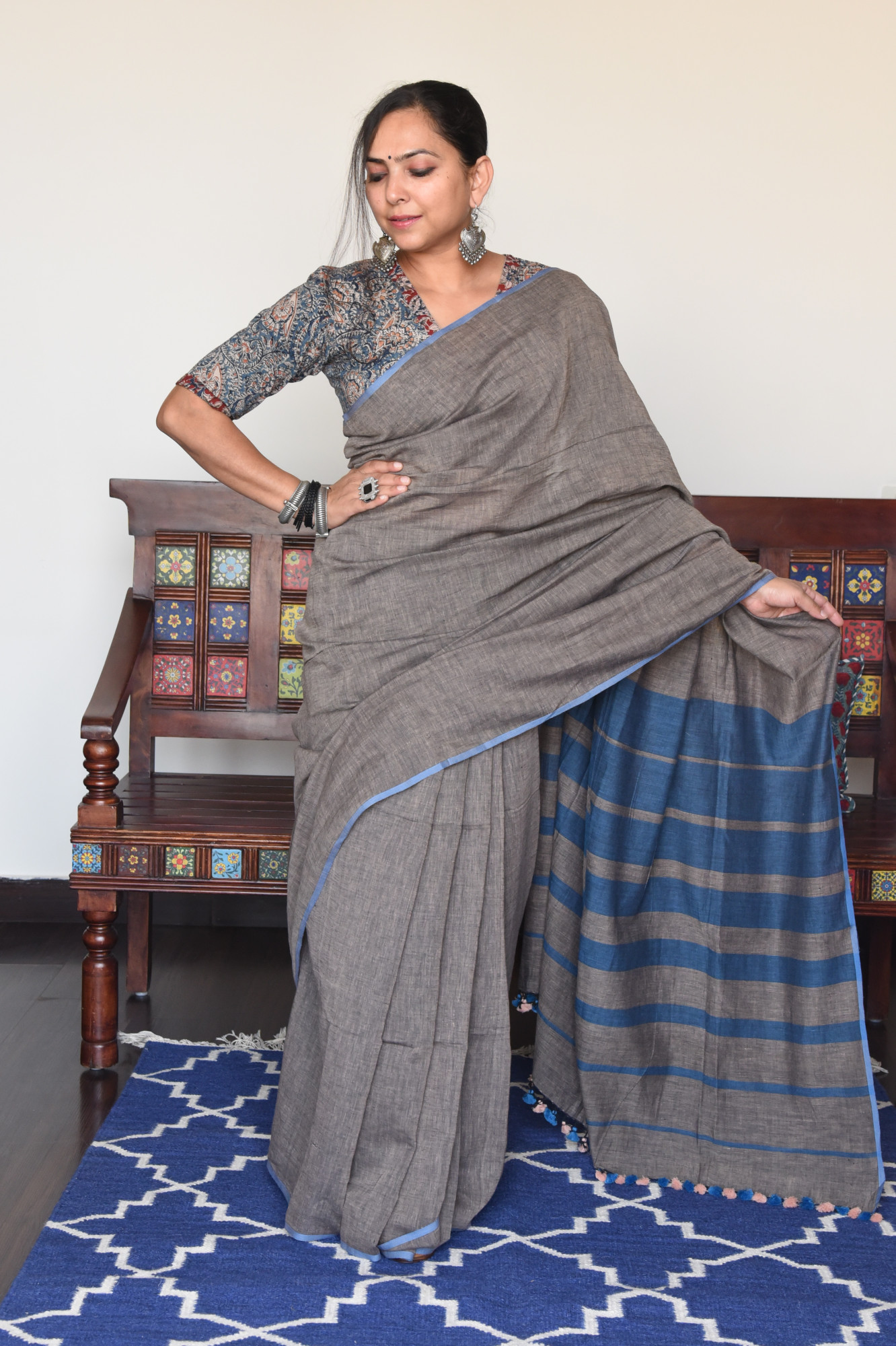 Handwoven pure ash grey Bengal cotton saree with blue striped palla.