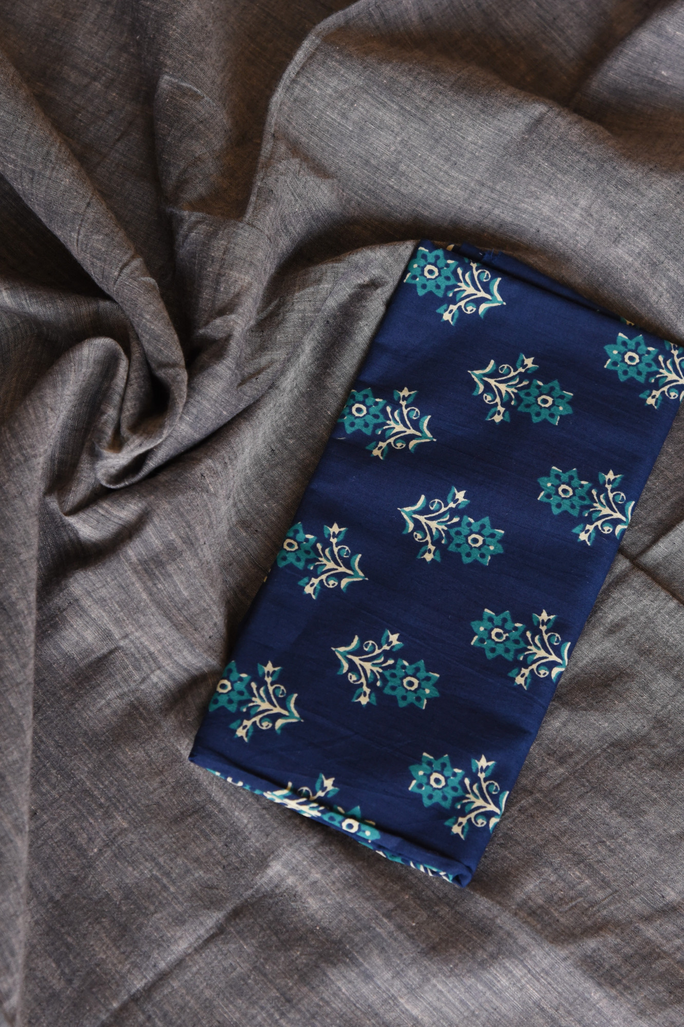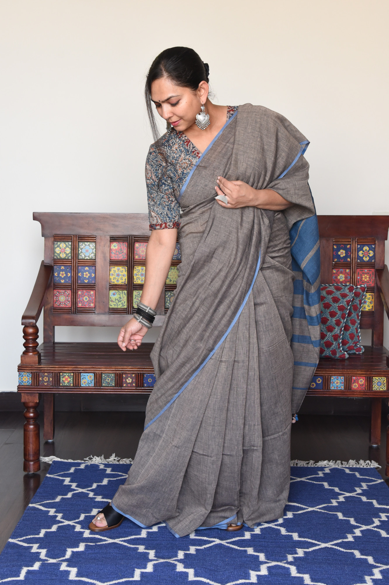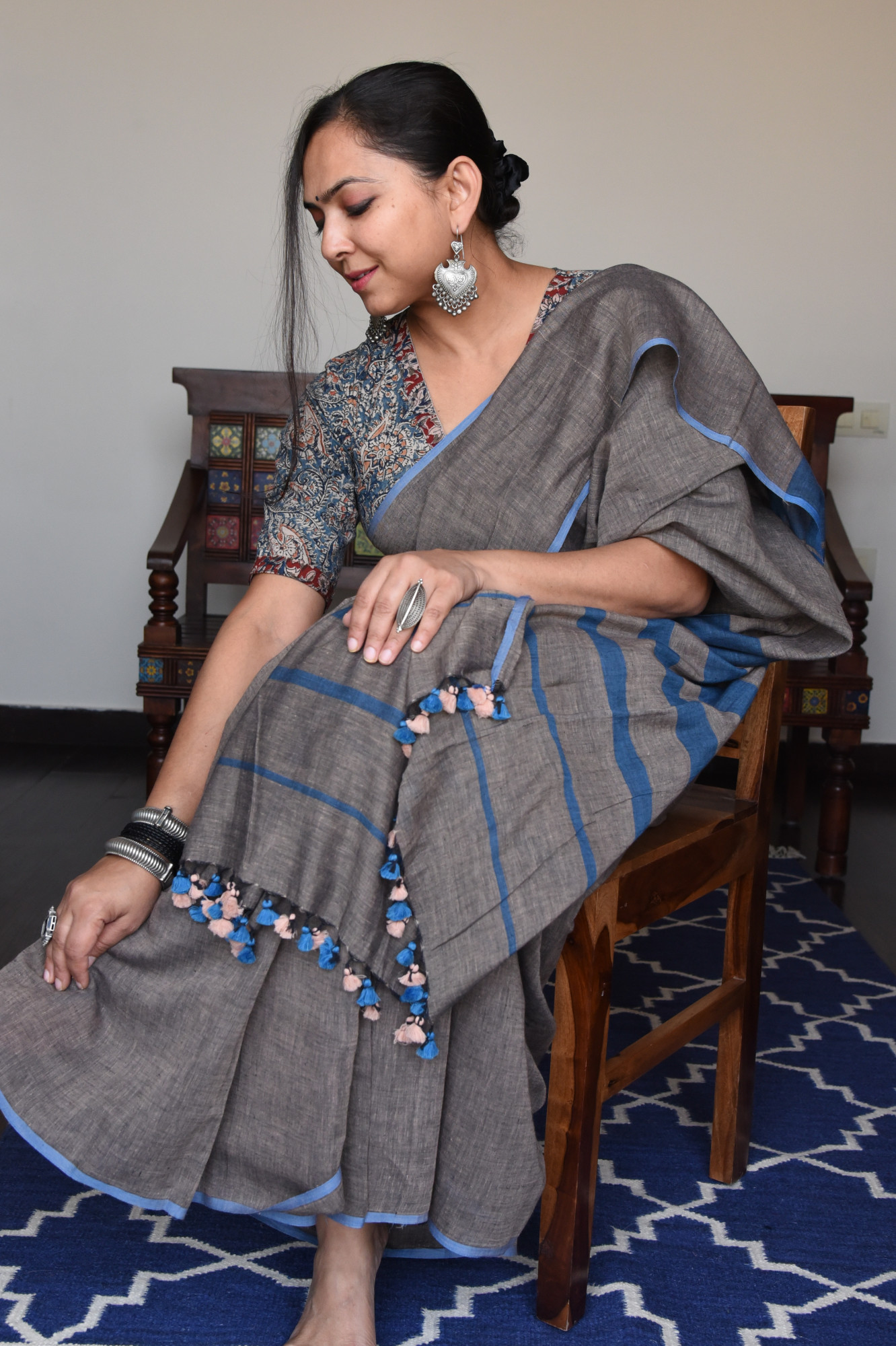 Handwoven pure ash grey Bengal cotton saree with blue striped palla.
