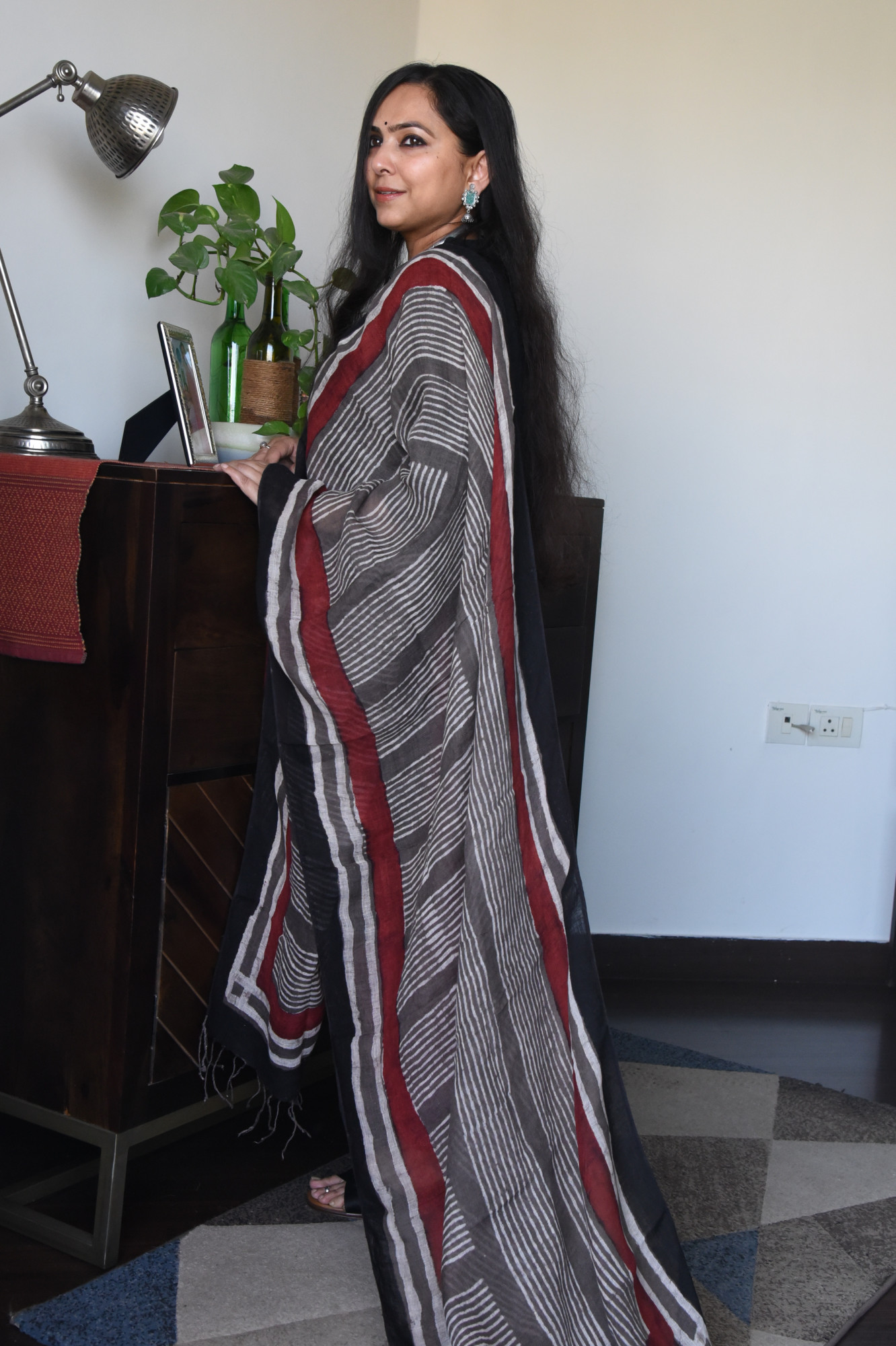 Hand block printed Linen dupatta in light grey with red and black. Accessorised with self tassles.