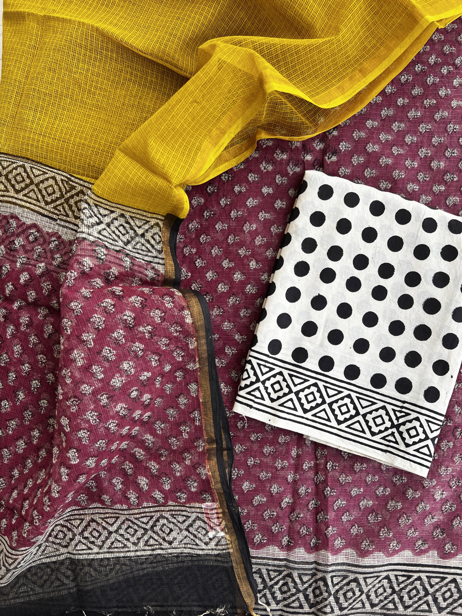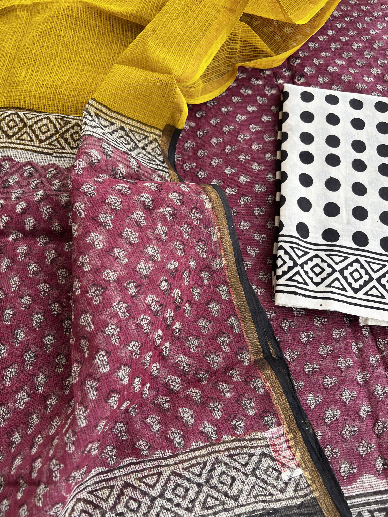 Handblock printed kota dupatta with gold zari comes with Kota kurta fabric and cotton bottom.