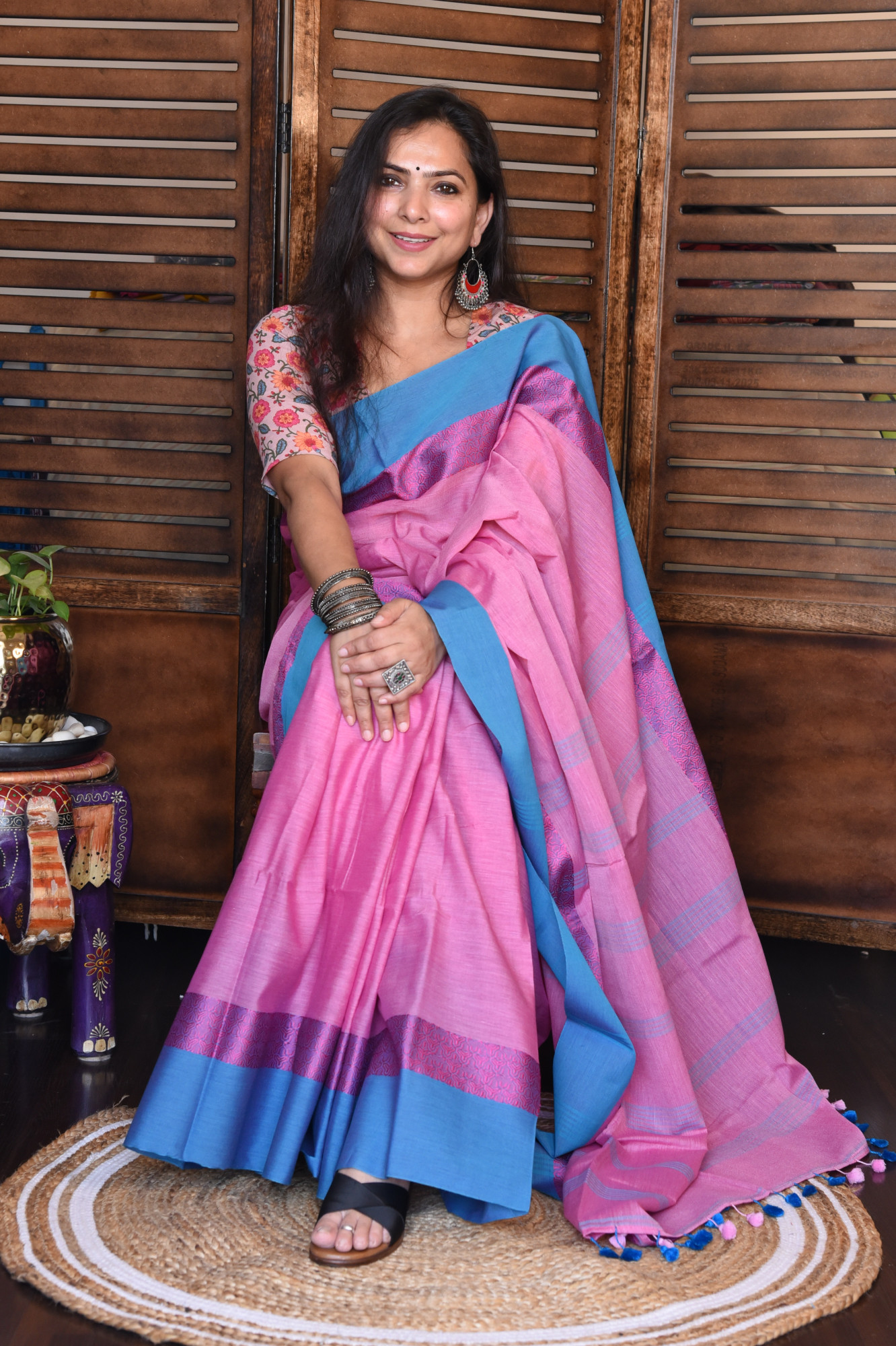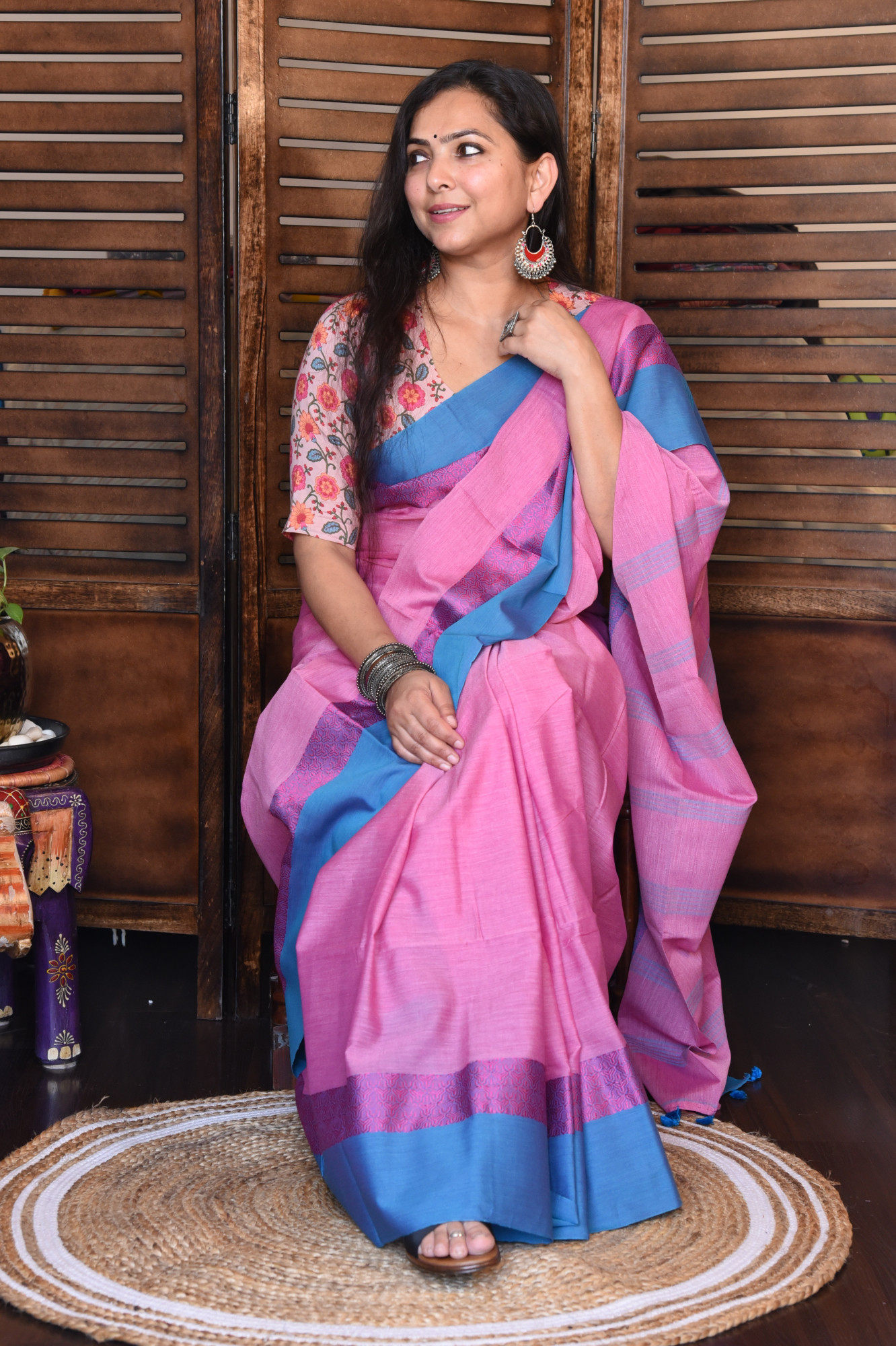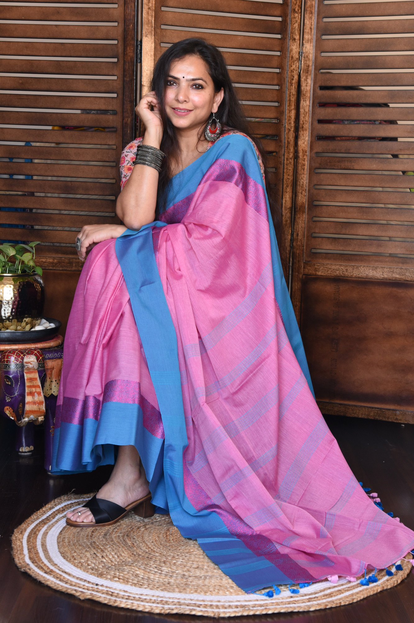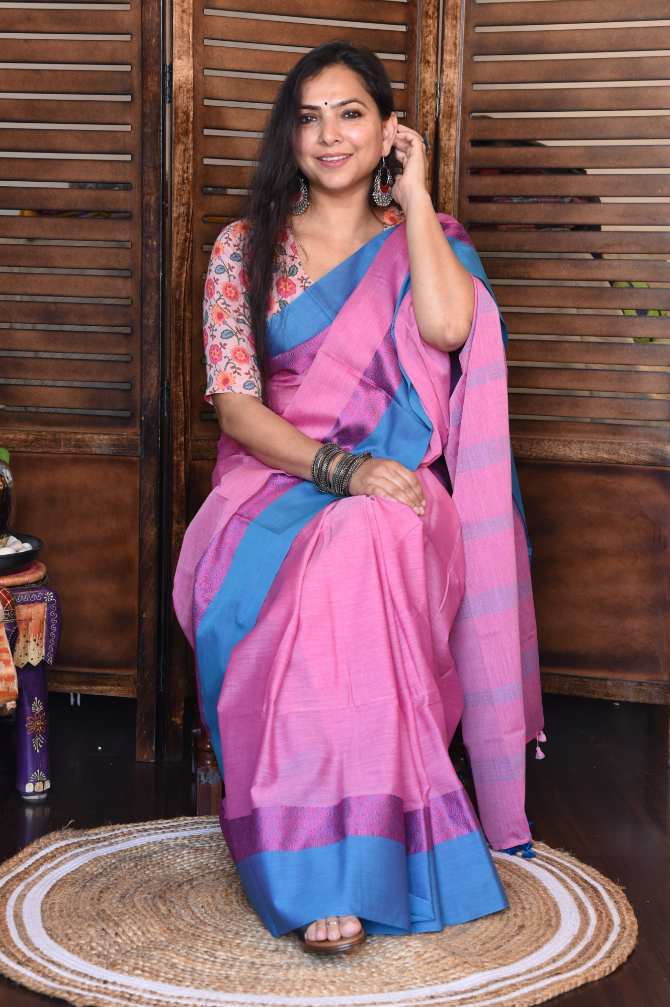 Handwoven pink Bengal cotton saree with blue border having purple resham thread work and striped palla. Accessorised with self tassles